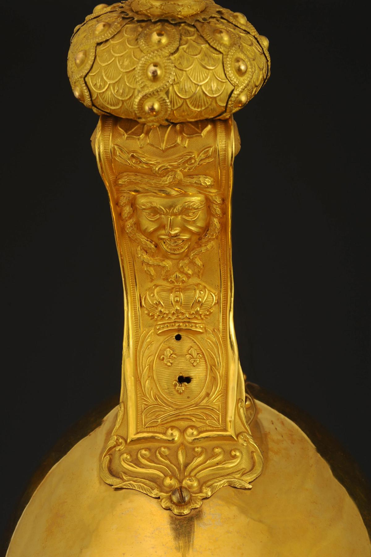Cimier est en laiton plaqué or composé de deux ailerons, d'un masque et d'une plaque de recouvrement : H maximale des ailerons 13 cm, largeur 4,4 cm, chacun d’eux est frappé d'un caisson à fond sablé dans lequel est représentée une suite de 9 godrons décroissants séparés entre eux d'une feuille d'acanthe ; ce caisson est bordé d'une moulure à fond lisse décorée en relief d'une branche de laurier sur la partie haute et d'une autre branche de laurier sur la partie basse remontant à l'avant ; cet encadrement est bordé d'une moulure torsadée. Partie supérieure des ailerons estampée de feuilles d'acanthe retombant vers le bas ; largeur du masque 4,4 cm ; dans le haut, une tête de méduse estampée en relief, dans la partie basse une large palmette encadrée de feuille d'acanthe. Partie centrale du masque estampée en relief des Armes de France entourées de deux palmes et surmontées de la couronne royale. Masque et cimier fixés à la bombe au moyen de neuf vis plaquées or à tête ronde. Plaque de recouvrement garnissant le dessus du cimier estampée en relief en imitant une crinière nattée.
