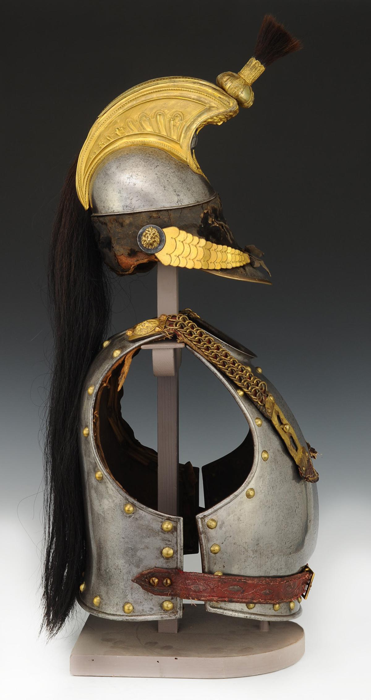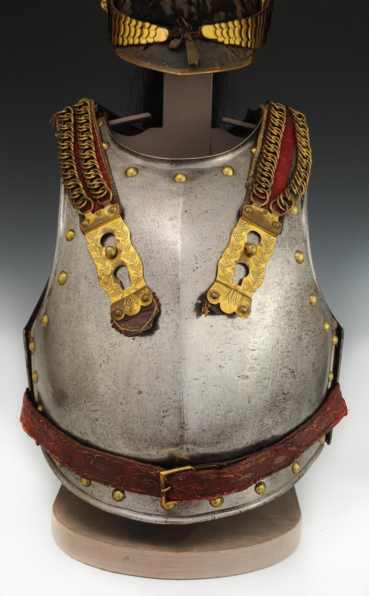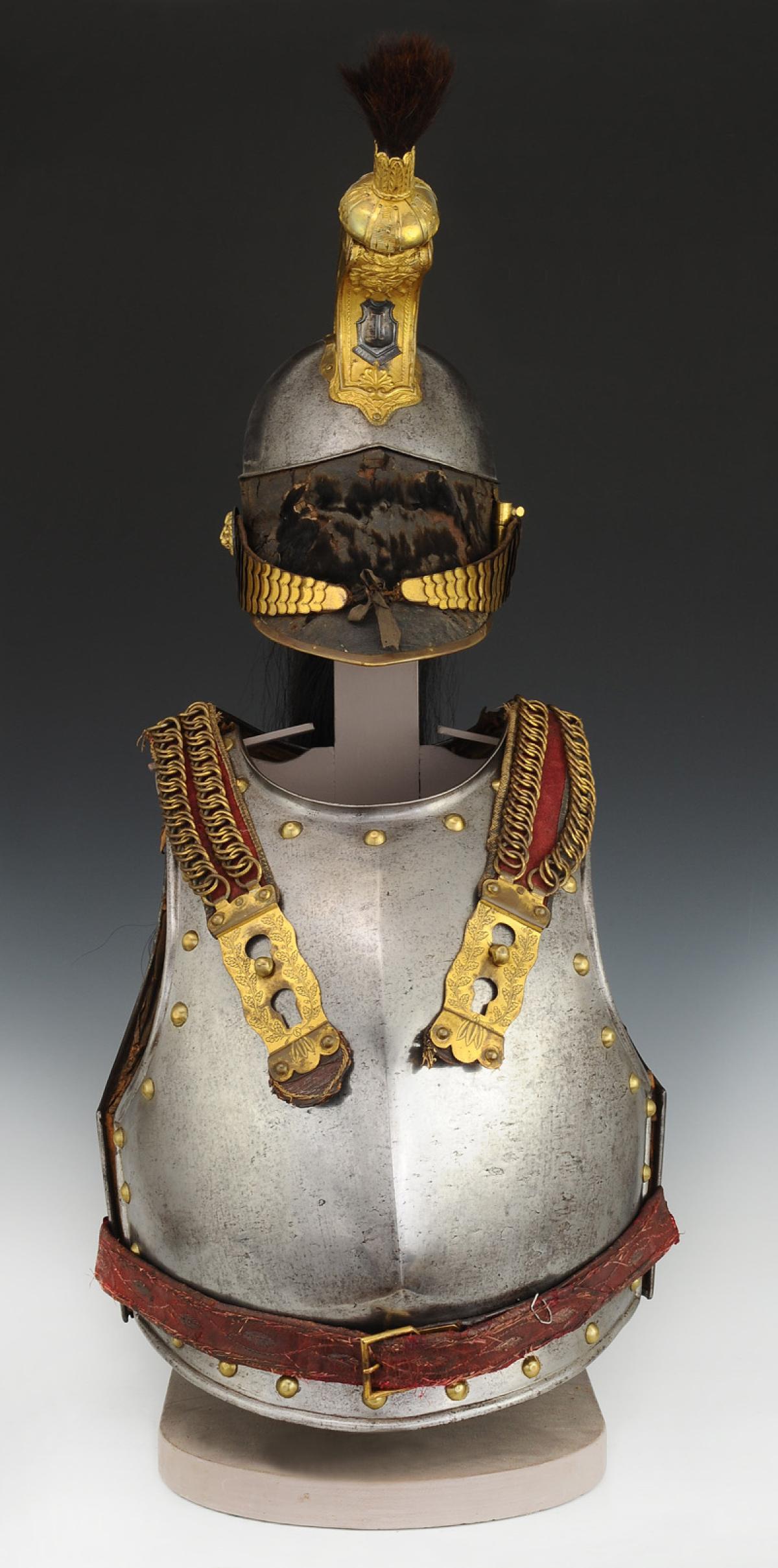 Les armures de cuirassiers du Premier Empire sont de grande rareté et sont très représentatives des charges et batailles de l'époque napoléonienne. L'ensemble présenté aujourd'hui est homogène. Le casque à bombe d'acier est réservé pour les officiers pour le temps de guerre et le combat. Nous en connaissons peu d'exemplaires, moins de cinq dans le monde, contrairement aux casques classiques avec bombe en argent ou en cuivre argenté dont nous connaissons plusieurs dizaines d'exemplaires. Ce casque a une bombe « à la minerve » typique des officiers et non employée par la troupe.