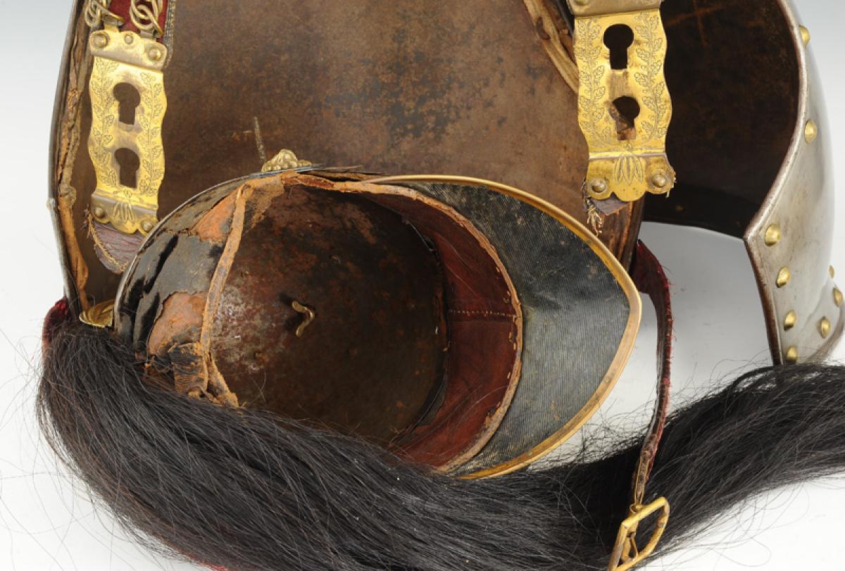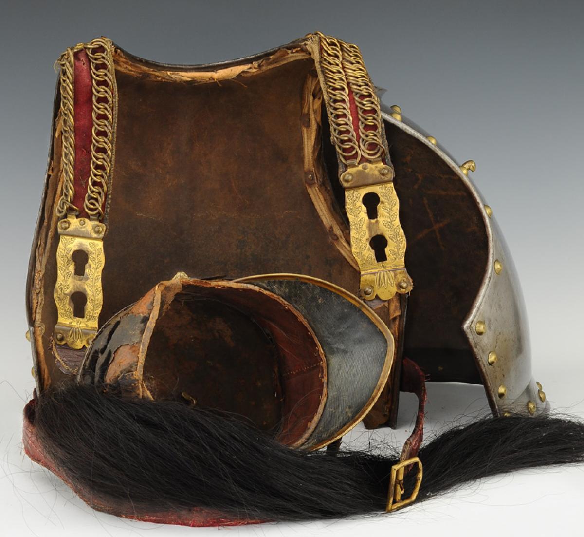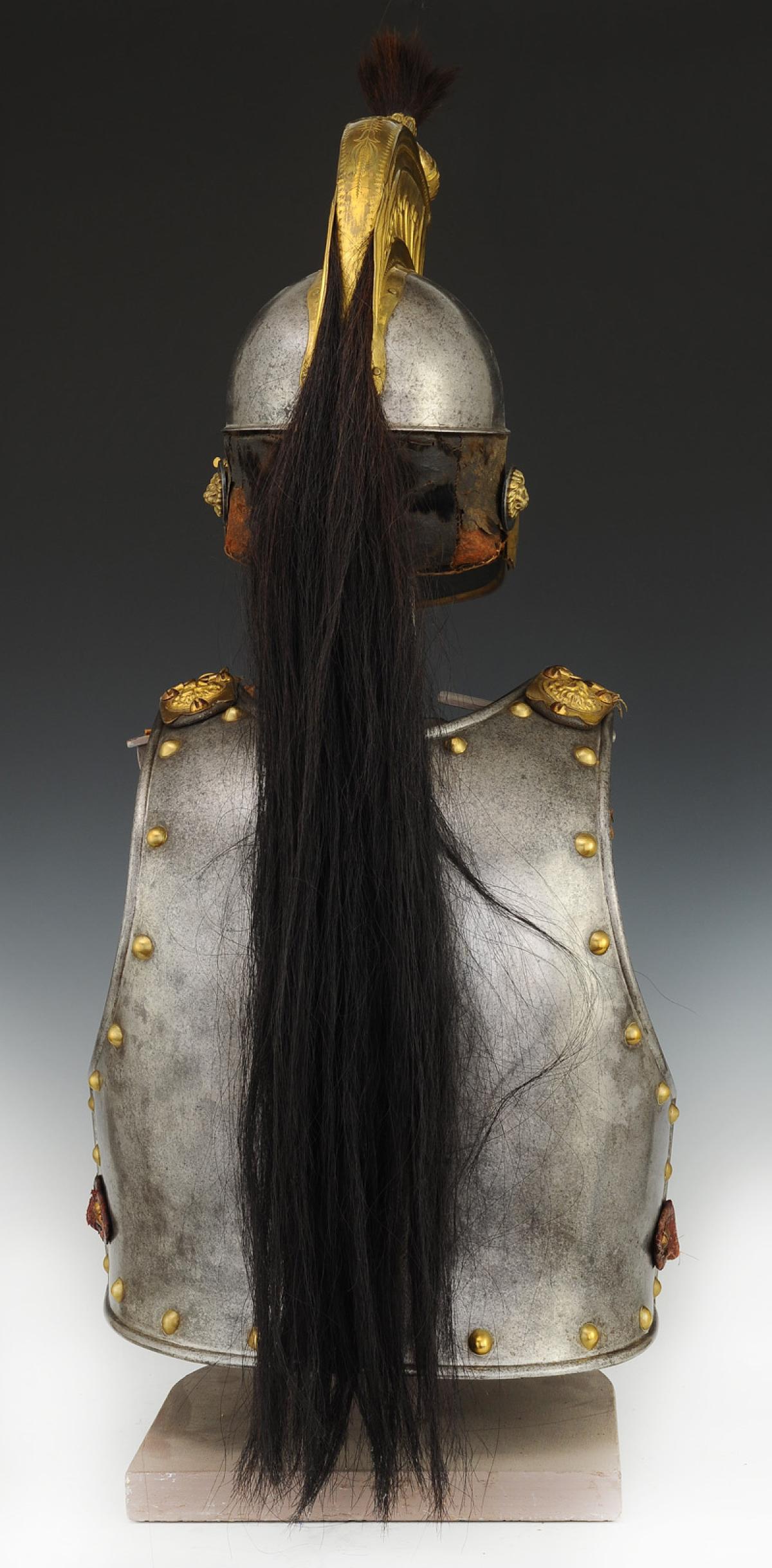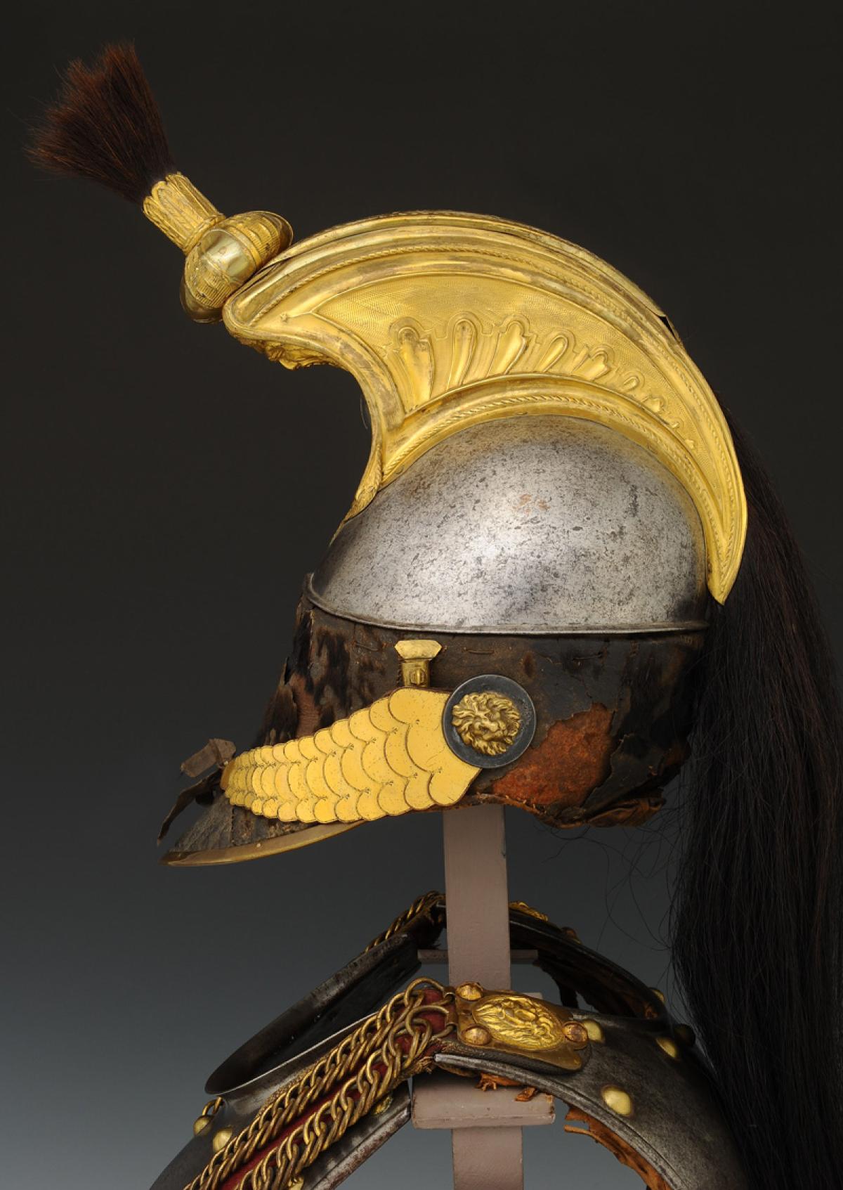 Les armures de cuirassiers du Premier Empire sont de grande rareté et sont très représentatives des charges et batailles de l'époque napoléonienne. L'ensemble présenté aujourd'hui est homogène. Le casque à bombe d'acier est réservé pour les officiers pour le temps de guerre et le combat. Nous en connaissons peu d'exemplaires, moins de cinq dans le monde, contrairement aux casques classiques avec bombe en argent ou en cuivre argenté dont nous connaissons plusieurs dizaines d'exemplaires. Ce casque a une bombe « à la minerve » typique des officiers et non employée par la troupe.