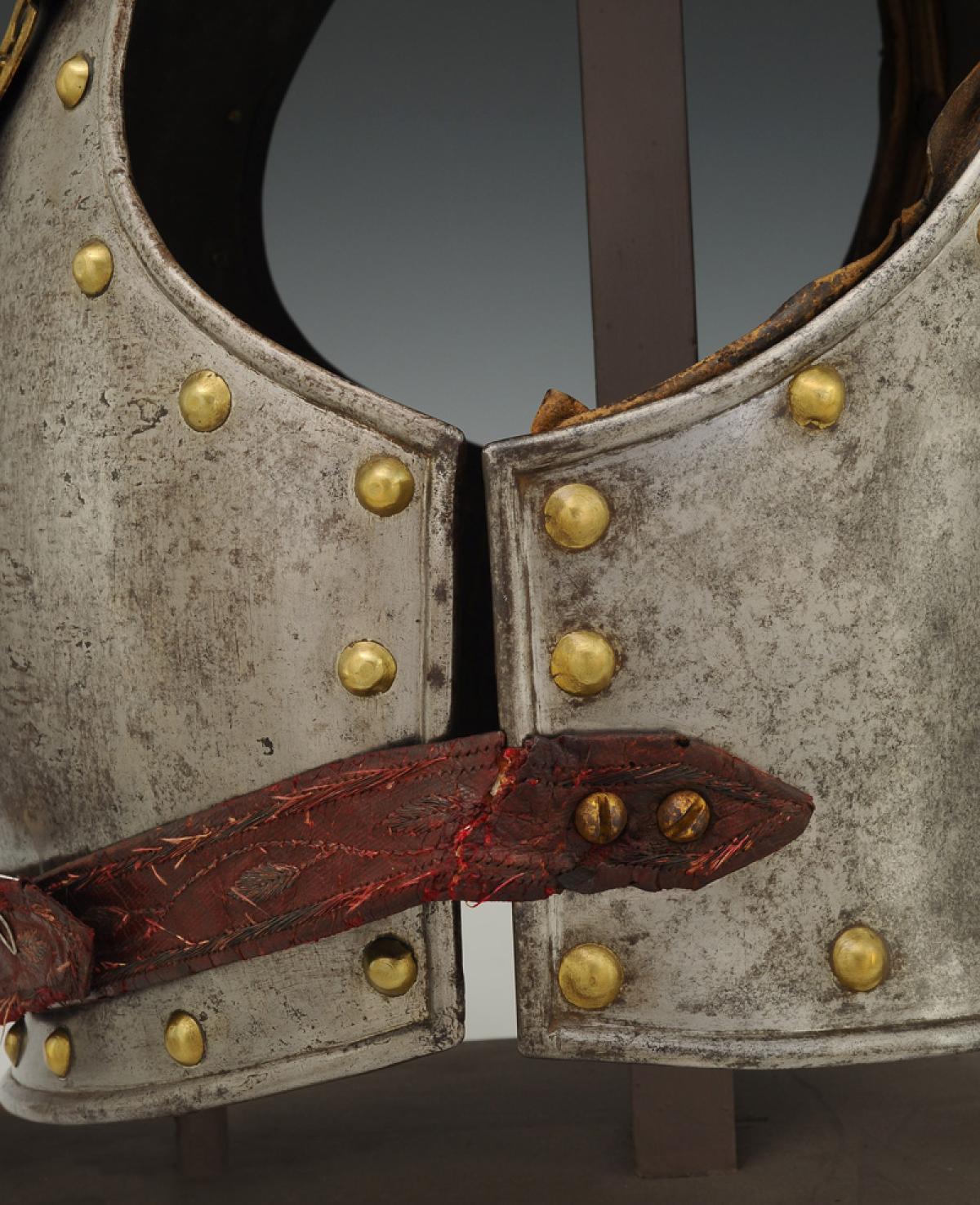 Bordé de 34 clous en laiton. Deux clous supplémentaires sont rivetés au niveau de la poitrine pour y attacher les épaulières de la dossière. Plastron bordé d'un jonc arrondi, sauf au niveau du cou où le jonc est saillant.