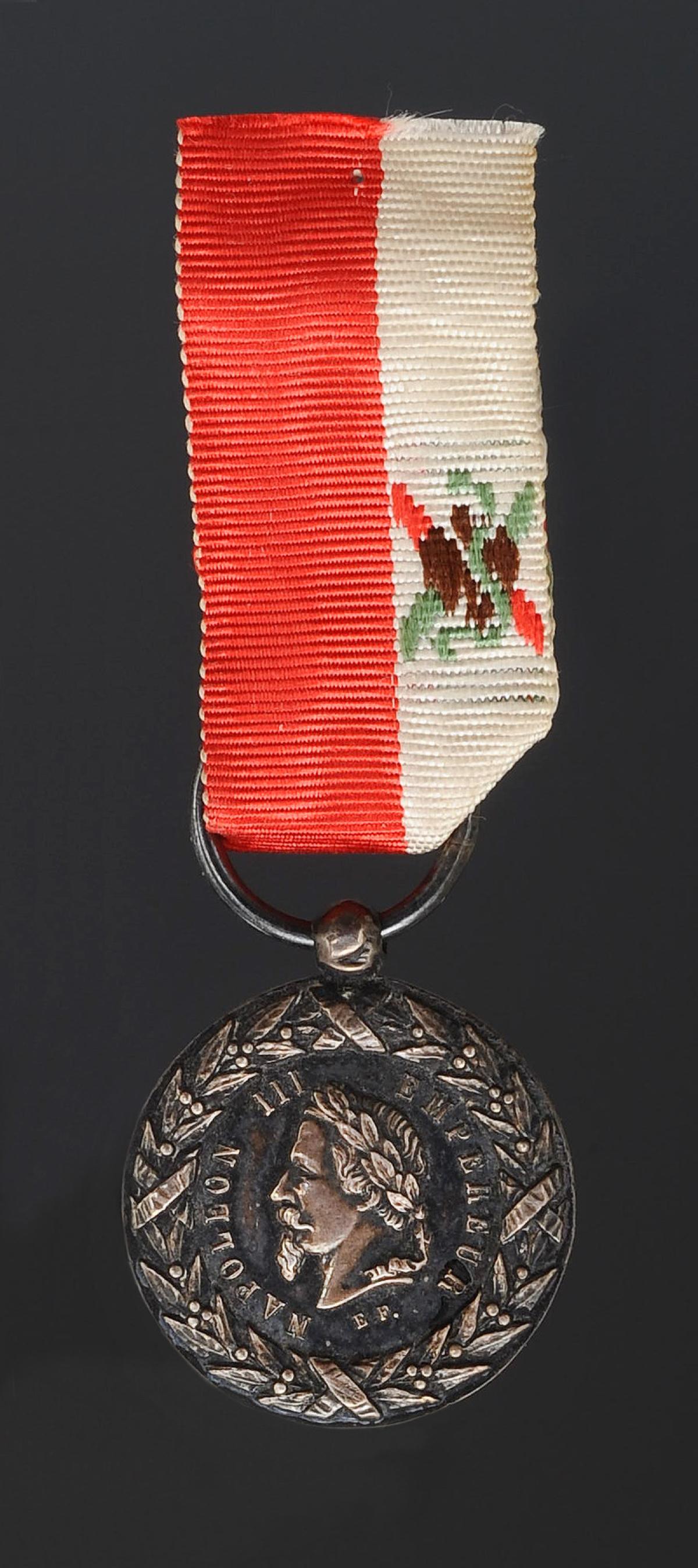 De forme ronde, en argent, signée « E.F. », représentant sur l'avers l’effigie de l’Empereur couronné de laurier, encadrée de la légende « NAPOLEON III EMPEREUR » et bordée d’une couronne de laurier. Sur le revers, inscription « CAMPAGNE D’ITALIE - 1859 » encadrant le nom des batailles de « MONTEBELLO, PALESTRO, TURBIGO, MAGENTA, MARIGNAN, SOLFERINO ». Diamètre 2 cm.