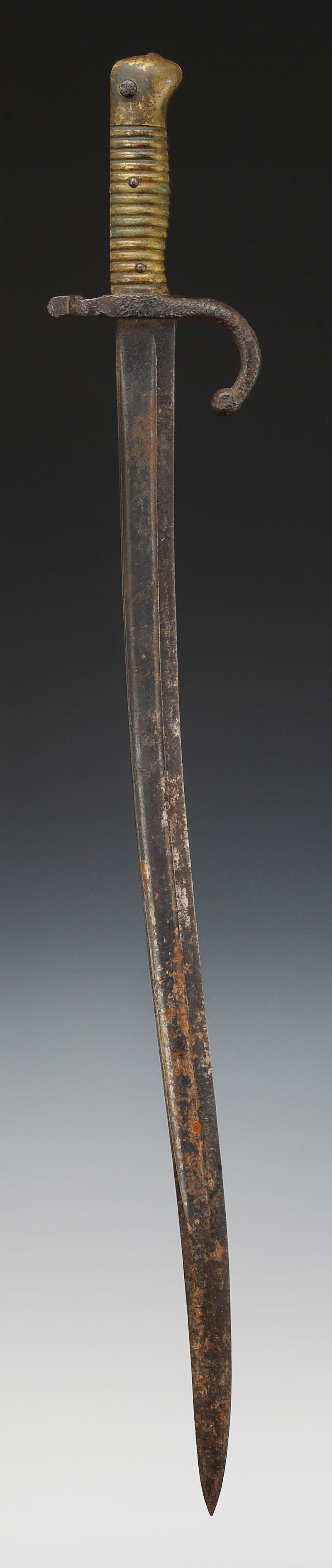 Sabre baïonnette Chassepot, modèle 1866, poignée en laiton cannelé à 15 cordons. Lame à double courbure dite « Yatagan » à dos plat signée et datée « 1867 », longueur 57,5 cm.