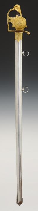 Garde en bronze doré et ciselé. Monture à trois branches formant coquille fondue en relief d'un blason aux trois fleurs de lys surmontées de la couronne royale et encadrées d'une branche de chêne et d'une branche de laurier, le tout surmontant le fuseau de Jupiter étincelant. Calotte à longue queue moulée en relief de rinceaux et corolles de feuillages. Poignée en bois recouvert de veau filigrané cuivre. Lame droite à gouttières, longueur 93,1 cm, gravée et dorée sur son premier tiers de trophées militaires, décors floraux et couronnes de laurier. À sa base, un cartouche est signé « S & K » fourbisseur. Cravate en drap écarlate. Fourreau droit en acier, sans bracelets de bélière, pitons et anneaux de bélières en acier, chape en laiton doré gravée de feuillages.