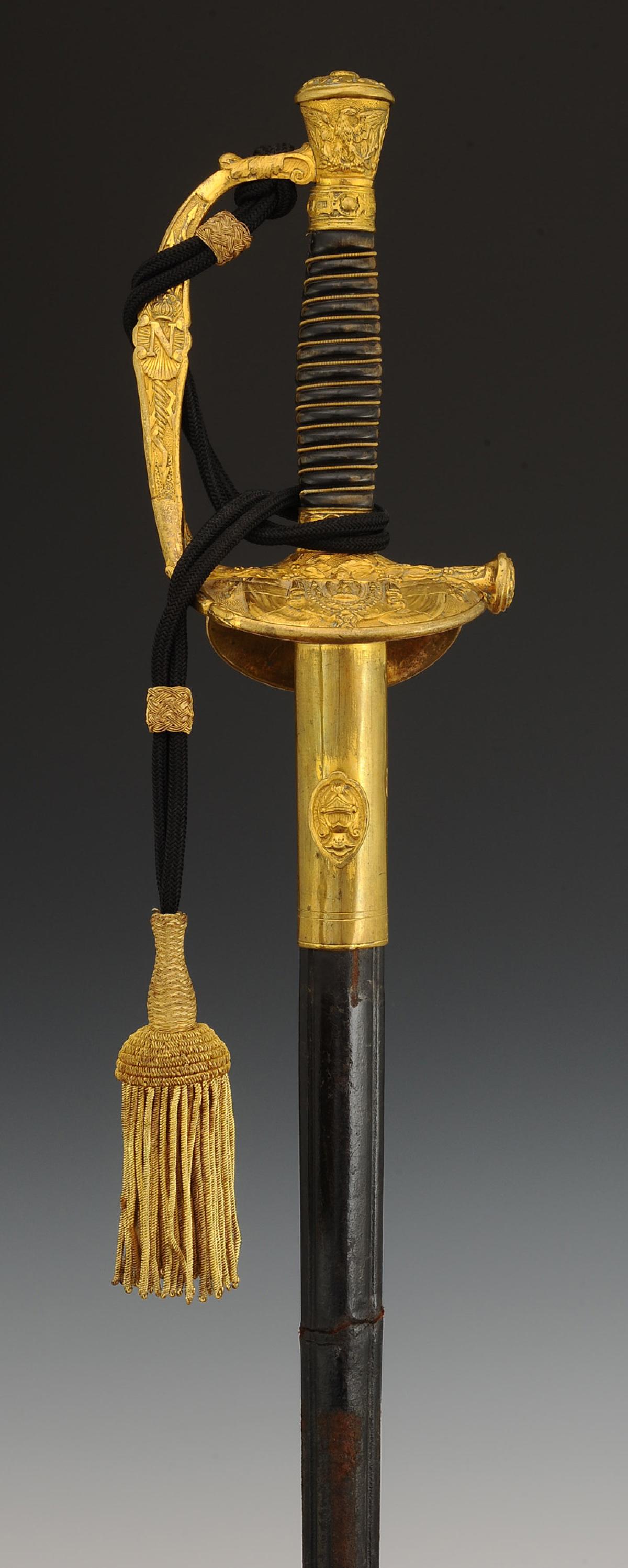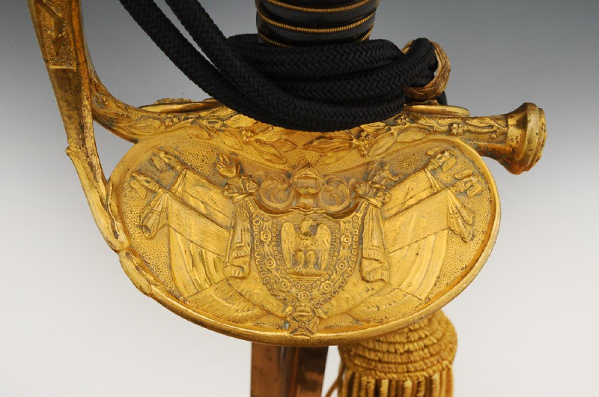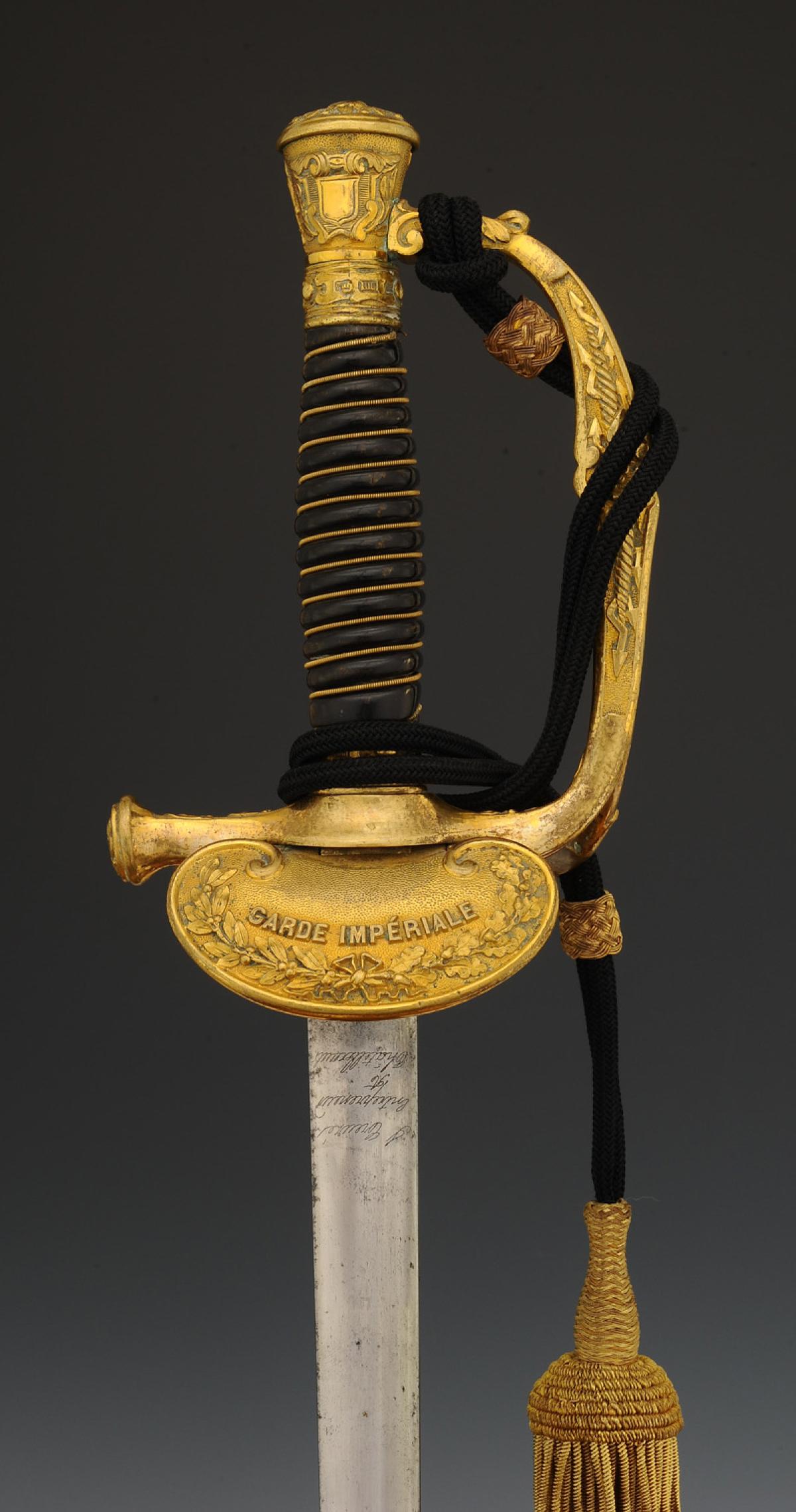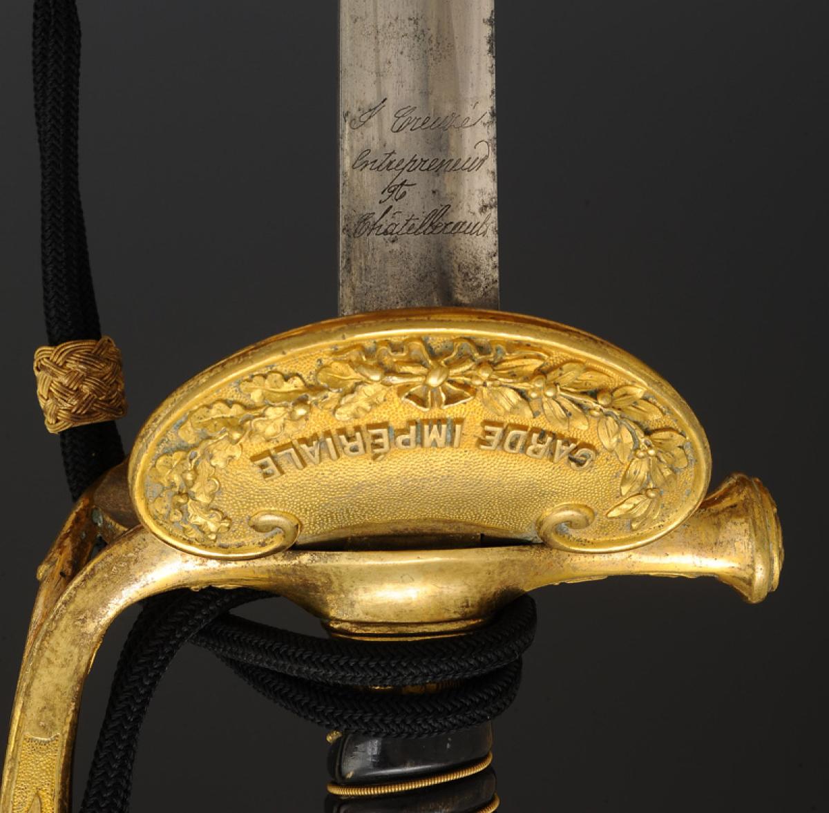 Monture en bronze doré. Garde décorée d'une N sous couronne impériale posée sur fond rayonnant avec fuseau de Jupiter étincelant. Clavier formant un plateau moulé en relief des Grandes Armes Impériales, quillon décoré d'une palmette, clavier arrière ployant portant en relief l'inscription « GARDE IMPÉRIALE » posée sur une branche de chêne et une de laurier. Pommeau décoré de l'aigle impériale aux ailes déployées. Fusée en corne, filigrane laiton. Forte lame triangulaire blanche, gravée au talon « Creuzé Entrepreneur à Châtellerault », longueur 80,2 cm. Cravate en drap écarlate. Fourreau en cuir verni noir à deux garnitures de laiton décorées aux traits.