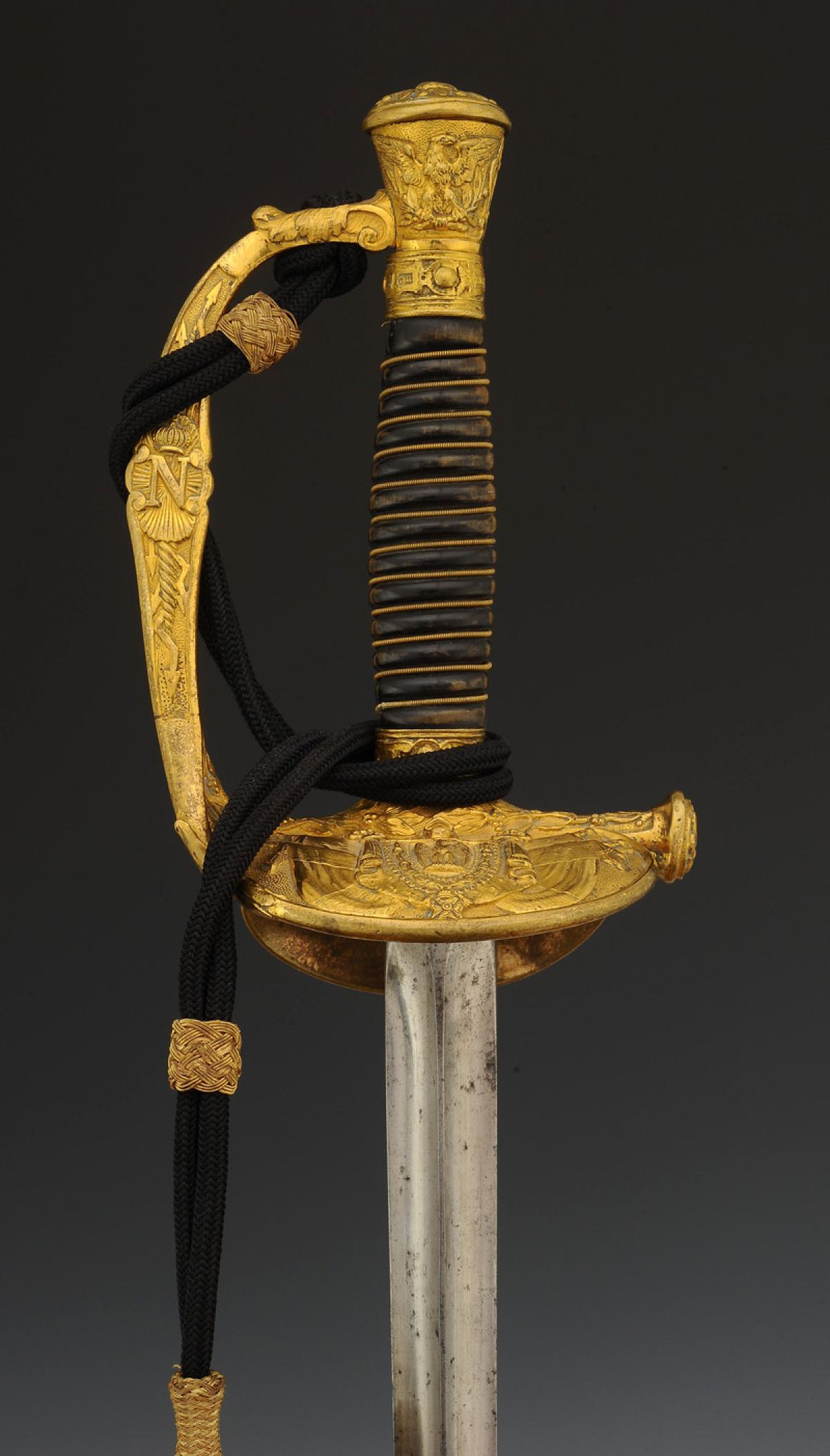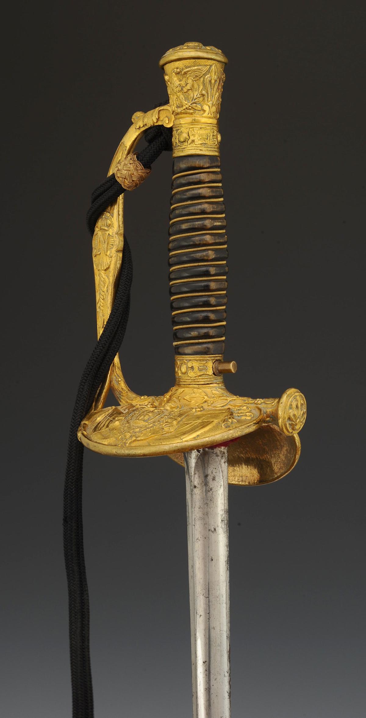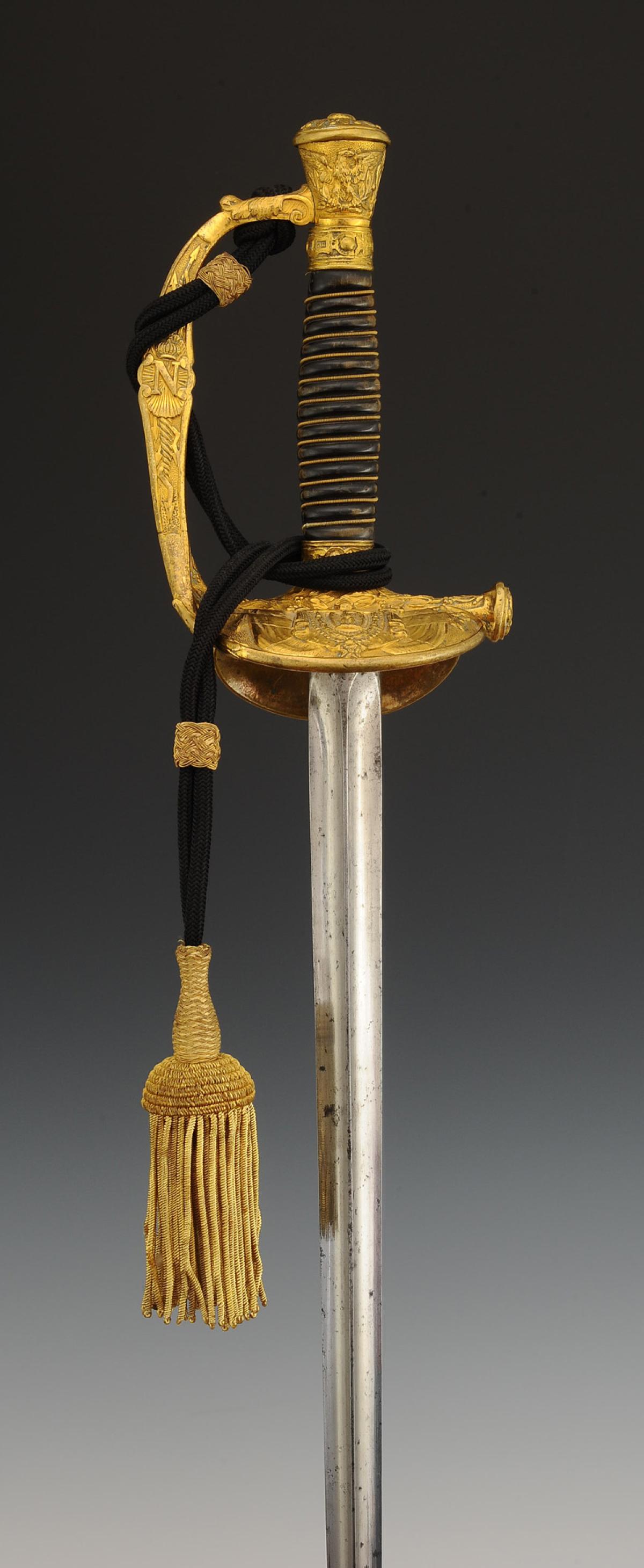Monture en bronze doré. Garde décorée d'une N sous couronne impériale posée sur fond rayonnant avec fuseau de Jupiter étincelant. Clavier formant un plateau moulé en relief des Grandes Armes Impériales, quillon décoré d'une palmette, clavier arrière ployant portant en relief l'inscription « GARDE IMPÉRIALE » posée sur une branche de chêne et une de laurier. Pommeau décoré de l'aigle impériale aux ailes déployées. Fusée en corne, filigrane laiton. Forte lame triangulaire blanche, gravée au talon « Creuzé Entrepreneur à Châtellerault », longueur 80,2 cm. Cravate en drap écarlate. Fourreau en cuir verni noir à deux garnitures de laiton décorées aux traits.