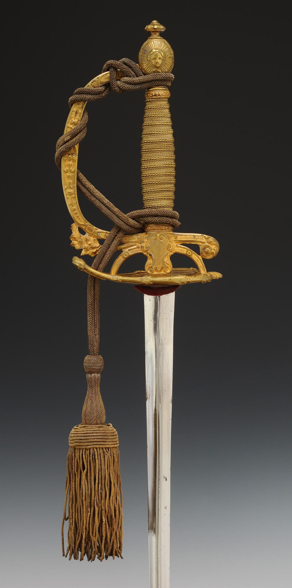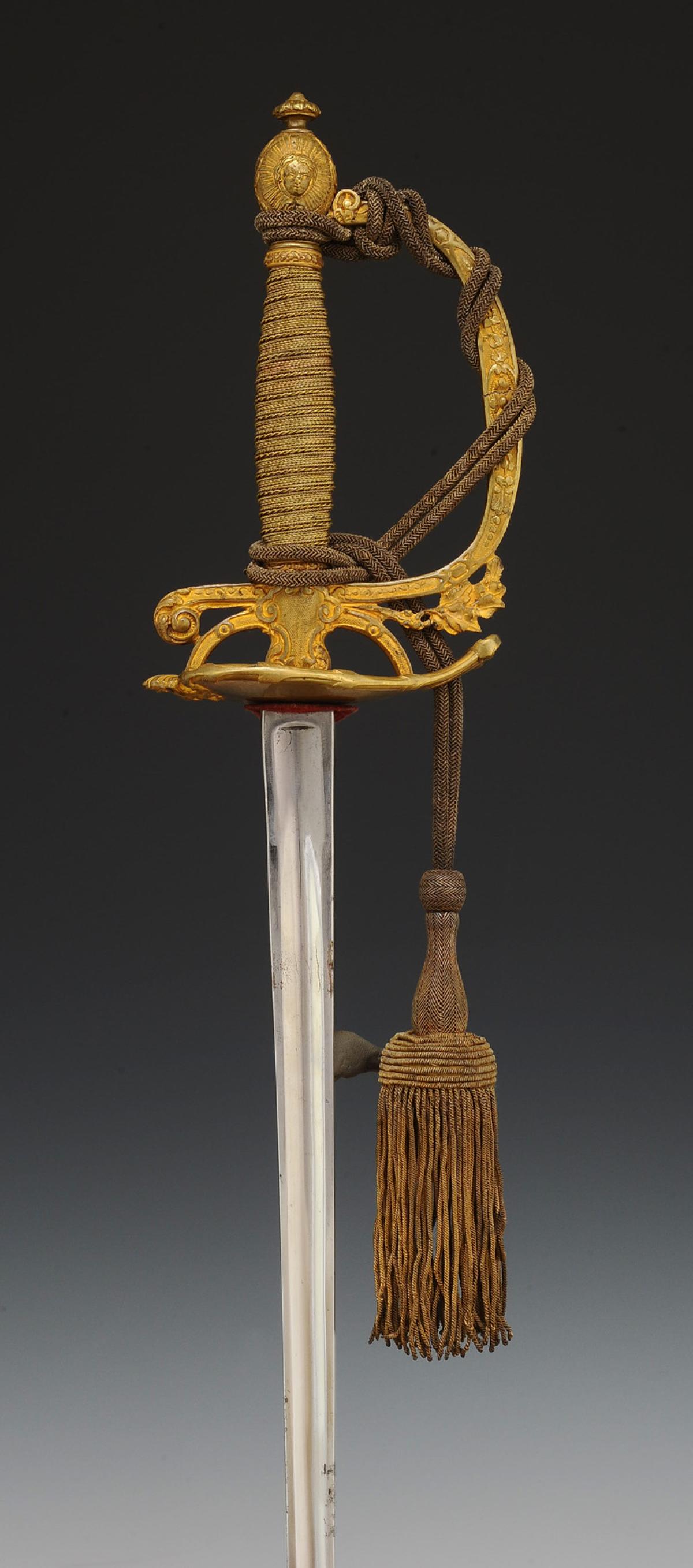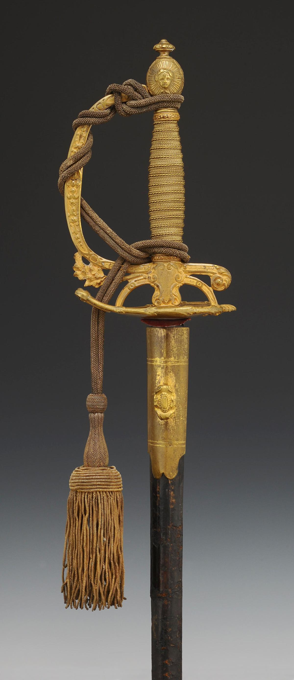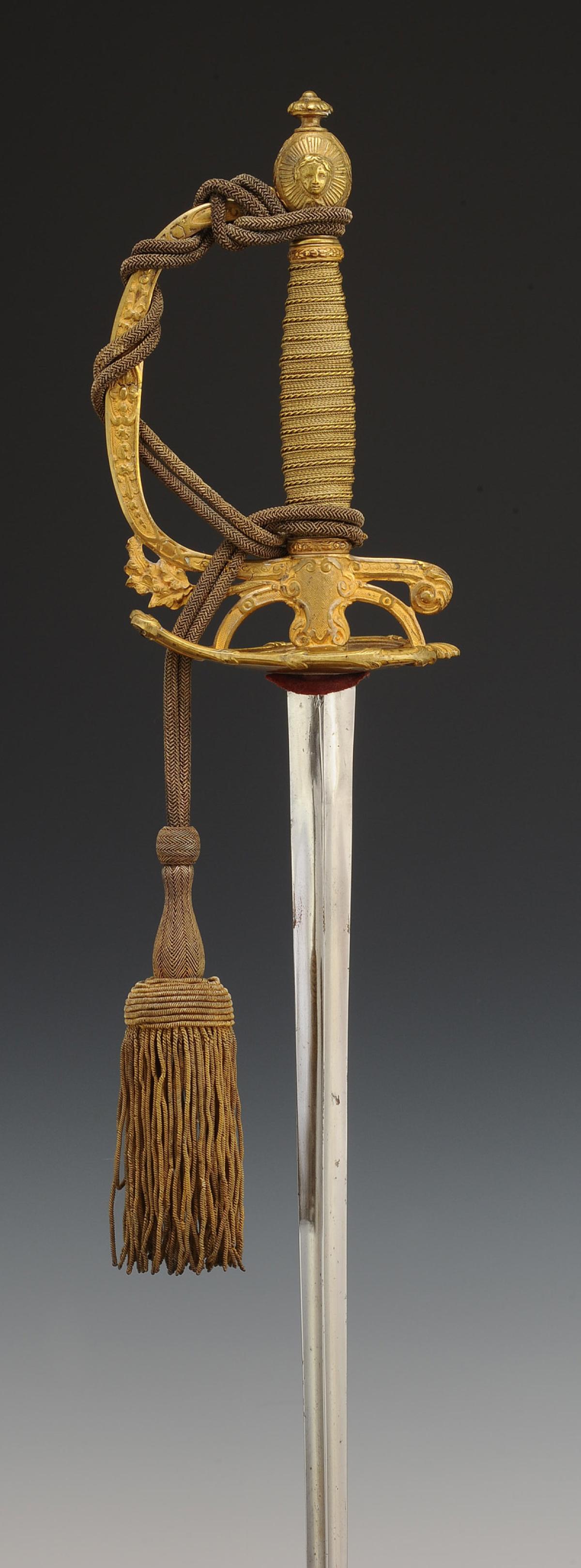Monture en bronze doré. Garde à une branche à décor de feuillages. Croisière à annelets. Clavier bivalve uni avec quillon en coquille Saint Jacques et moulure d'encadrement avec feuilles d'acanthe. Pommeau rond décoré du visage du soleil sur fond rayonnant. Fusée en bois entièrement filigrané de laiton doré. Lame triangulaire blanche, longueur 78 cm. Cravate en laine écarlate. Fourreau en cuir verni noir à deux garnitures de laiton doré décorées aux traits et de feuillages, aux bords festonnés.
