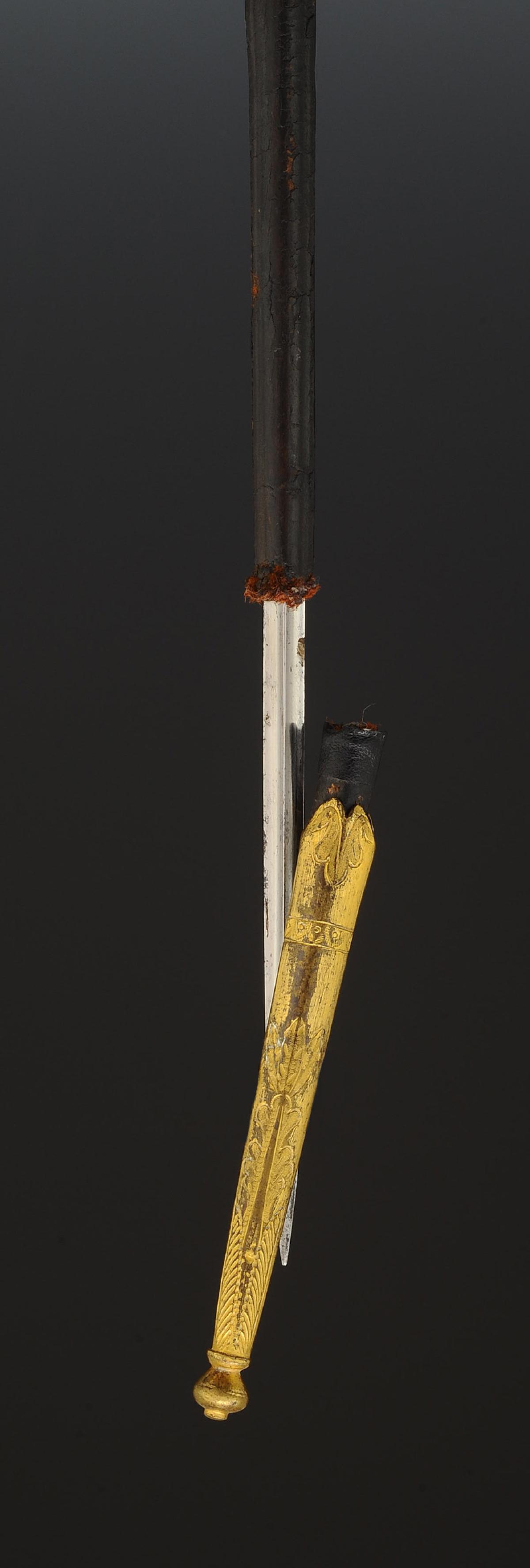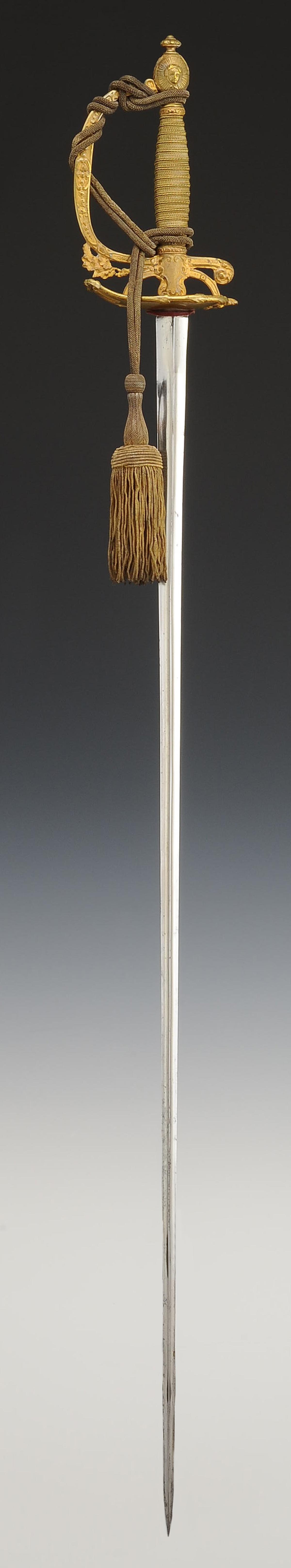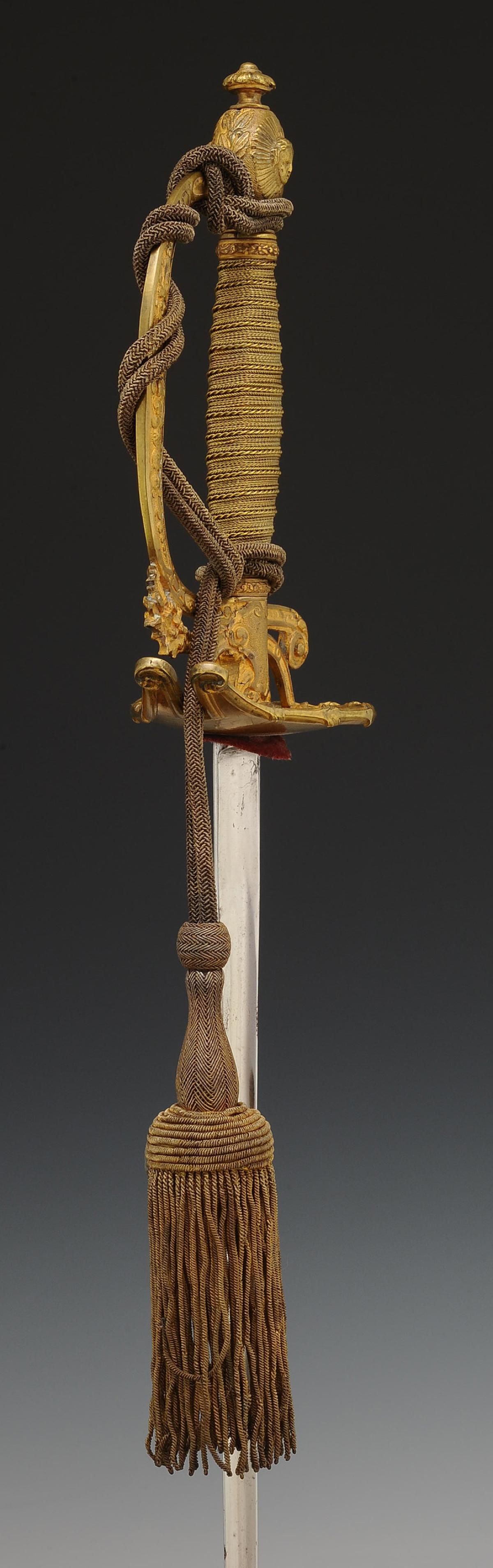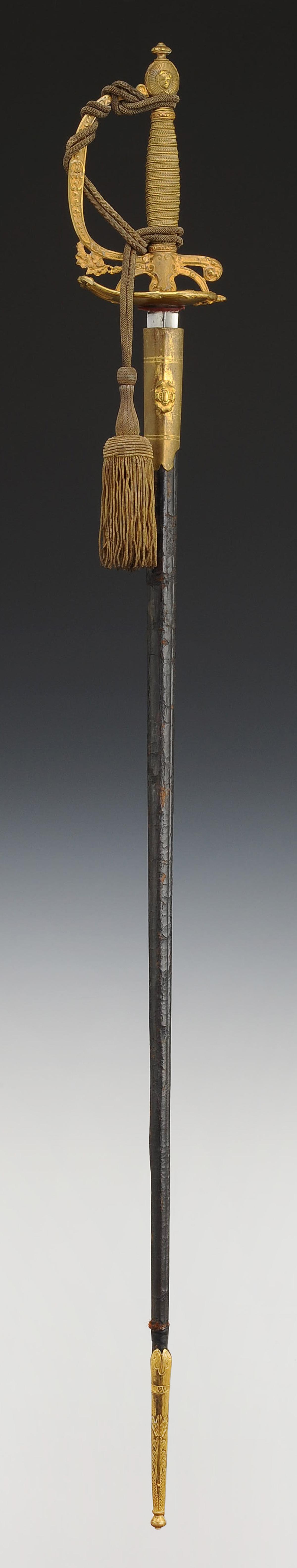 Monture en bronze doré. Garde à une branche à décor de feuillages. Croisière à annelets. Clavier bivalve uni avec quillon en coquille Saint Jacques et moulure d'encadrement avec feuilles d'acanthe. Pommeau rond décoré du visage du soleil sur fond rayonnant. Fusée en bois entièrement filigrané de laiton doré. Lame triangulaire blanche, longueur 78 cm. Cravate en laine écarlate. Fourreau en cuir verni noir à deux garnitures de laiton doré décorées aux traits et de feuillages, aux bords festonnés.