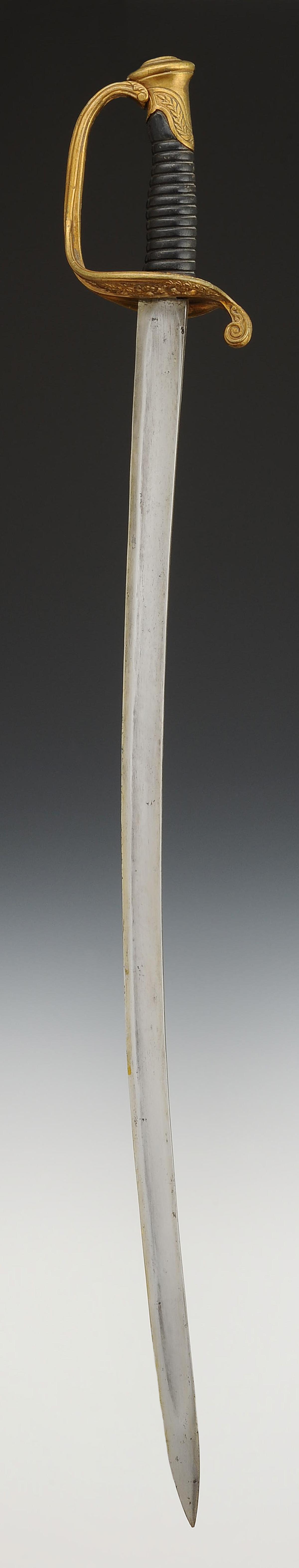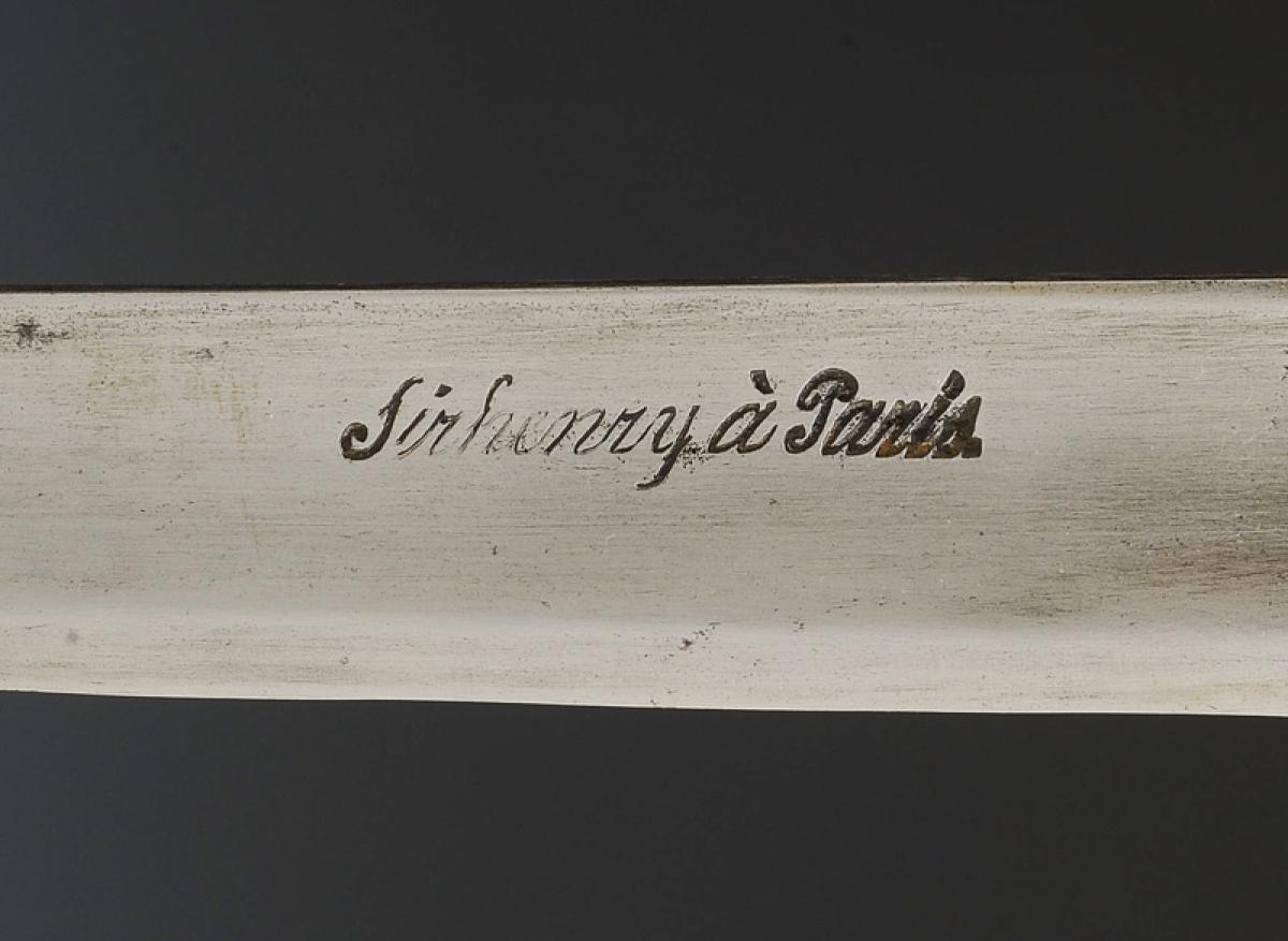 Monture en laiton. Garde à branche latérale et plateau étroit à quillon ajouré d'un décor floral. Calotte à bourrelet à courte queue. Poignée en corne. Lame légèrement courbe à pans creux de 75,4 cm de longueur, dos à jonc, signée sur l'un des deux pans « Sir Henry à Paris ». Fourreau en acier à deux bracelets de bélière.