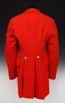 Habit long entièrement en drap écarlate fermant droit à l'avant au moyen de cinq boutons en métal chromé lisse (Ø 2 cm). Col tailleur. Bas des manches garnis de deux boutons petit module. Deux poches arrière horizontales coupées droit. Noeud de taille avec deux boutons d'uniforme. Doublé de toile bordeaux et beige.