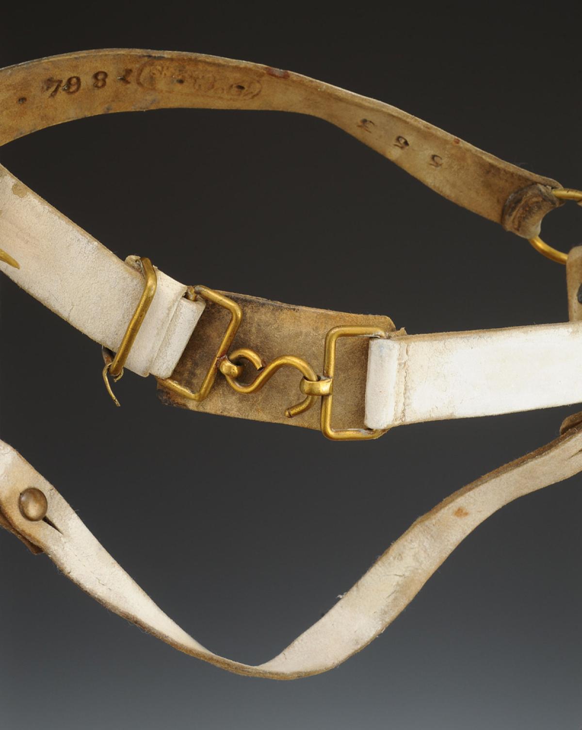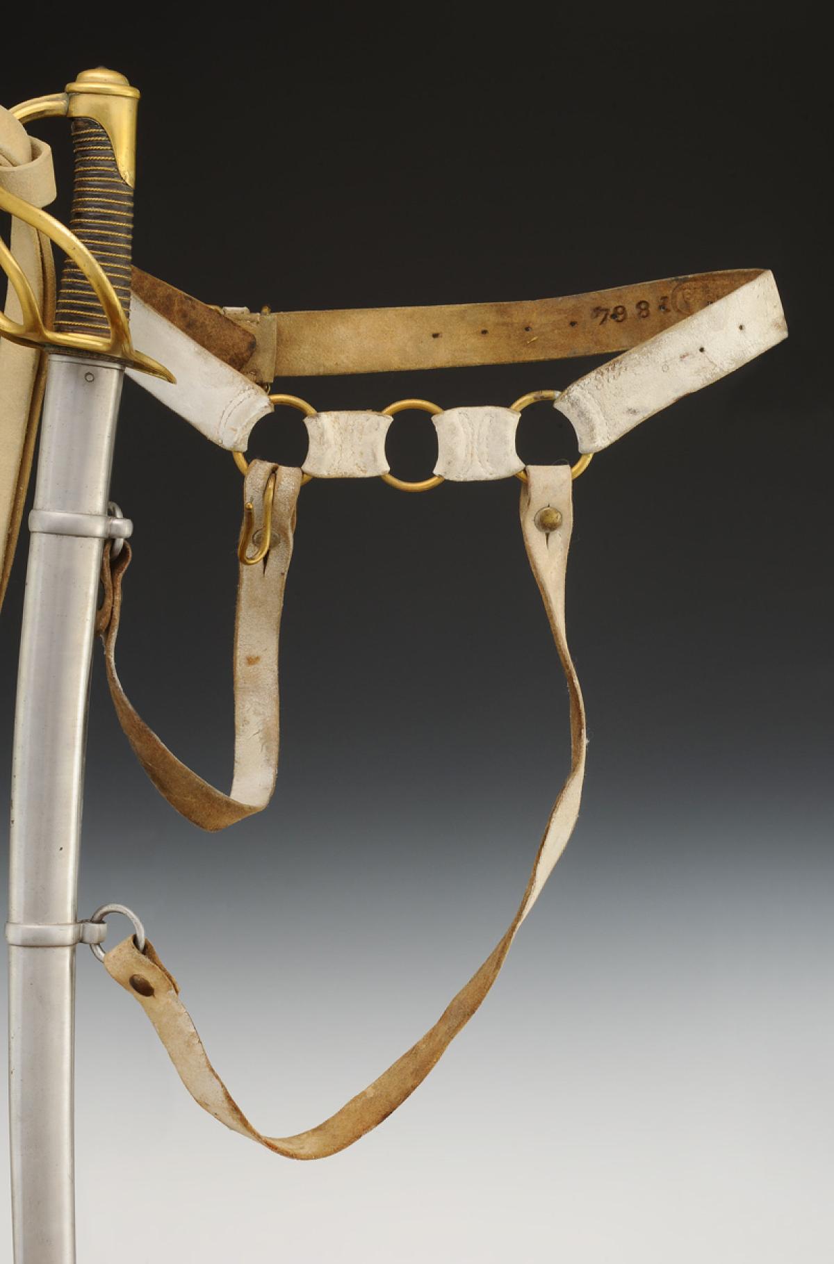 Ceinturon en buffle blanchi, H 3,7 cm, à trois anneaux de laiton (Ø 5,4 cm) fermant à l'avant au moyen de deux boucles en laiton de forme rectangulaire fermant entre elles par un crochet en forme de S, H des boucles 5 cm, largeur 2,6 cm. Il est daté à chaud « 1864 » et matriculé « 553 » avec cachet à chaud du régiment « 12e Chass ». Complet de ses deux bélières porte-sabre et de son crochet porte-sabre, largeur de chaque bélière 2,5 cm.