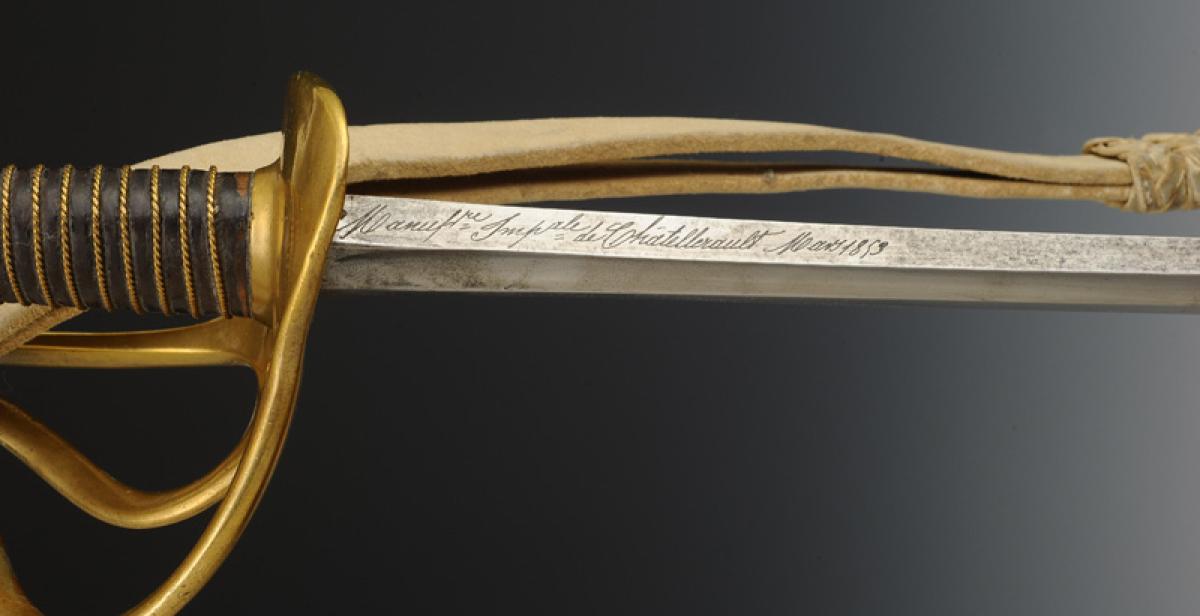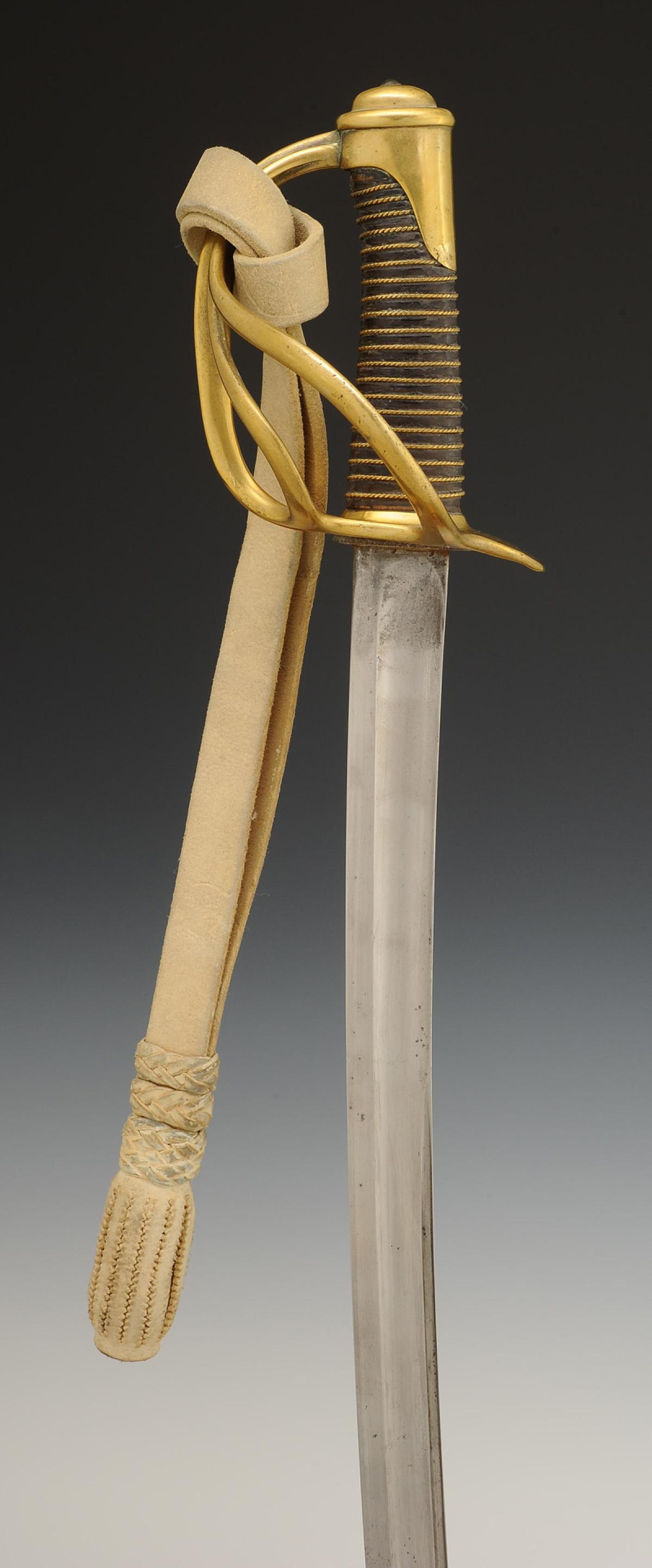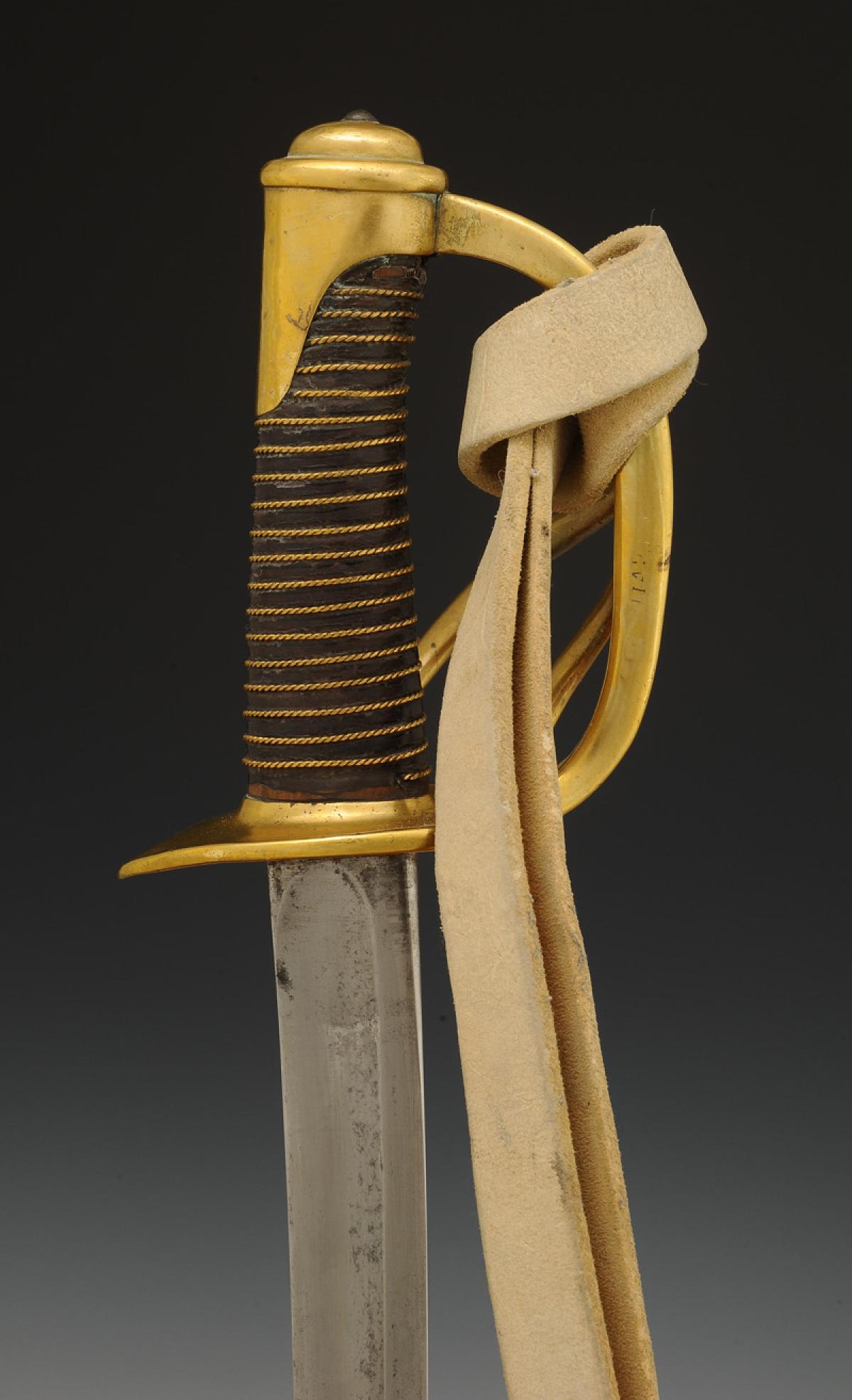 Monture en laiton. Garde à trois branches avec branche principale matriculée « 1149 », avec poinçons devenus illisibles. Calotte à courte queue. Poignée en bois gainé de veau ciré noir filigrané laiton. Lame courbe à pans creux, longueur 91,5 cm, dos plat avec signature « Manufre Impale Châtellerault mars 1853 », lame poinçonnée mais difficilement lisible. Cravate en cuir naturel. Fourreau en acier à deux bracelets de bélière.