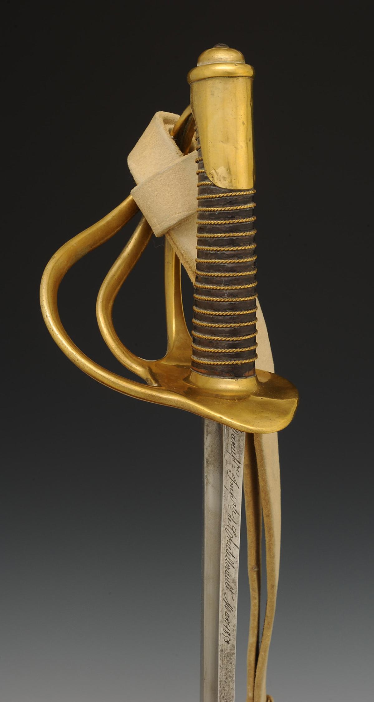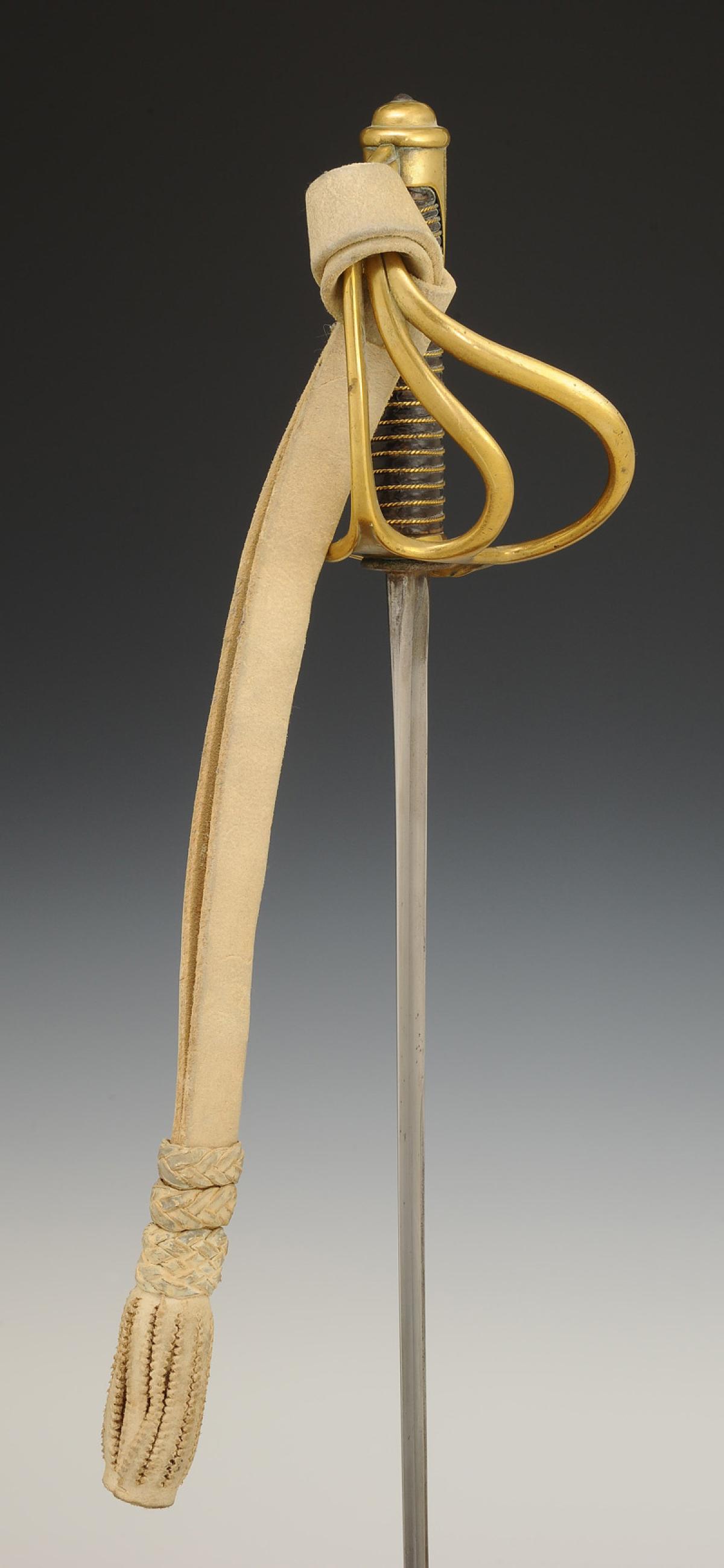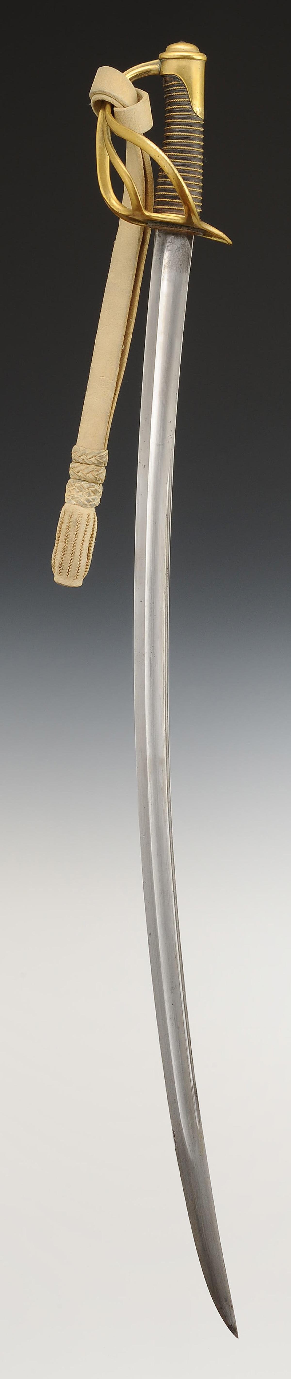 Monture en laiton. Garde à trois branches avec branche principale matriculée « 1149 », avec poinçons devenus illisibles. Calotte à courte queue. Poignée en bois gainé de veau ciré noir filigrané laiton. Lame courbe à pans creux, longueur 91,5 cm, dos plat avec signature « Manufre Impale Châtellerault mars 1853 », lame poinçonnée mais difficilement lisible. Cravate en cuir naturel. Fourreau en acier à deux bracelets de bélière.