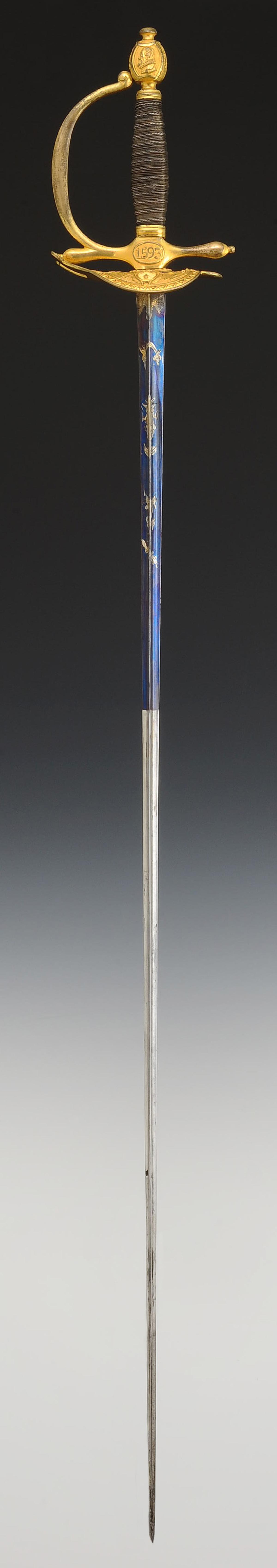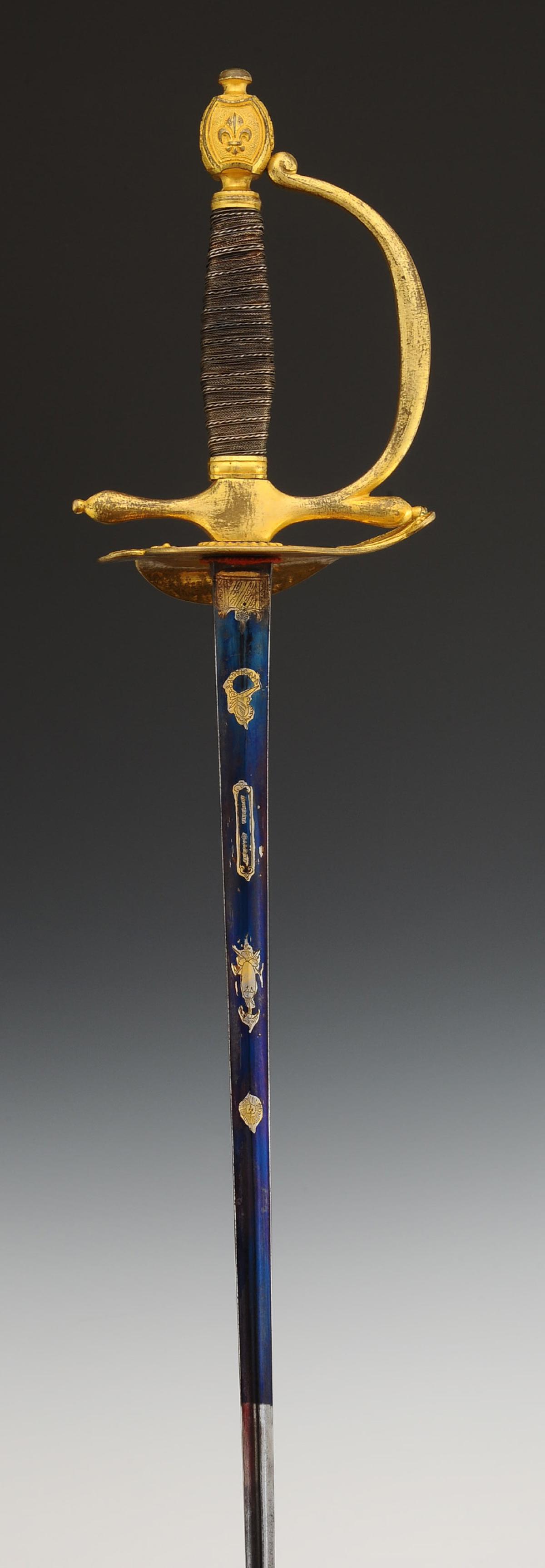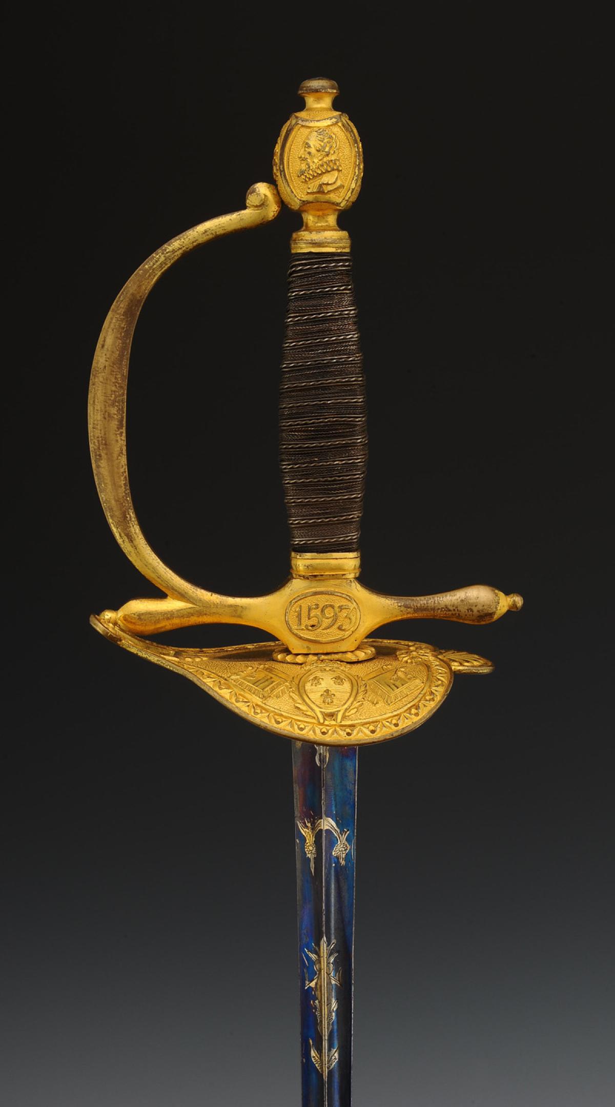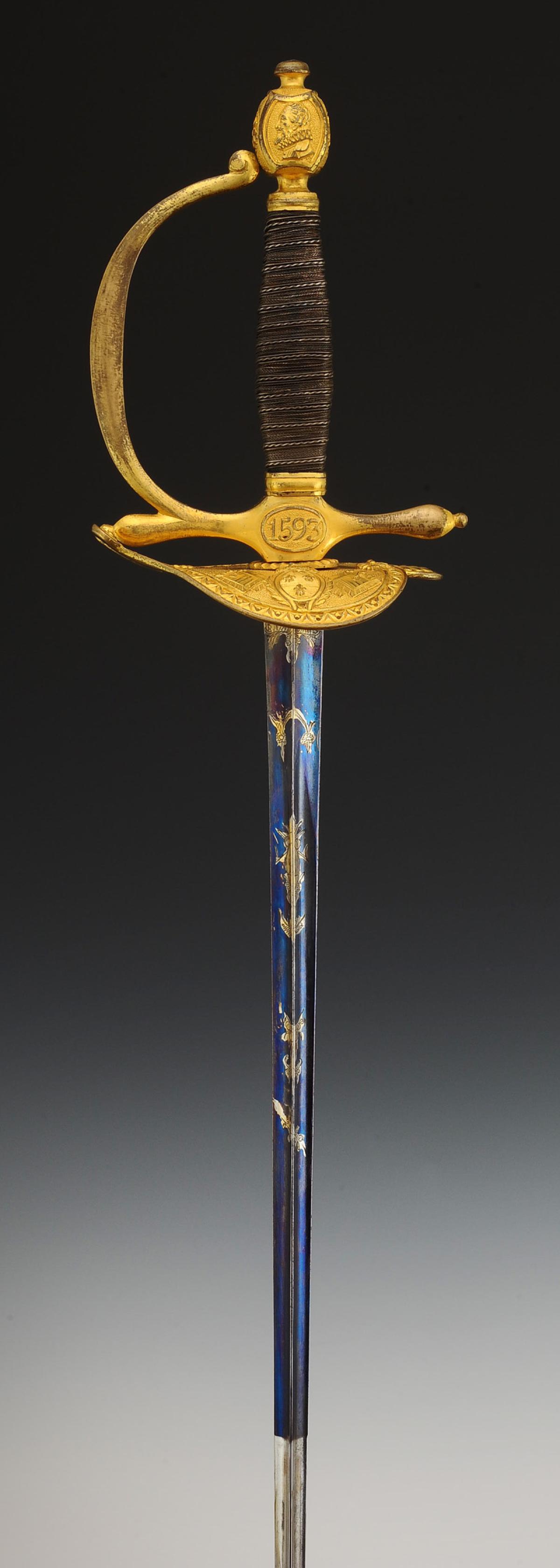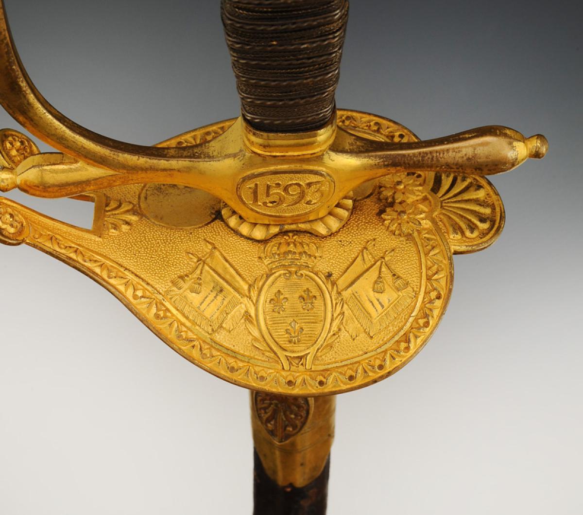 Monture en bronze doré, garde à une branche lisse avec croisière décorée en relief d'un médaillon portant la date « 1593 » (date de création du corps). Pommeau décoré de fleurons, du profil d'Henri IV et d'une fleur de lys, viroles en laiton décorées aux traits. Poignée en bois entièrement filigrané argent. Clavier moulé en relief des Armes de France sur fond de faisceau d'étendards avec bordure d'encadrement à feuillages et fleurons. Lame triangulaire blanche, longueur 81,5 cm. Fourreau en cuir noir verni à deux garnitures en bronze doré.