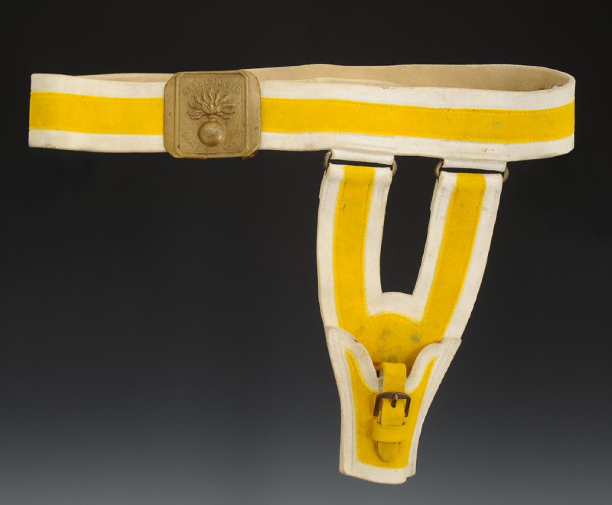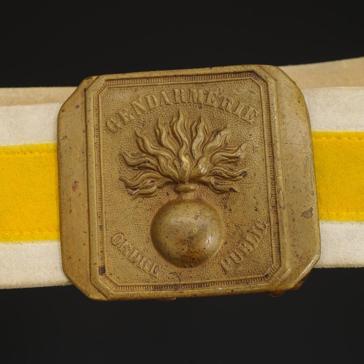 En buffle blanchi avec centre teint en jaune, avec sa plaque rectangulaire en laiton aux angles coupés moulée en relief d'une bombe enflammée avec l'inscription « GENDARMERIE ORDRE PUBLIC », H de la plaque 6,6 cm, largeur 7,5 cm. Largeur du ceinturon 5 cm.