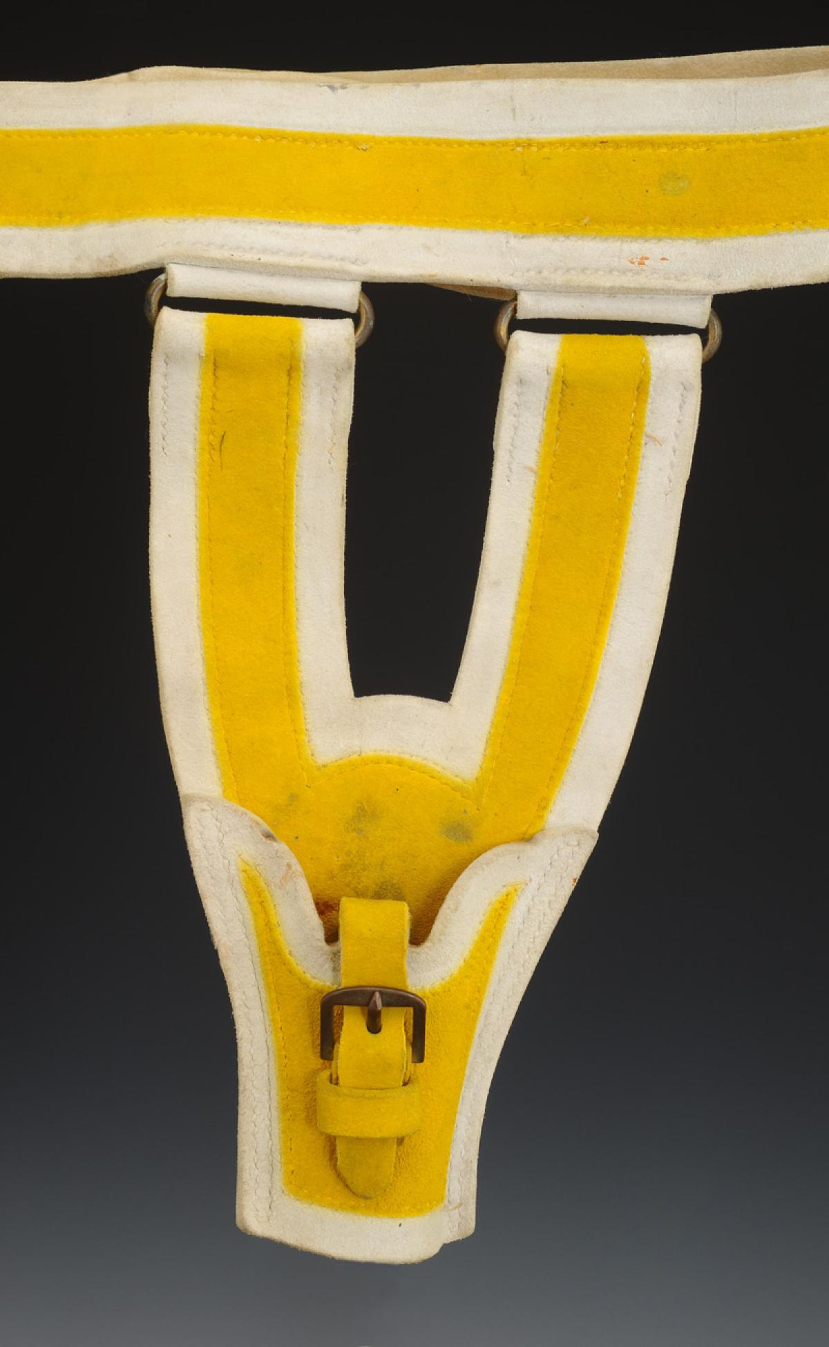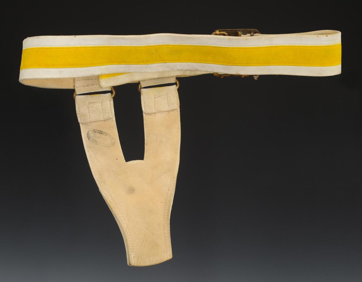 Porte-baïonnette en buffle blanchi avec centre teint en jaune, fixé au ceinturon au moyen de deux pattes en buffle blanc et anneaux de laiton.