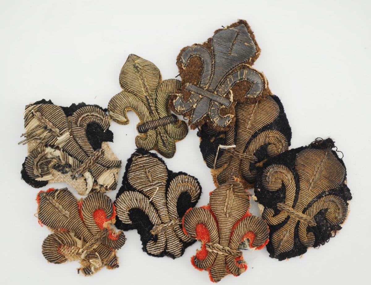Huit fleurs de lys brodées en fils et cannetilles d'argent et dorés sur drap bleu ou écarlate.