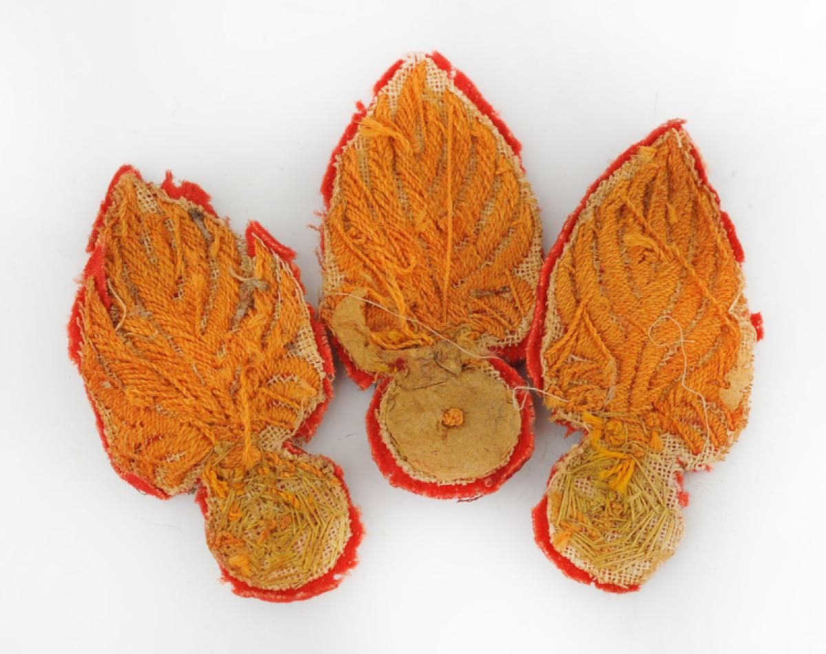 Brodées en fils de coton blanc sur fond de drap écarlate.