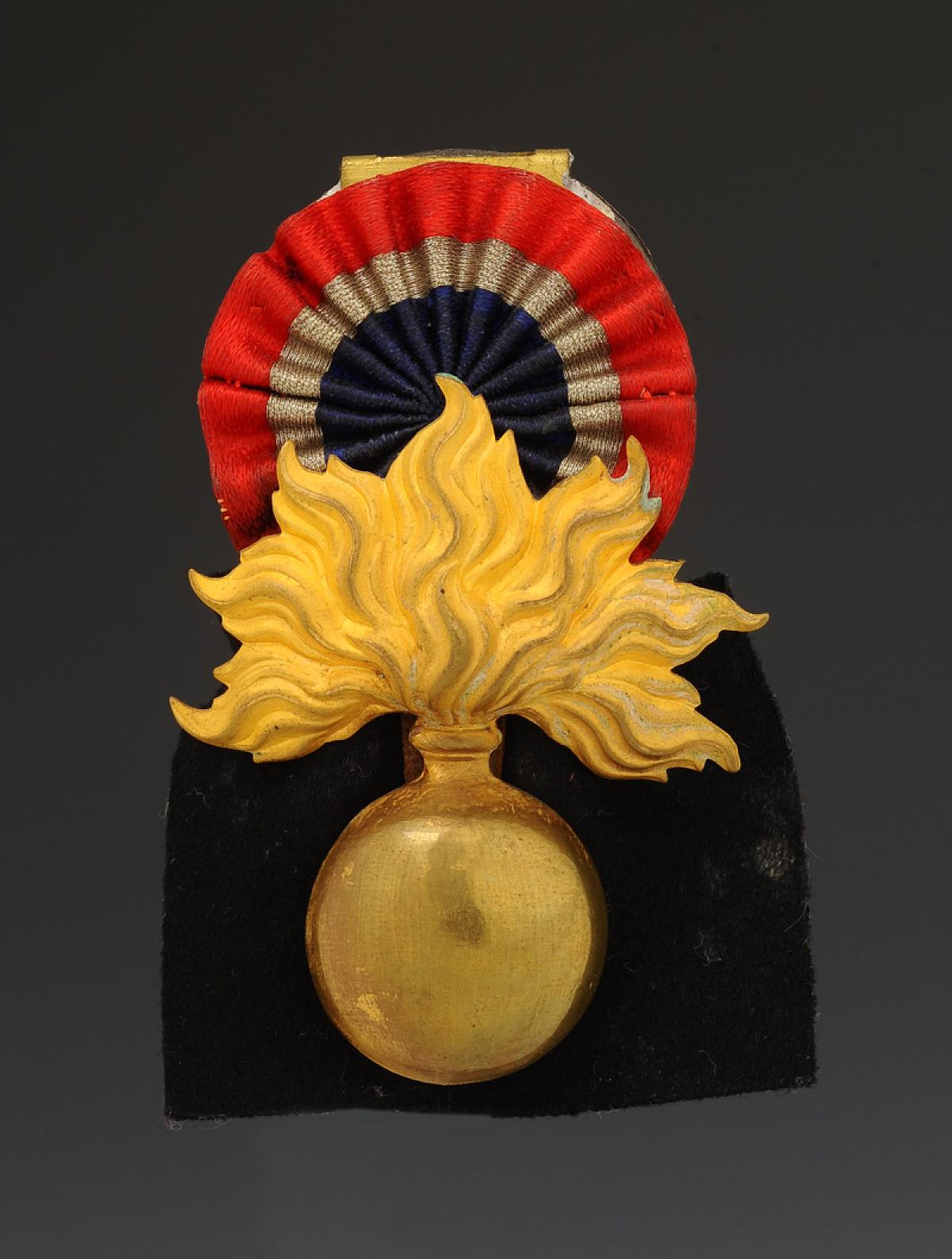 Bombe enflammée en laiton doré avec cocarde en passementerie tricolore.