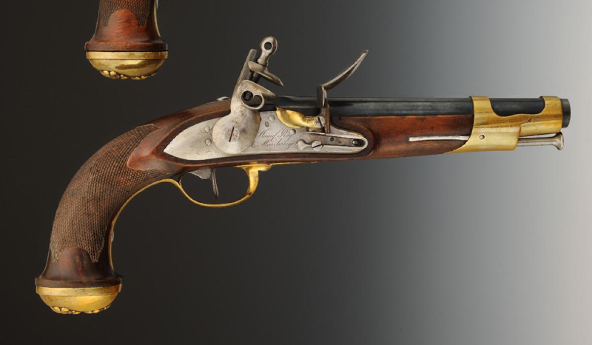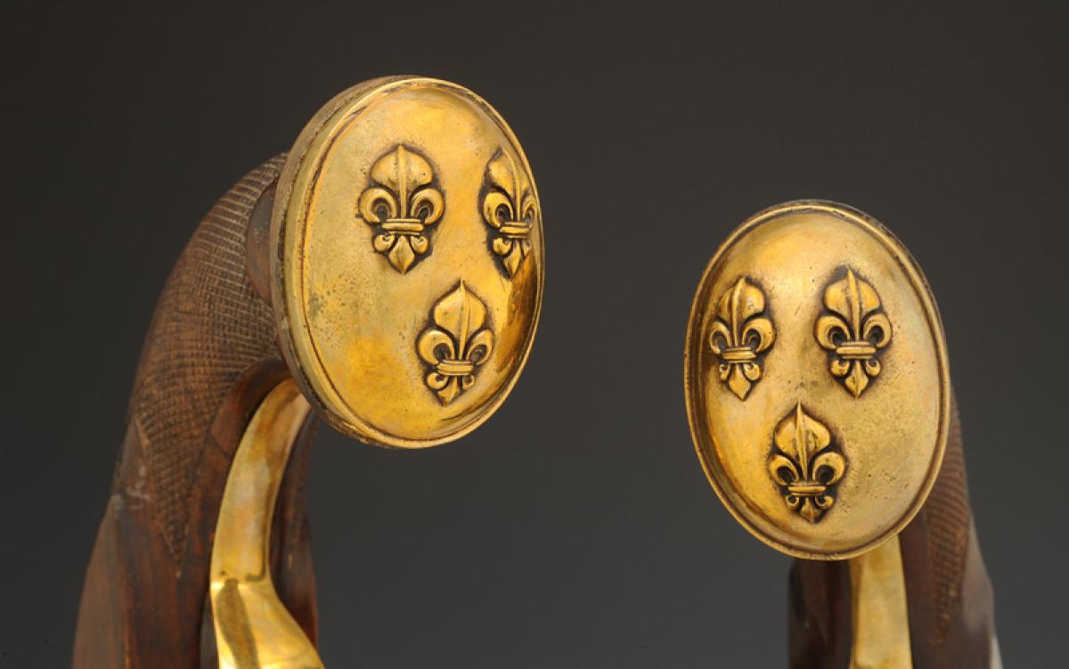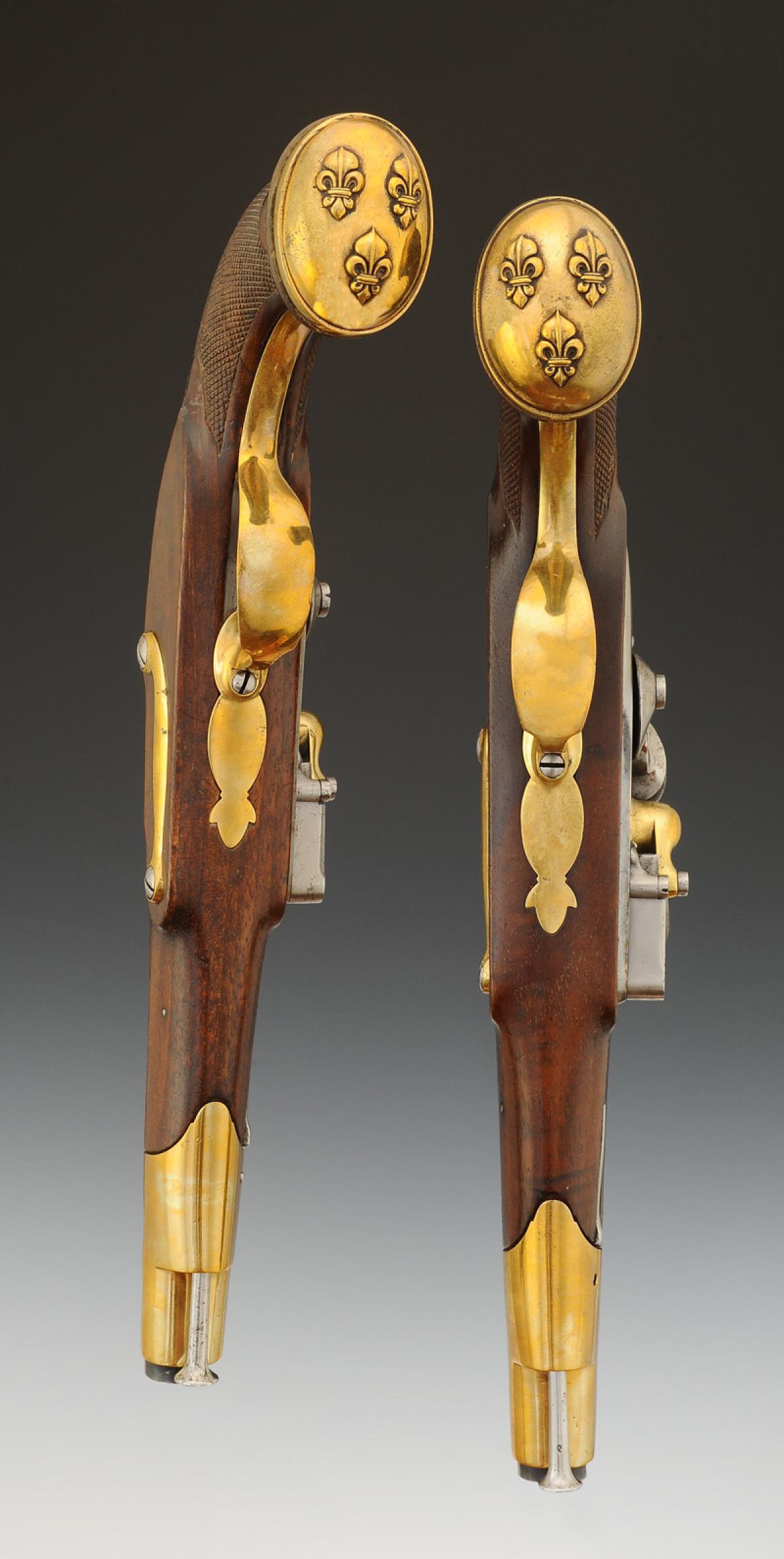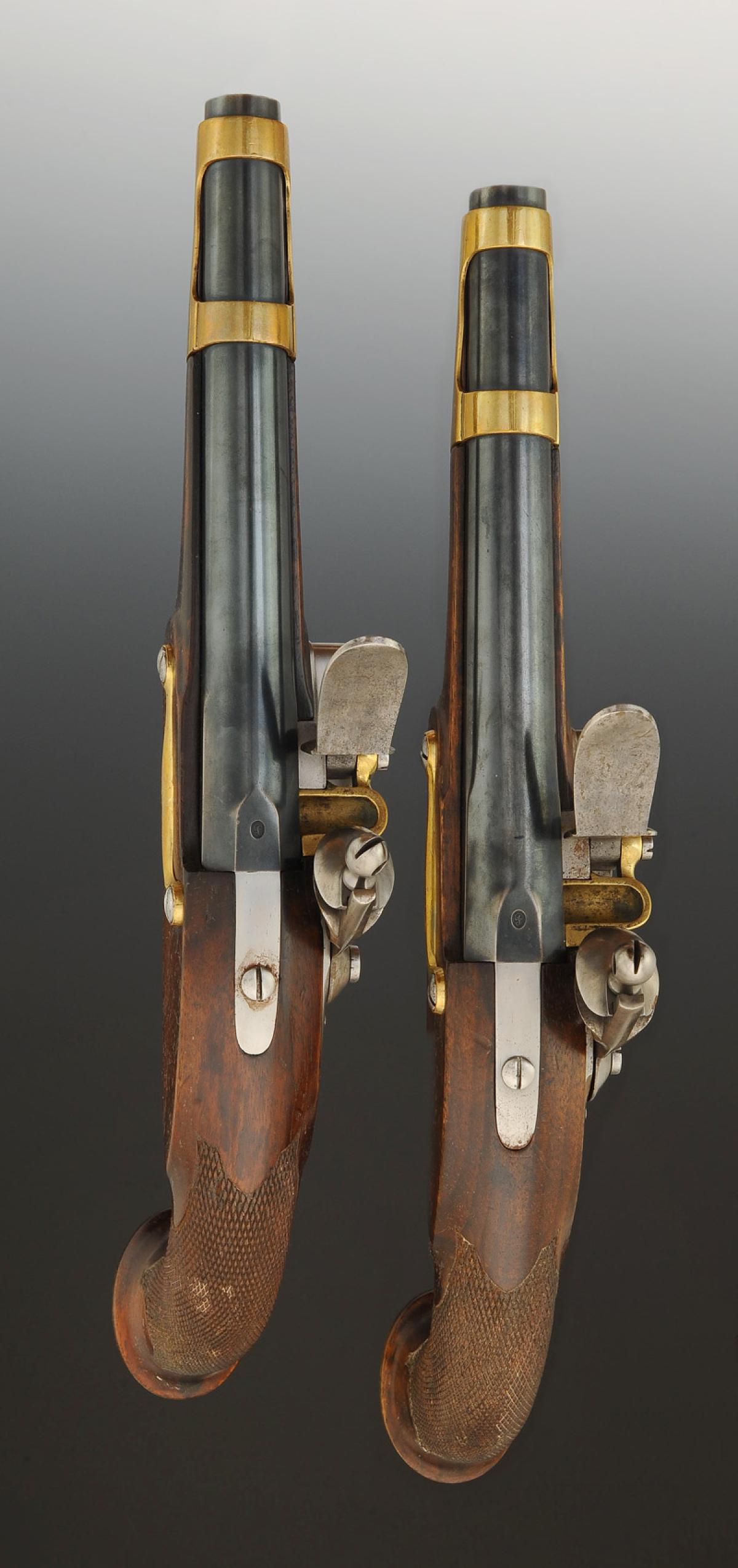 Canons dits « Canon tordu » bleuis, sur le modèle de l'An IX, sans décor ni inscription, longueur 20 cm, avec la queue de culasse 25,7 cm, calibre 17 mm, poinçonnés « P » de l'inspecteur PREAU, en 1817 et 1818. Platines du modèle de cavalerie An XIII avec léger retroussis à la batterie, signées « Manuf. Roy. De Maubeuge » et poinçonnées « C » sous couronne de Jean Nicaise COMPAS, premier contrôleur à Maubeuge de 1816 à 1824. Montures en noyer à long fût avec crosses très pentées finement quadrillées, chacune se terminant par un bourrelet droit surmonté d'une calotte en forme d'éllipse décorée en relief de trois fleurs de lys. Toutes garnitures en laiton. Sous-gardes se terminant par une fleur de lys stylisée. Contre-platines en laiton. Baguettes en fer.