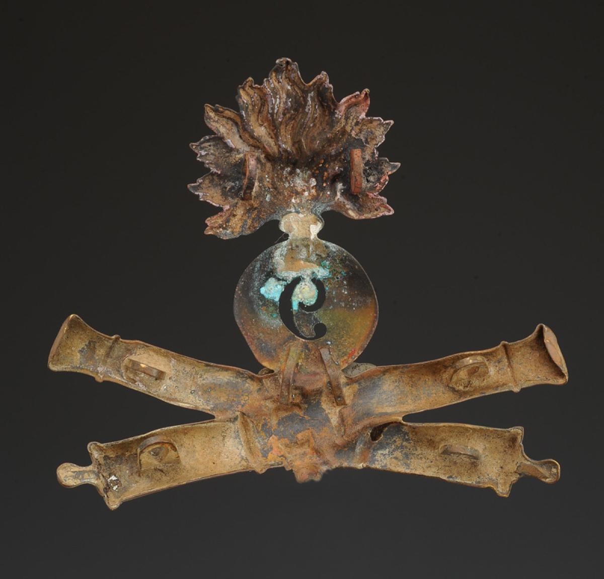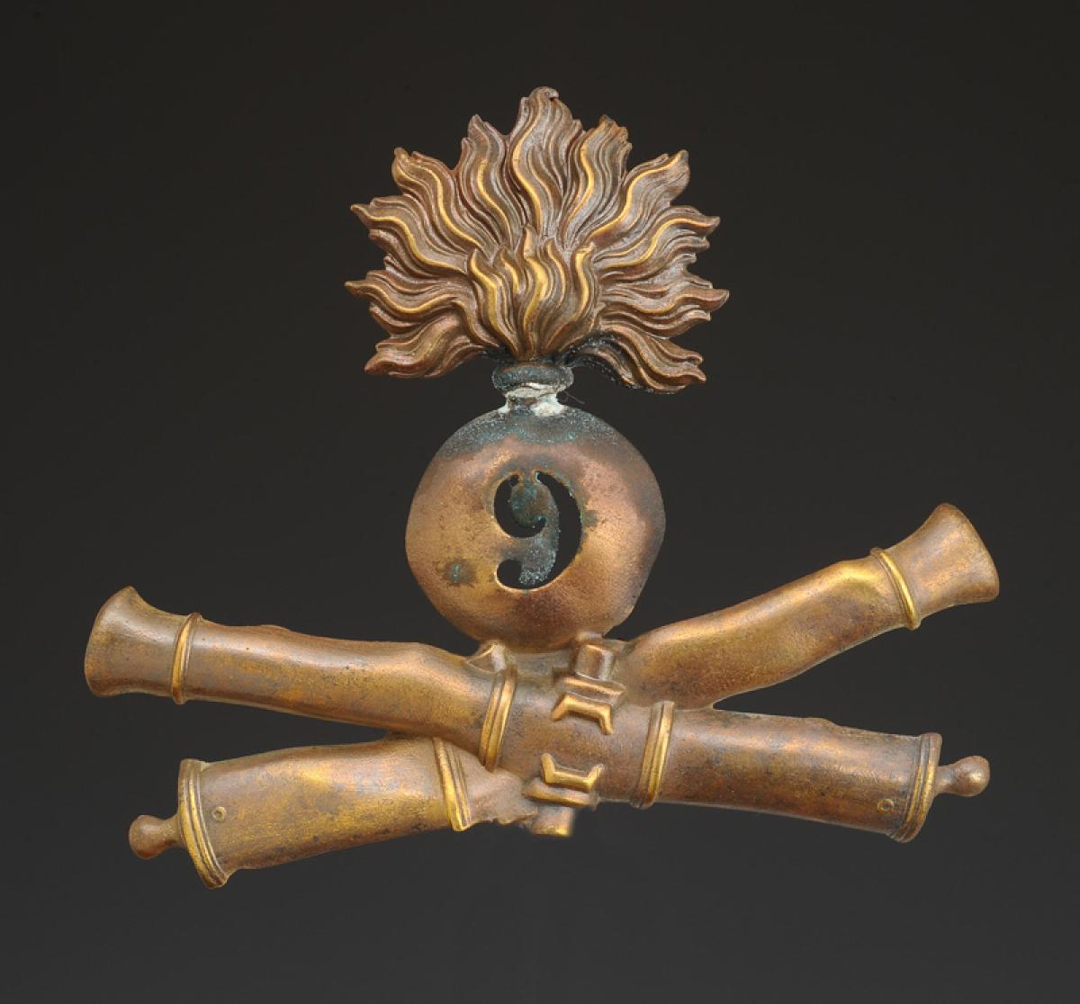 En laiton estampé de deux canons croisés surmontés d'une bombe enflammée découpée du chiffre « 9 ».