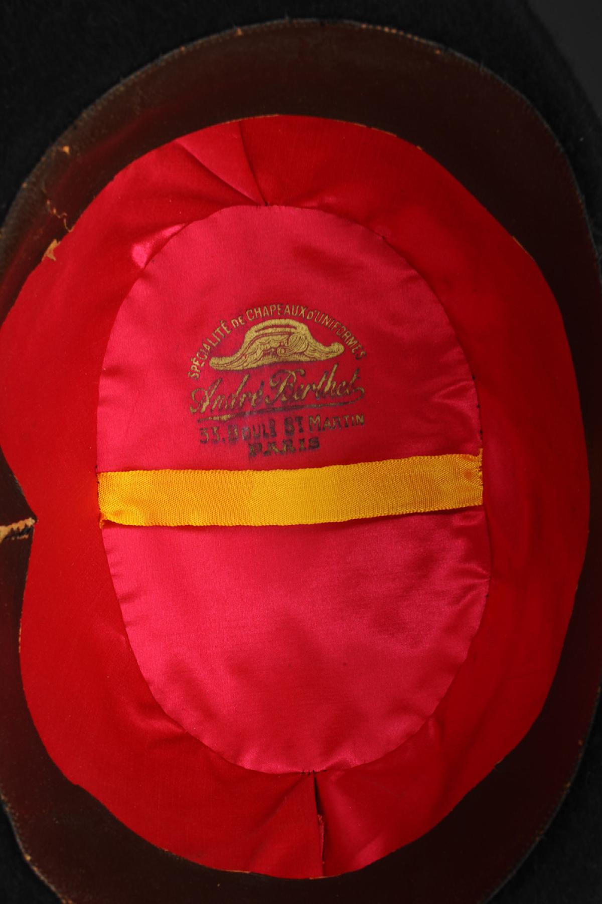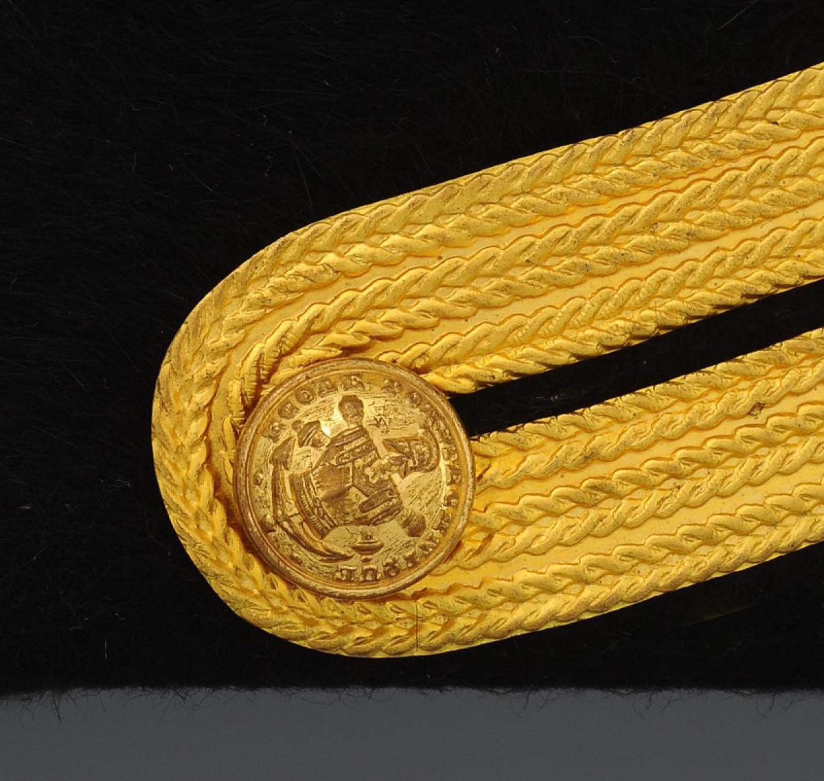 En feutre taupé noir, bordé d'un galon tissé de branches de laurier. H à l'avant 10 cm, H à l'arrière 13 cm, longueur 47 cm, largeur 16 cm. Cocarde en passementerie tricolore. Ganse en laiton doré estampé imitant une passementerie retenue par un bouton demi-sphérique au nom et armes de l'Ecole Polytechnique. Bandeau intérieur en cuir noir. Coiffe en soie cramoisie, marquée à l'or « André Berthet SPECIALITE DE CHAPEAUX d'UNIFORMES 33 Bould St Martin PARIS ».