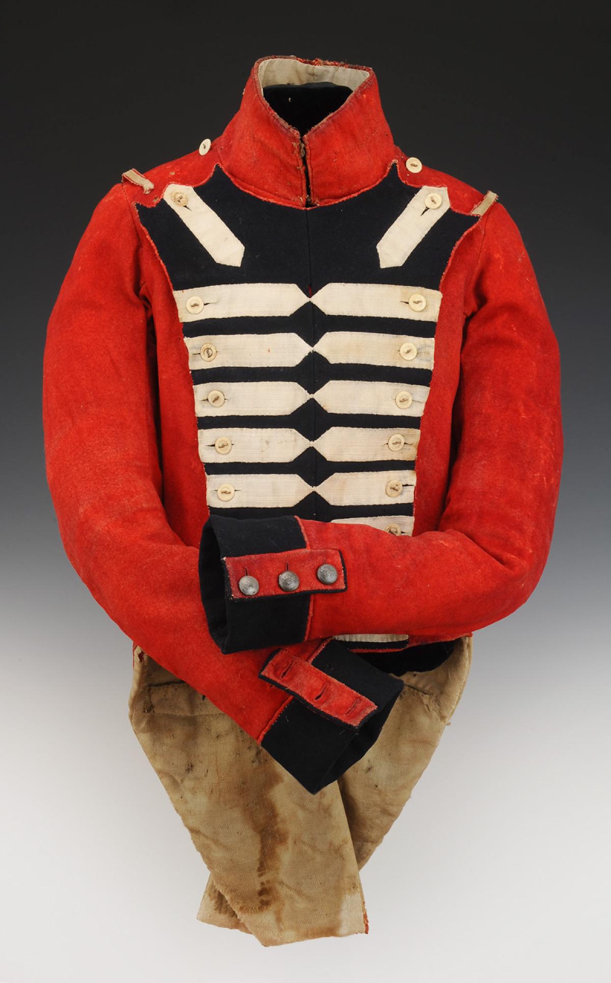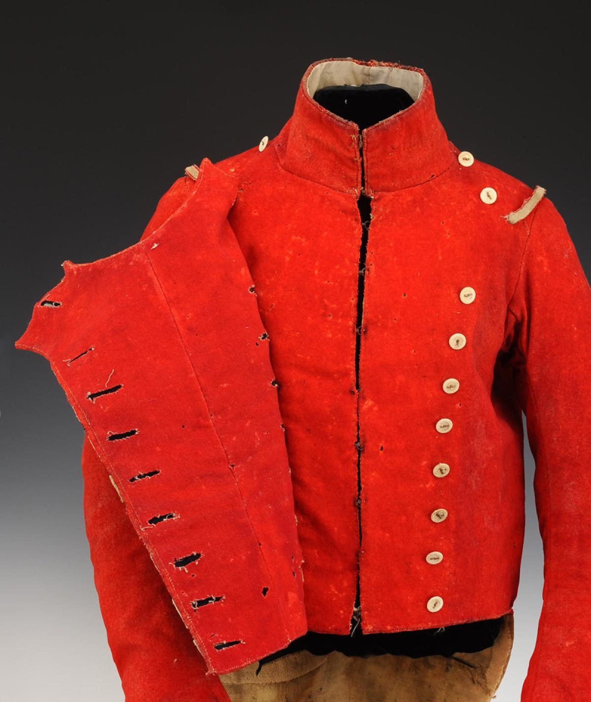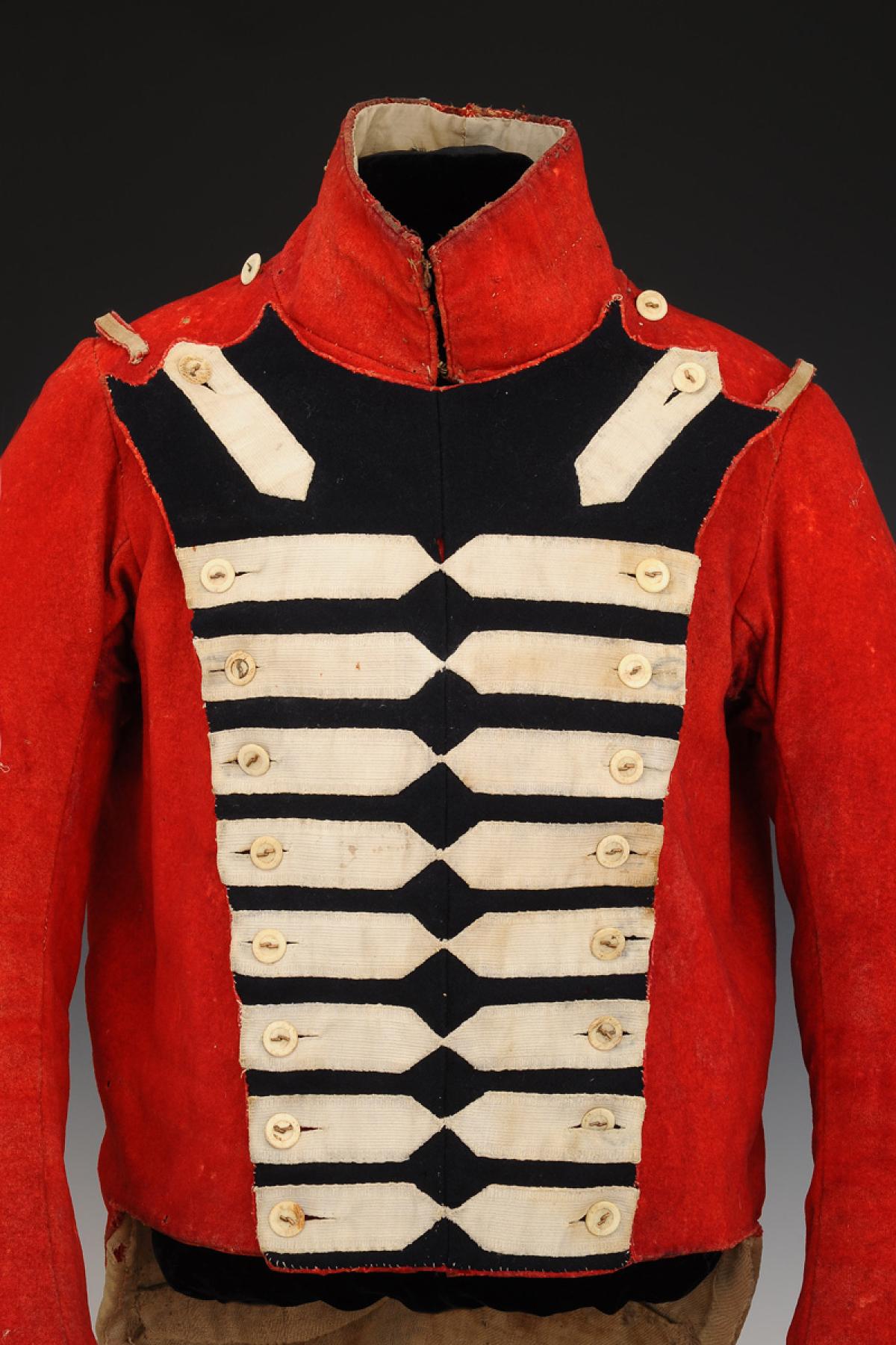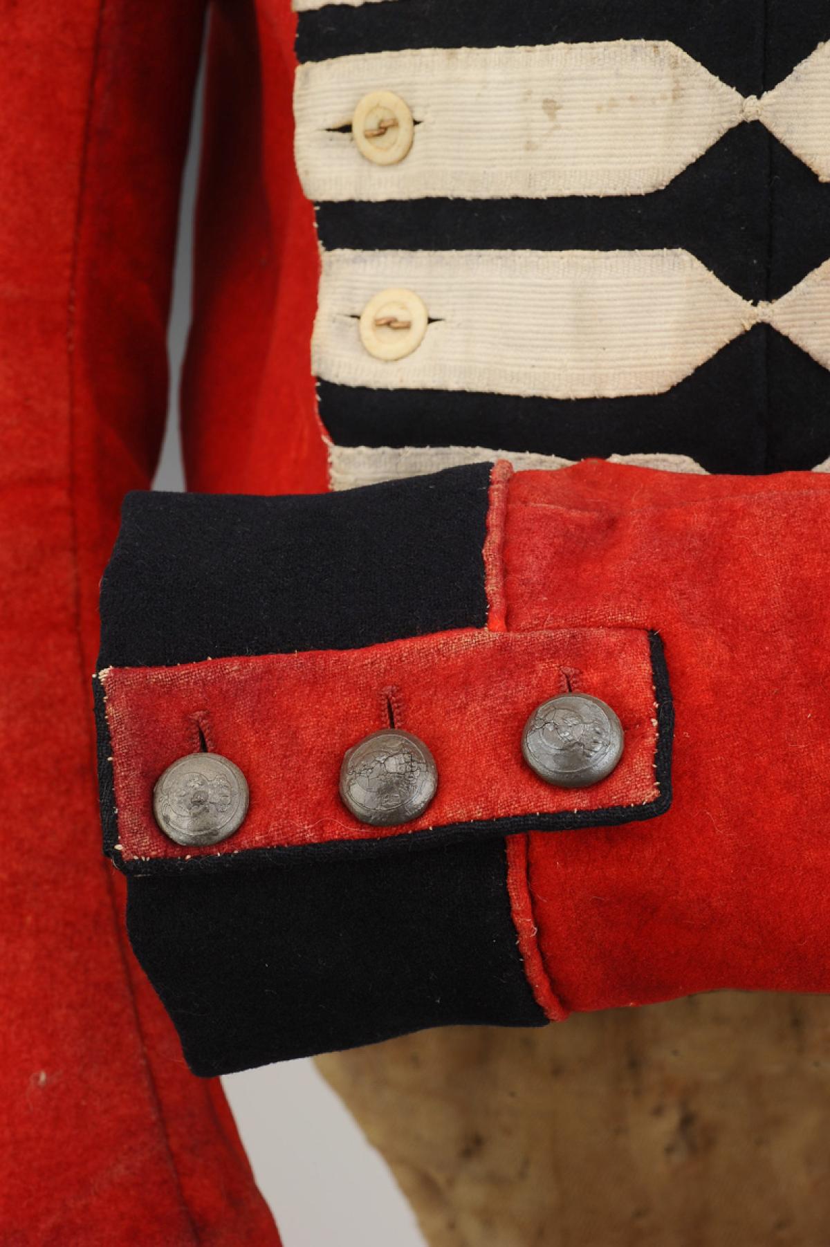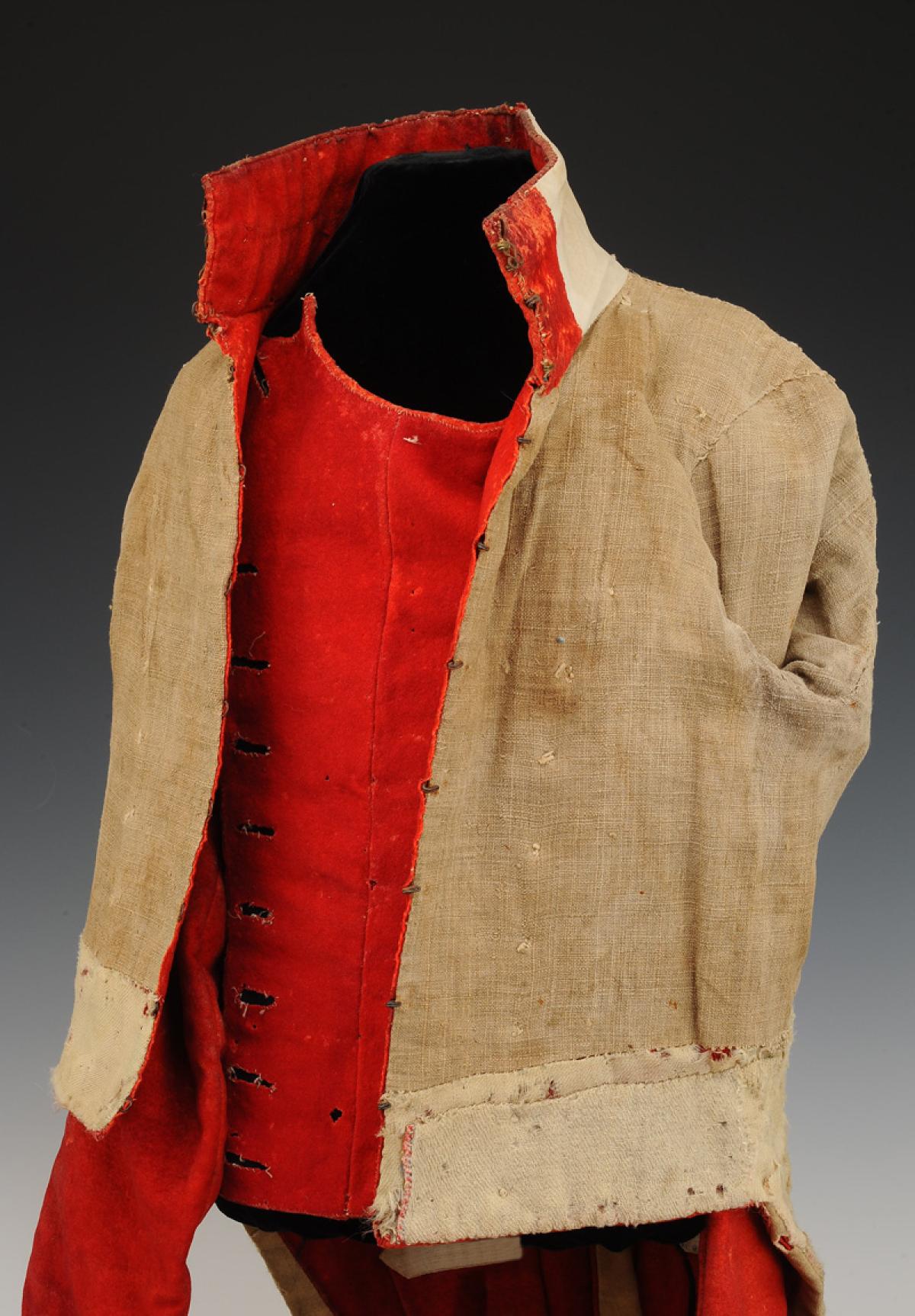 Habit entièrement en drap écarlate fermant droit à l'avant au moyen de sept agrafes et anneaux en fer laqué noir. Collet en drap écarlate fermant droit, H 7 cm.