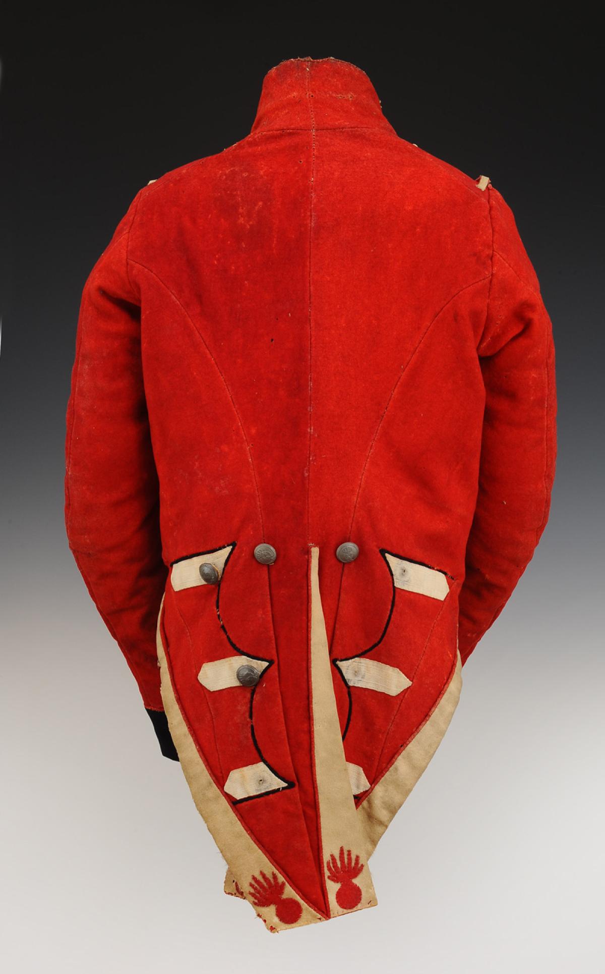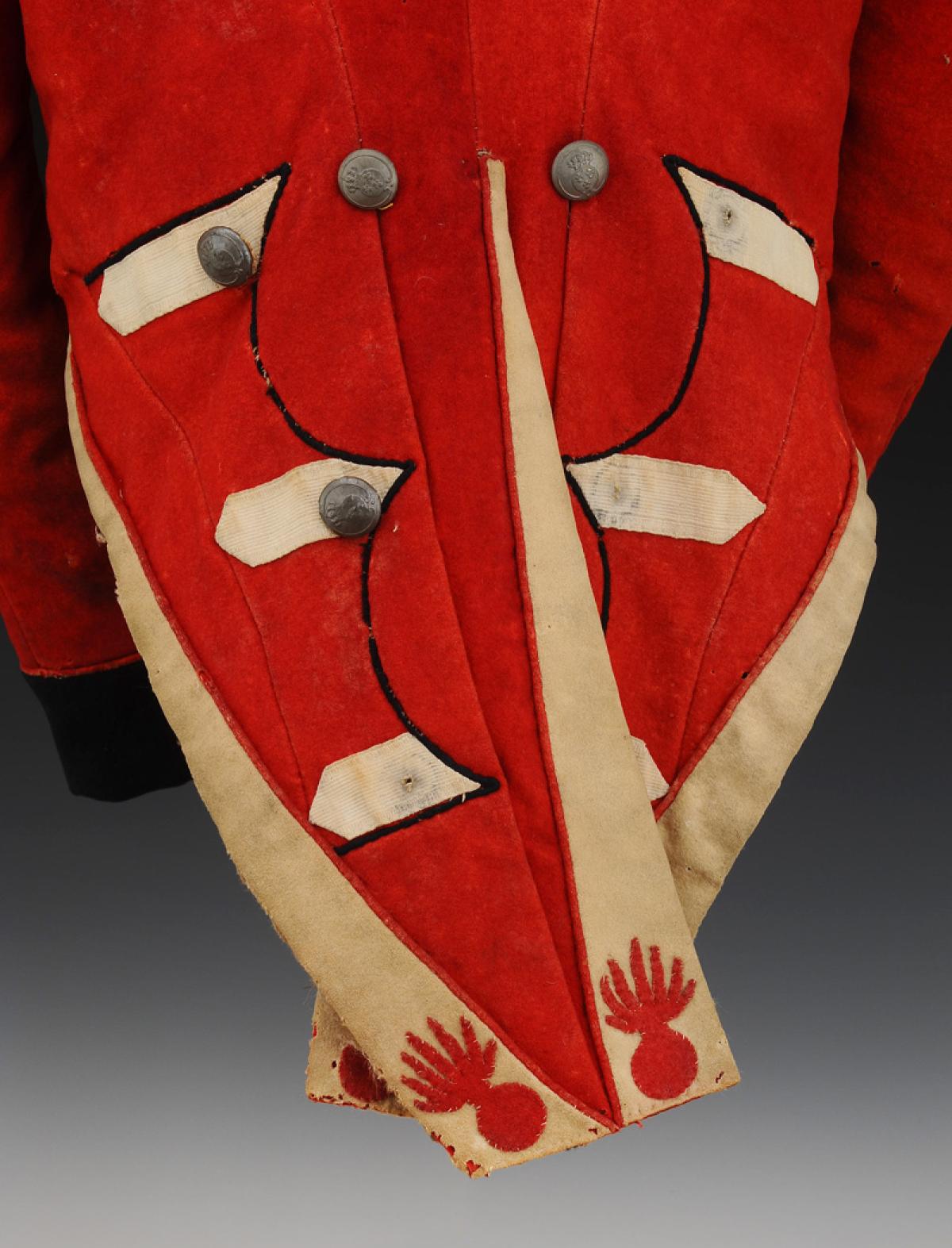 Retroussis en drap blanc passepoilé écarlate dont les quatre angles sont garnis d'une grenade enflammée découpée en drap écarlate et cousue. Fausses poches arrière droites en drap écarlate passepoilé bleu foncé, formant trois pointes ; chaque pointe étant garnie d'une tresse en galon blanc et d'un bouton d'uniforme. Noeud de taille à deux boutons d'uniforme. Brides d'épaulettes en galon blanc montées sur drap écarlate.