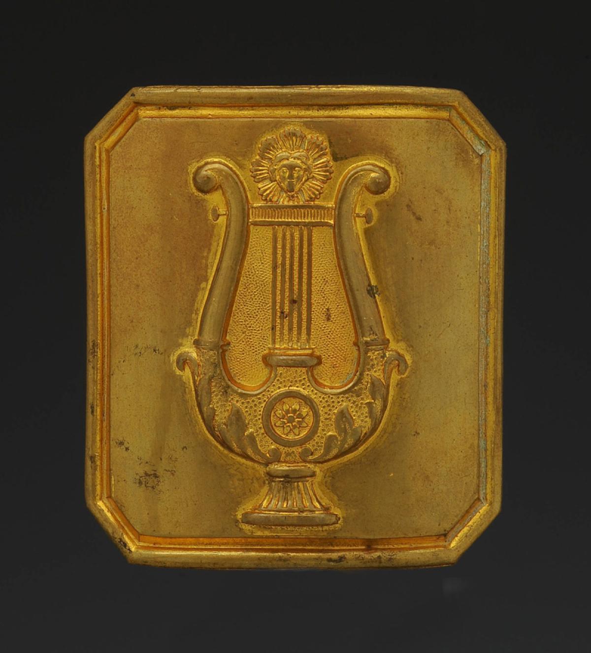 Plaque en laiton, de forme rectangulaire aux angles coupés, H 6 cm x 5 cm, estampée d'une lyre. Complète de son crochet et de son pontet.