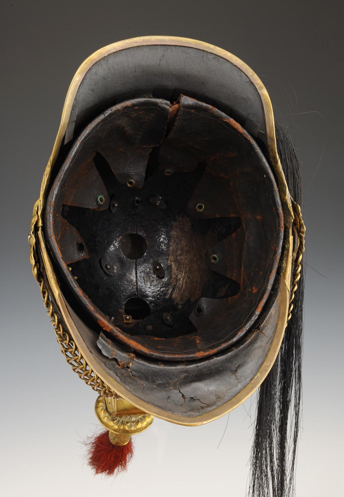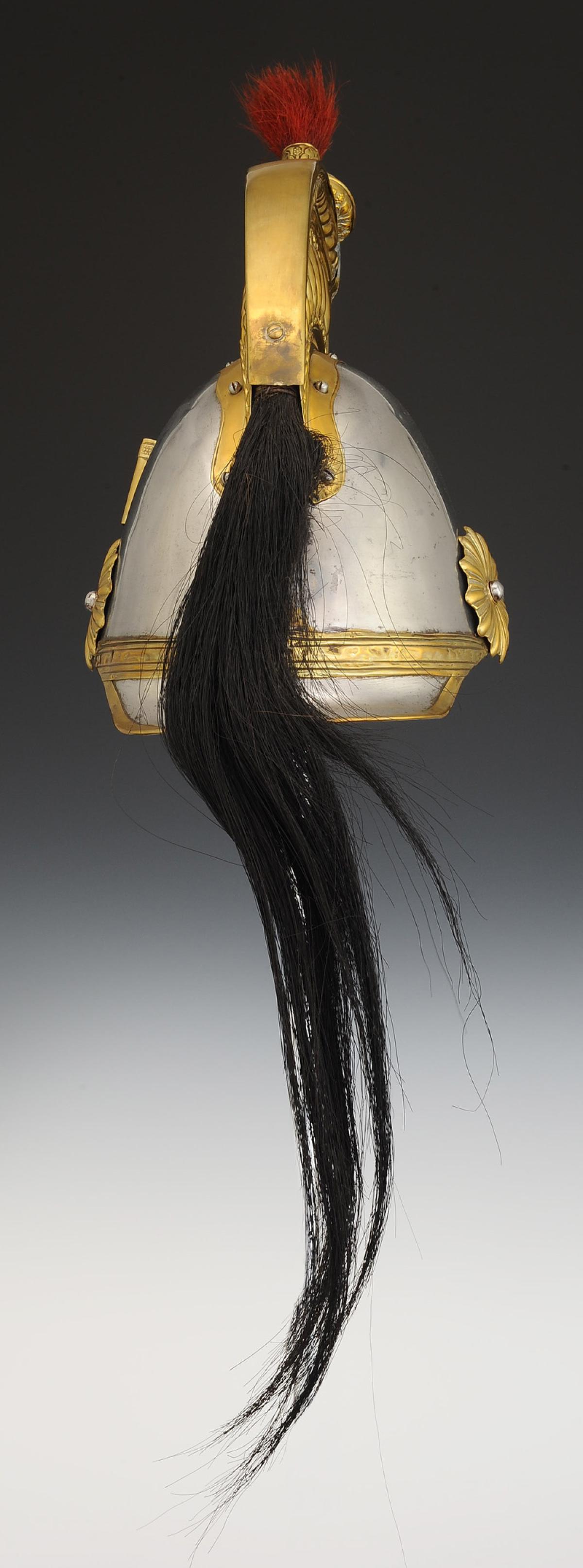 Casque entièrement en acier. Il se compose d'une bombe, d’une visière et d’un couvre-nuque tous deux cerclés d'un jonc en laiton plié à cheval sur la bordure extérieure, d’un bandeau, de deux jugulaires, d’un cimier, d’une crinière en crins noirs d’environ 52 cm de longueur, et d’un porte-plumet.