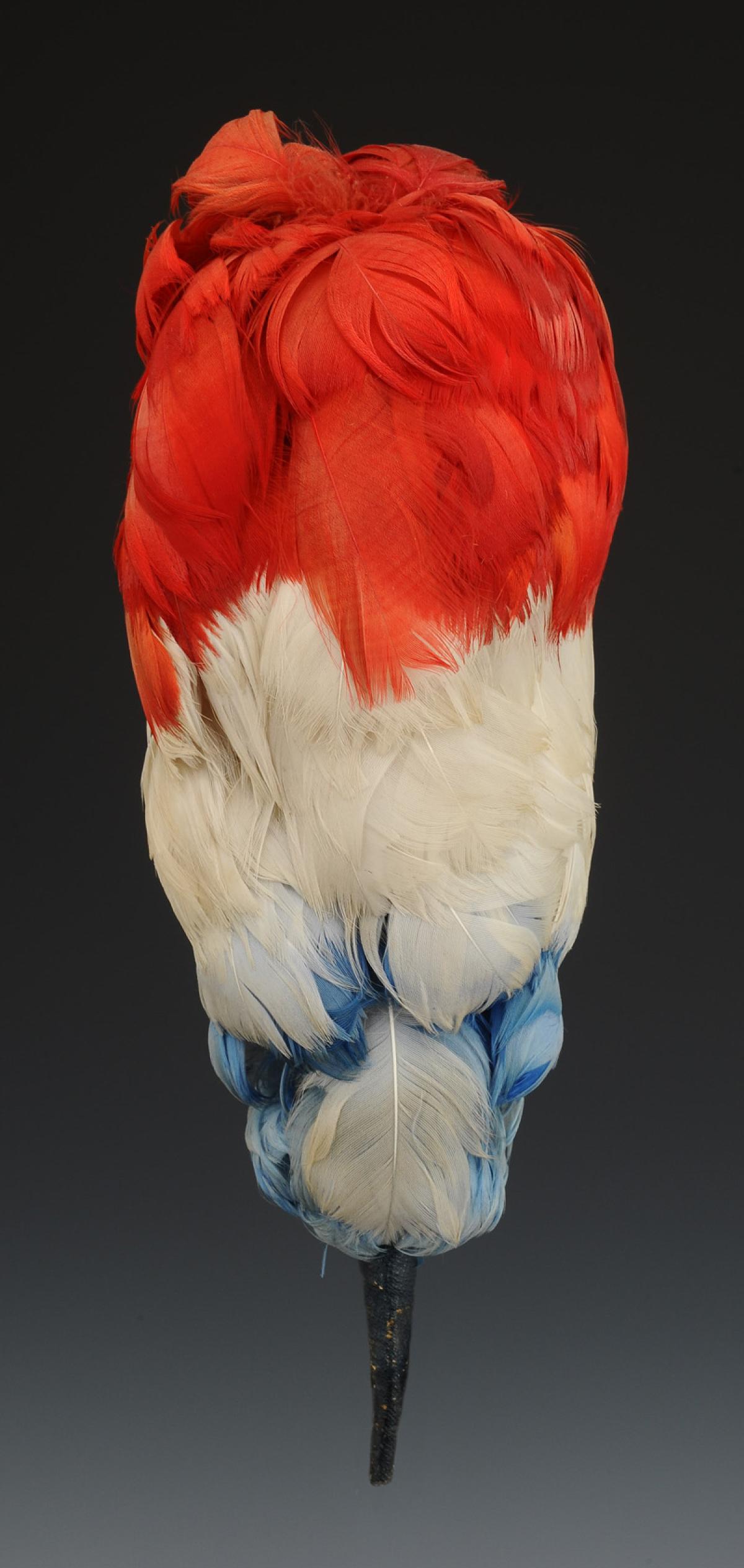 En plumes de coq tricolores, H des plumes 20 cm, montées sur une baleine en bois. H totale 25,5 cm.