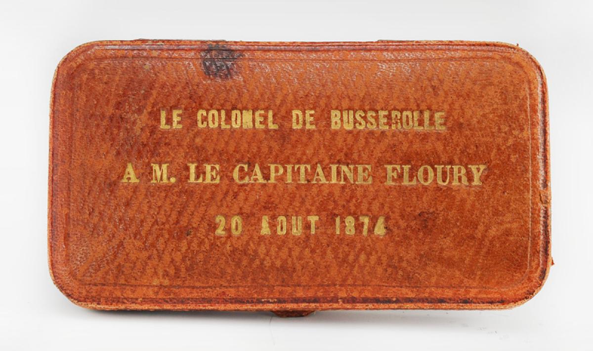 Présentée dans un coffret en maroquin ocre doré au fer « LE COLONEL DE BUSSEROLLE / A M. LE CAPITAINE FLOURY 20 AOÛT 1874 ».