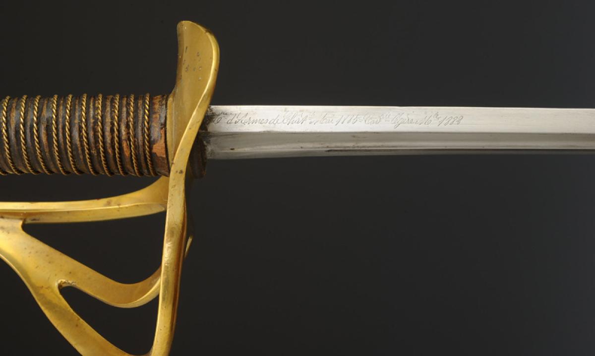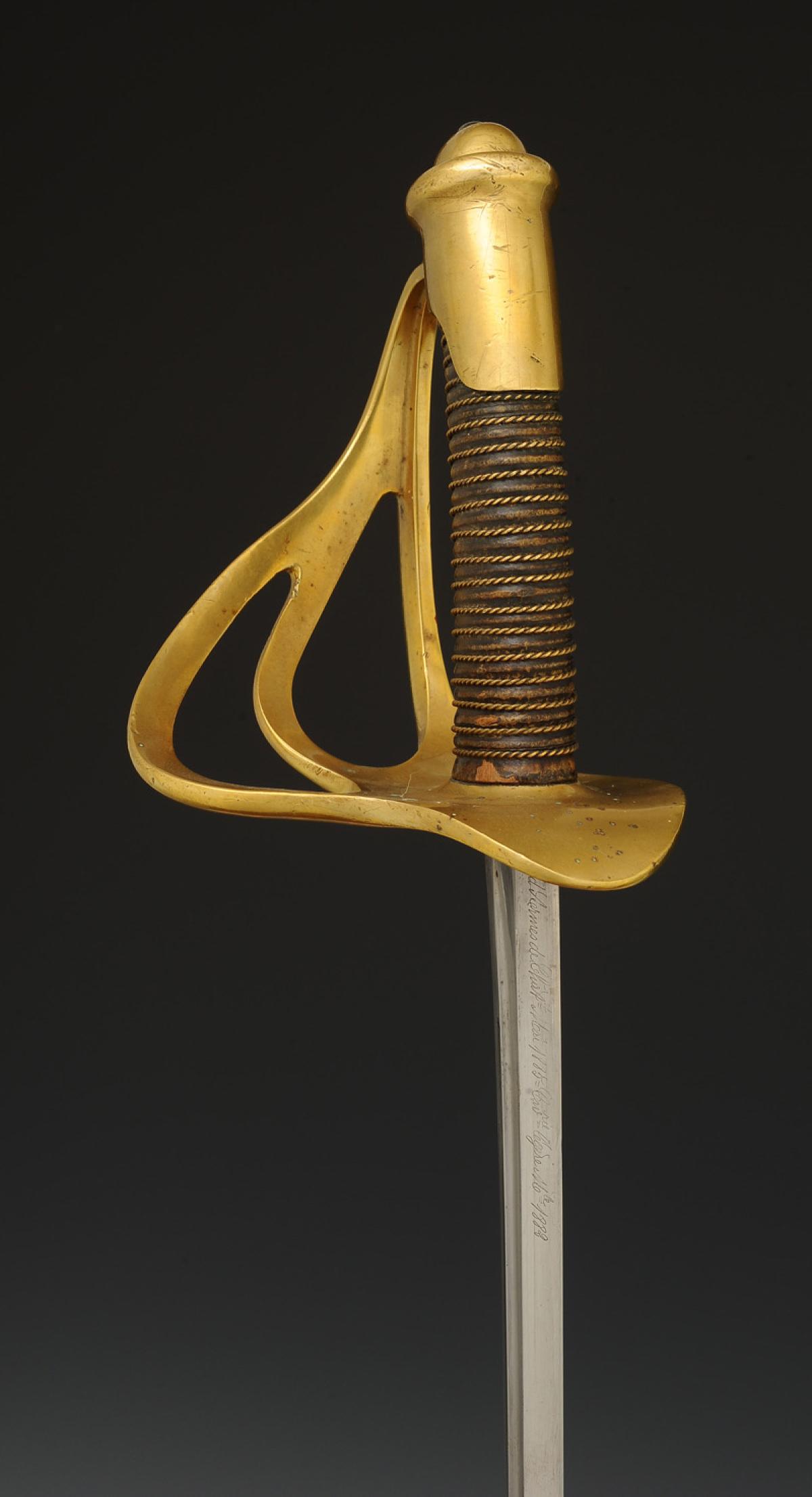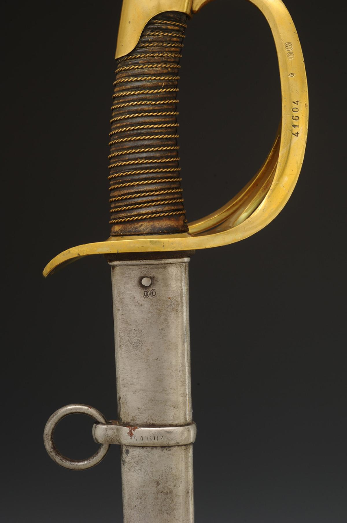 Monture en laiton. Garde à trois branches avec poinçon sur la branche principale et matricule « 41604 ». Calotte à courte queue. Poignée en bois gainé de veau ciré noir, filigrane laiton. Lame droite à pans creux, longueur 87 cm, gravée au dos « Mre d'Armes de Châtt mai 1885 = cavrie légère mle 1882 ». Cravate en buffle naturel. Fourreau en acier à un bracelet de bélière.