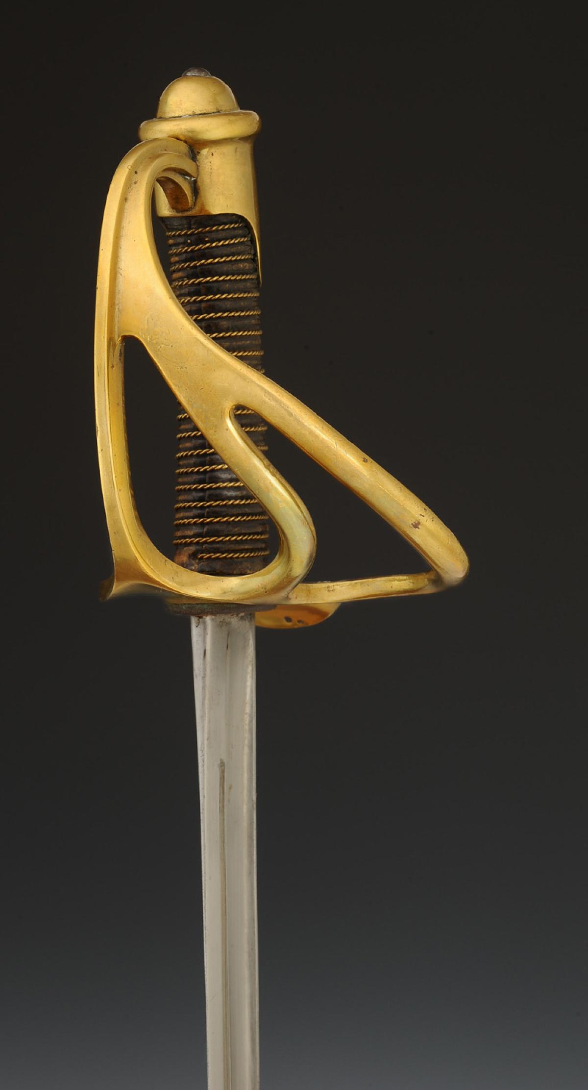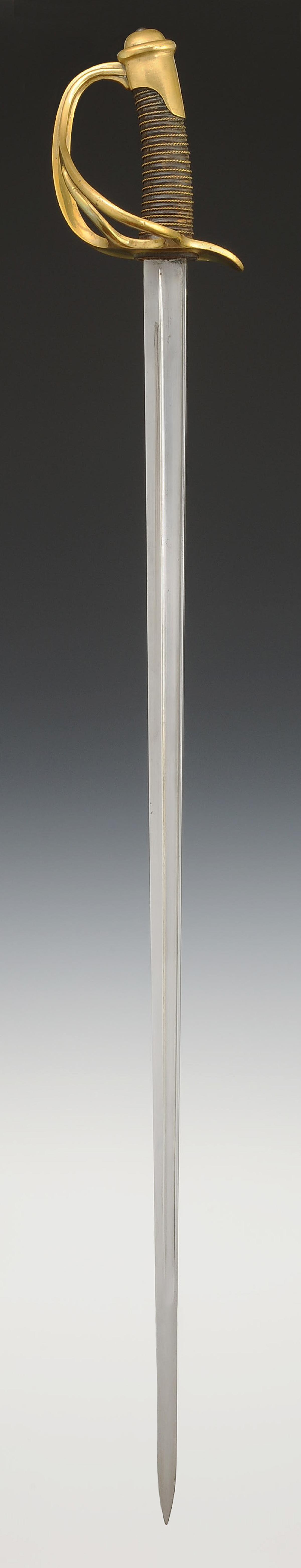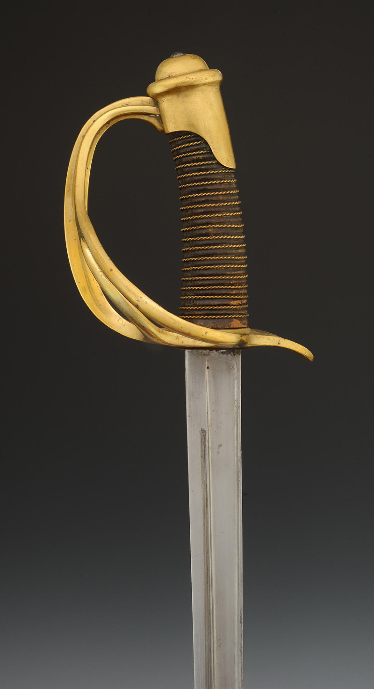 Monture en laiton. Garde à trois branches avec poinçon sur la branche principale et matricule « 41604 ». Calotte à courte queue. Poignée en bois gainé de veau ciré noir, filigrane laiton. Lame droite à pans creux, longueur 87 cm, gravée au dos « Mre d'Armes de Châtt mai 1885 = cavrie légère mle 1882 ». Cravate en buffle naturel. Fourreau en acier à un bracelet de bélière.