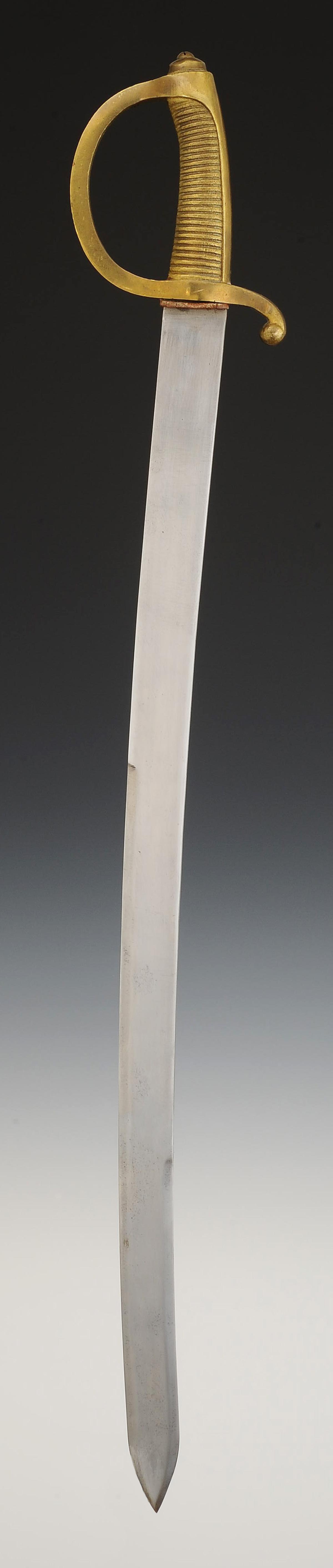 Monture en laiton monobloc. Garde à une branche. Lame plate et courbe, longueur 65,5 cm. Cravate en cuir naturel. Fourreau en cuir verni noir à deux garnitures de laiton avec chape à bouton pour le port au ceinturon.