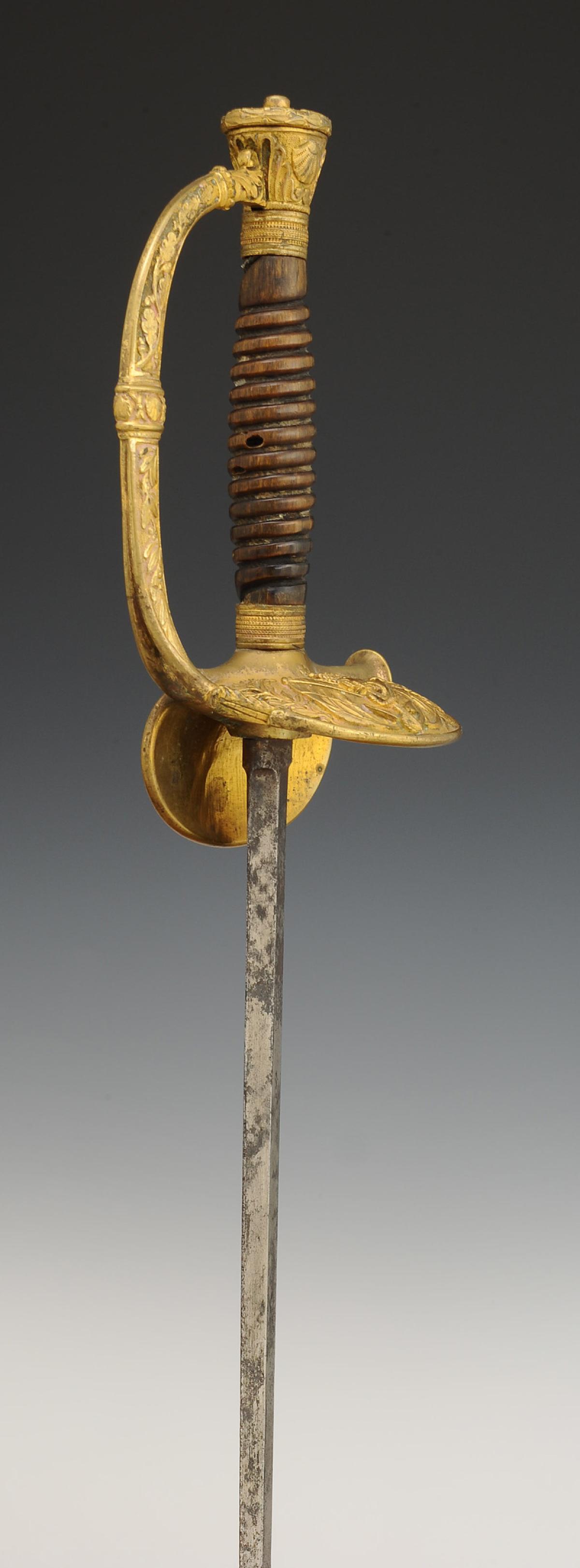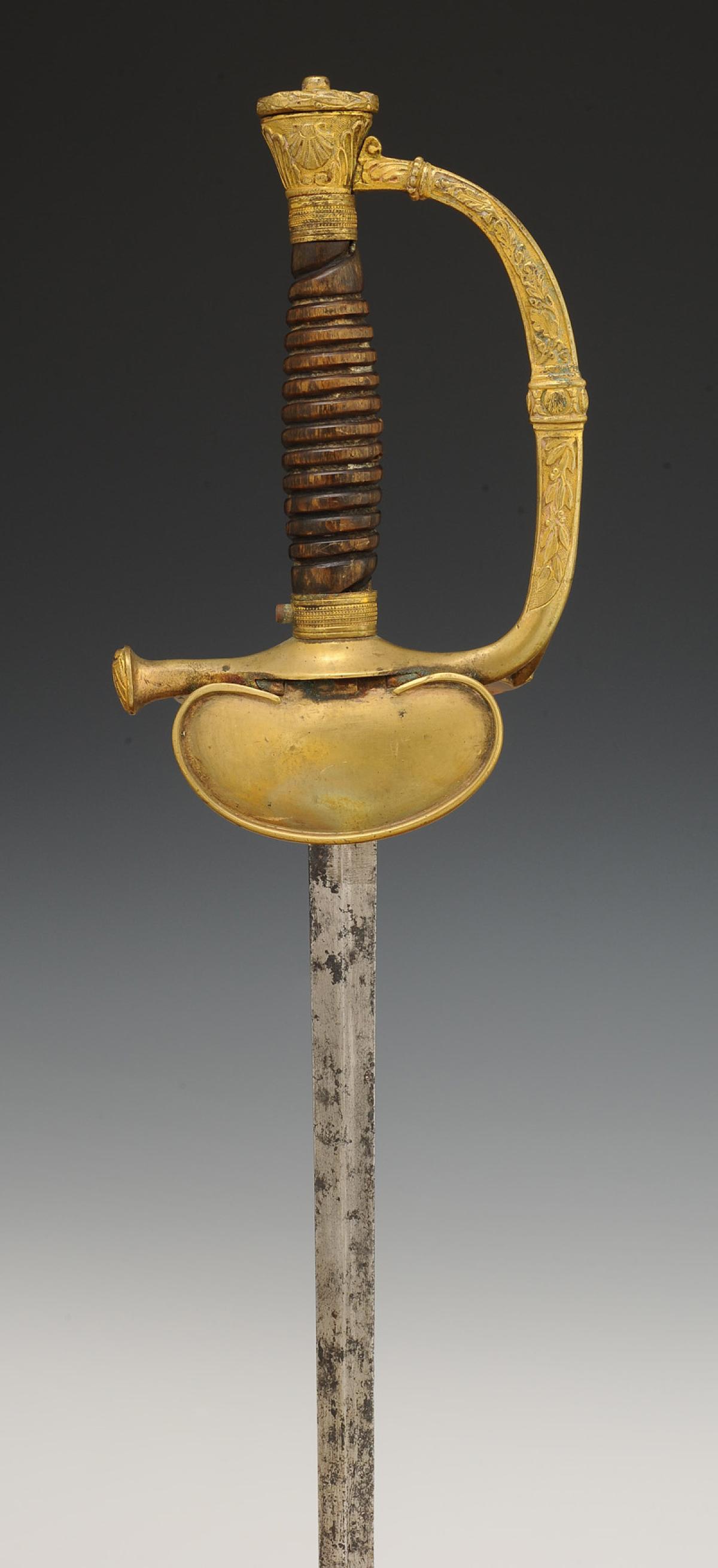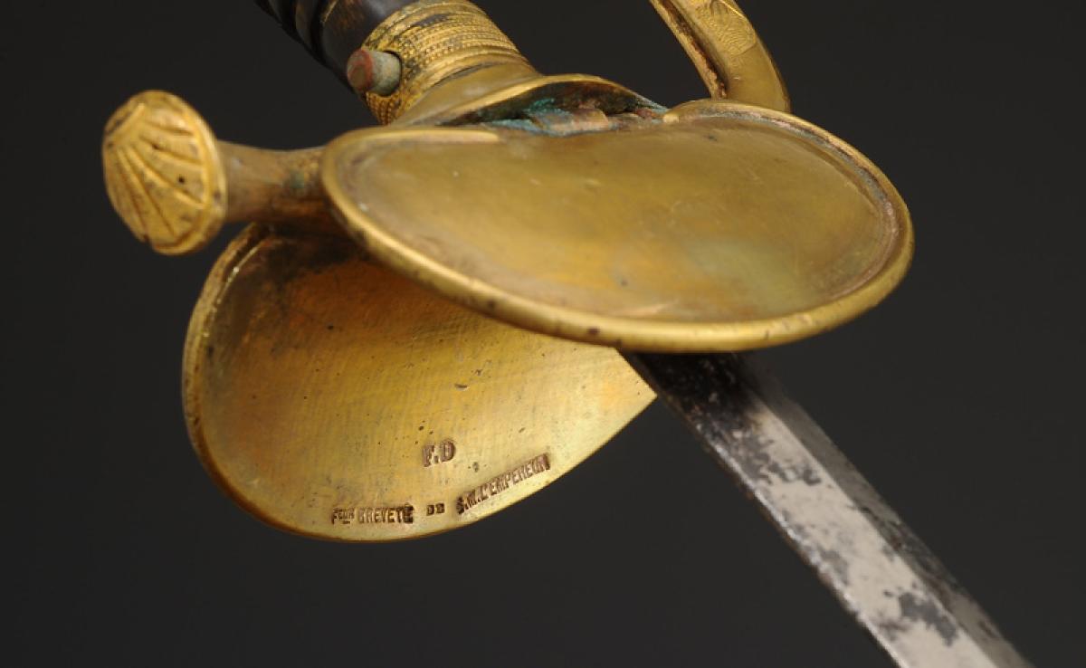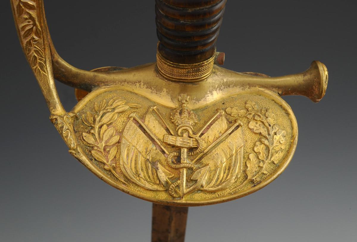 Monture en bronze doré. Garde décorée de branches de chêne et de laurier et coquilles Saint Jacques. Clavier moulé en relief d'une ancre de marine surmontée d'une couronne sur fond de faisceau de drapeaux, le tout encadré d'une branche de chêne et de laurier. Contre-clavier pliant. Pommeau à coquilles Saint Jacques et palmettes. Poignée en corne filigranée de laiton doré. Viroles avec stries obliques. Lame droite à deux pans, longueur 71,5 cm.