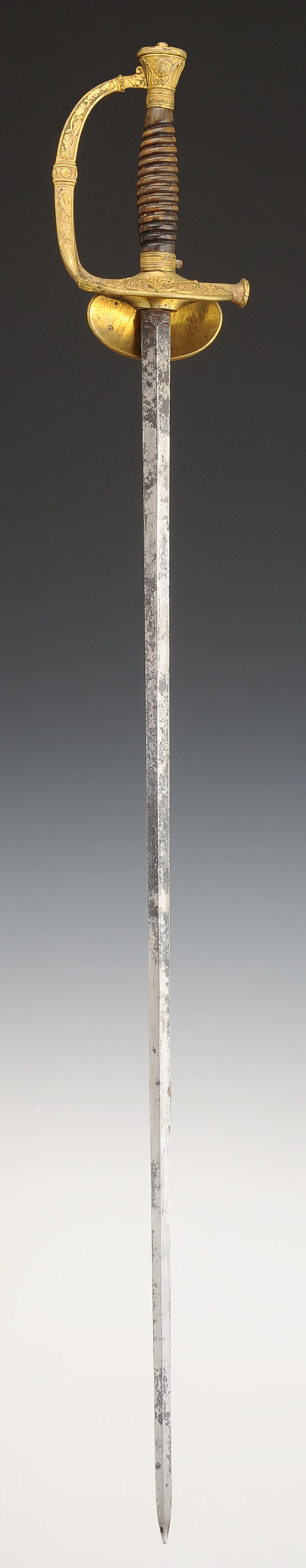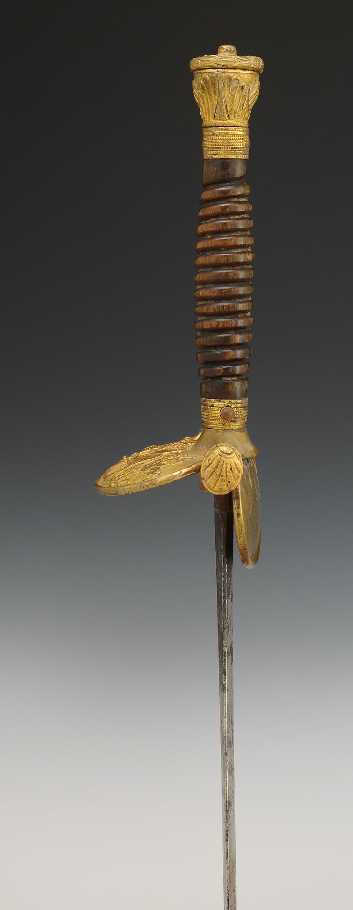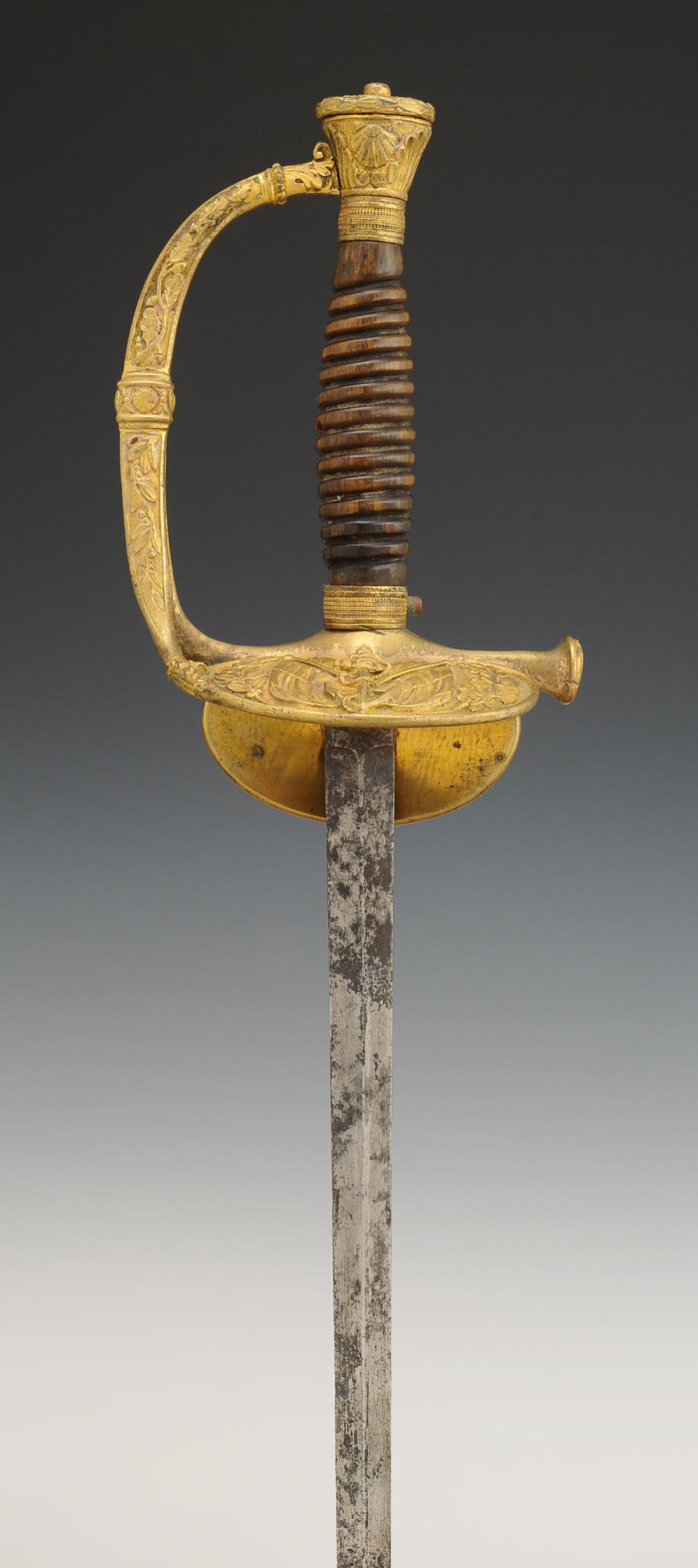 Monture en bronze doré. Garde décorée de branches de chêne et de laurier et coquilles Saint Jacques. Clavier moulé en relief d'une ancre de marine surmontée d'une couronne sur fond de faisceau de drapeaux, le tout encadré d'une branche de chêne et de laurier. Contre-clavier pliant. Pommeau à coquilles Saint Jacques et palmettes. Poignée en corne filigranée de laiton doré. Viroles avec stries obliques. Lame droite à deux pans, longueur 71,5 cm.