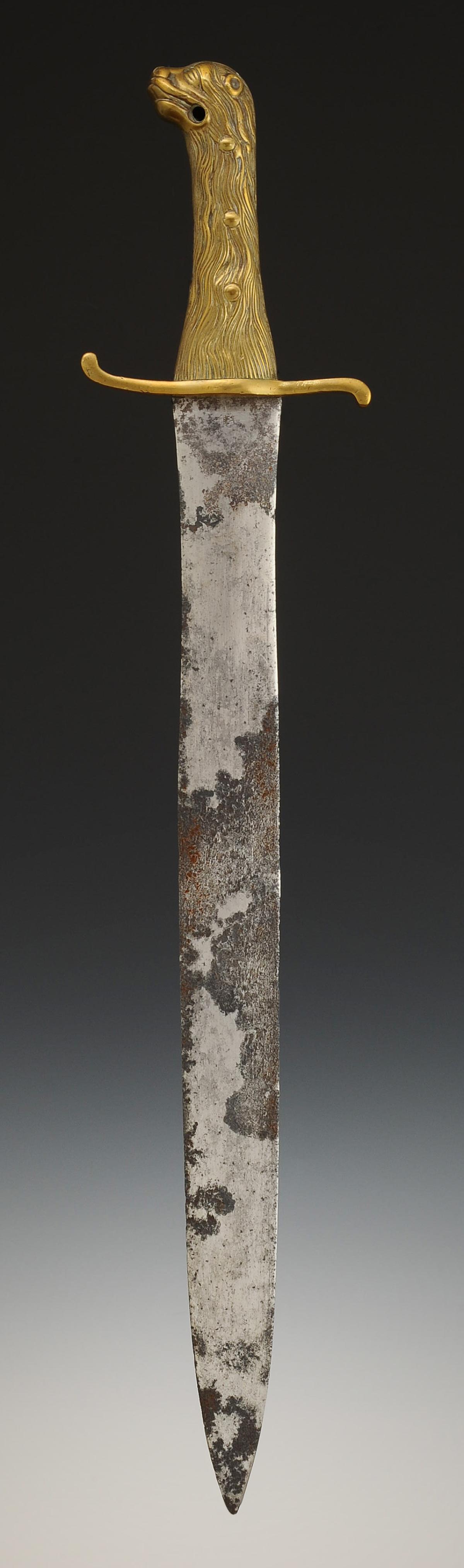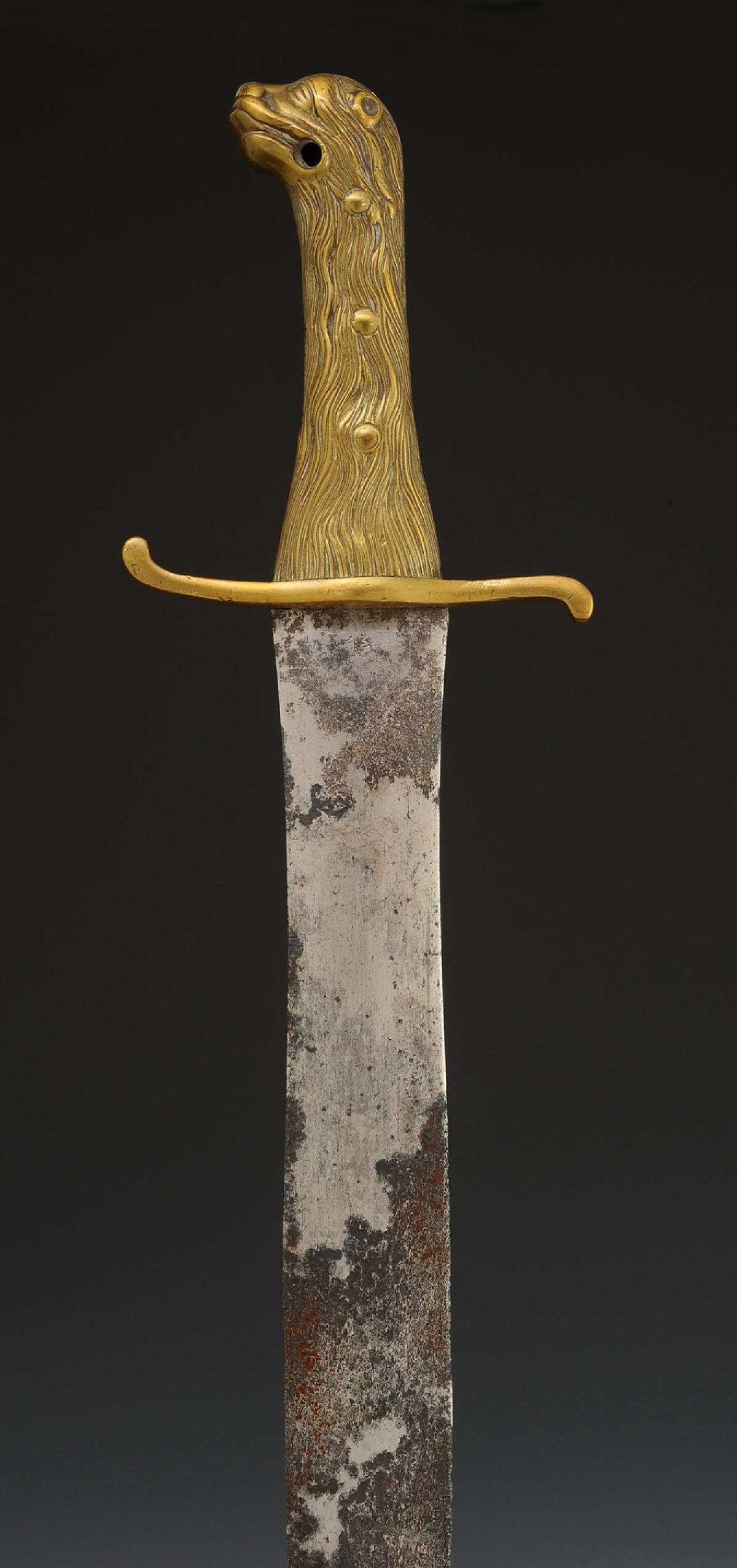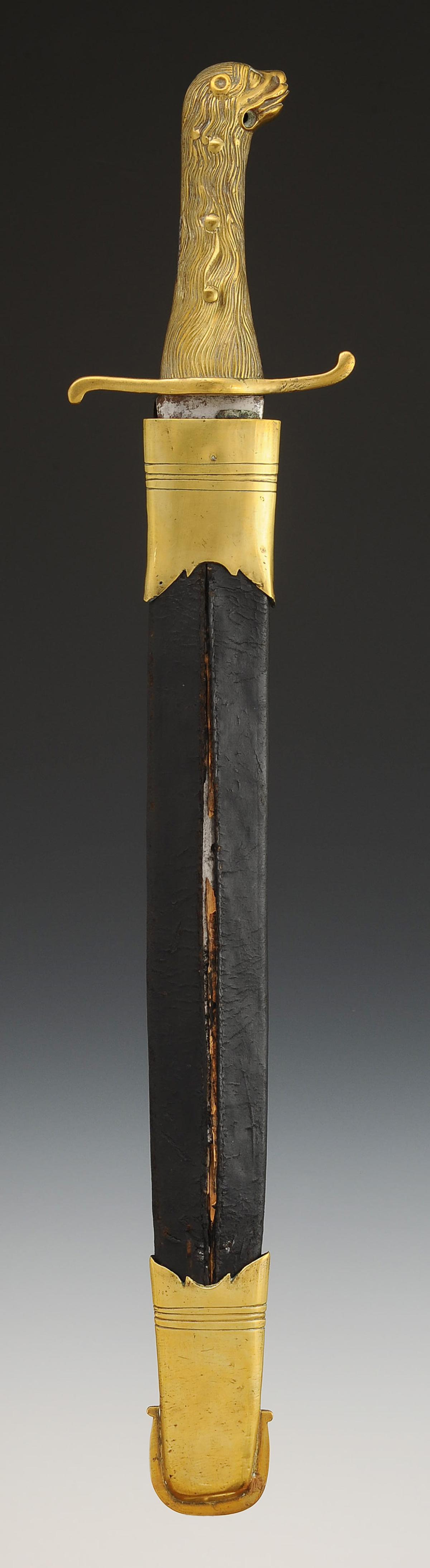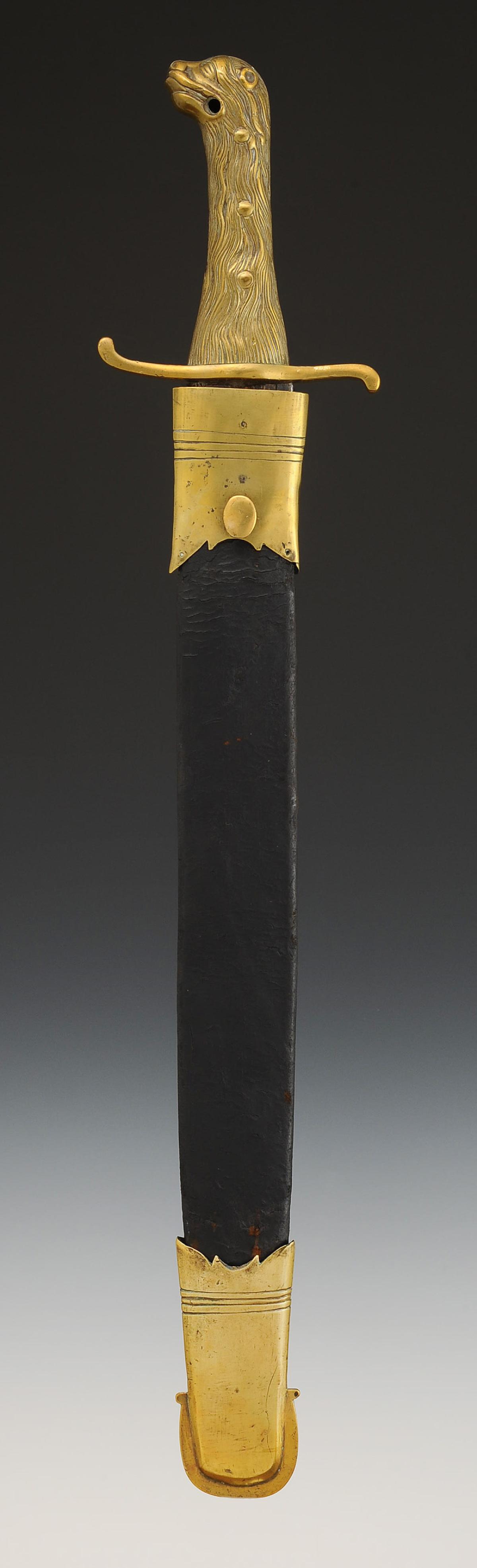 et d’autre de la poignée. Poignée ciselée en forme de tête de lion, perforation transversale dans la gueule du lion permettant le passage du cordon de dragonne. Croisière plate à double quillon inversé. Lame pleine, blanche et plate, longueur 48,3 cm. Fourreau en cuir verni noir à deux garnitures de laiton décorées aux traits et aux bords festonnés avec bouton pour le port au ceinturon.