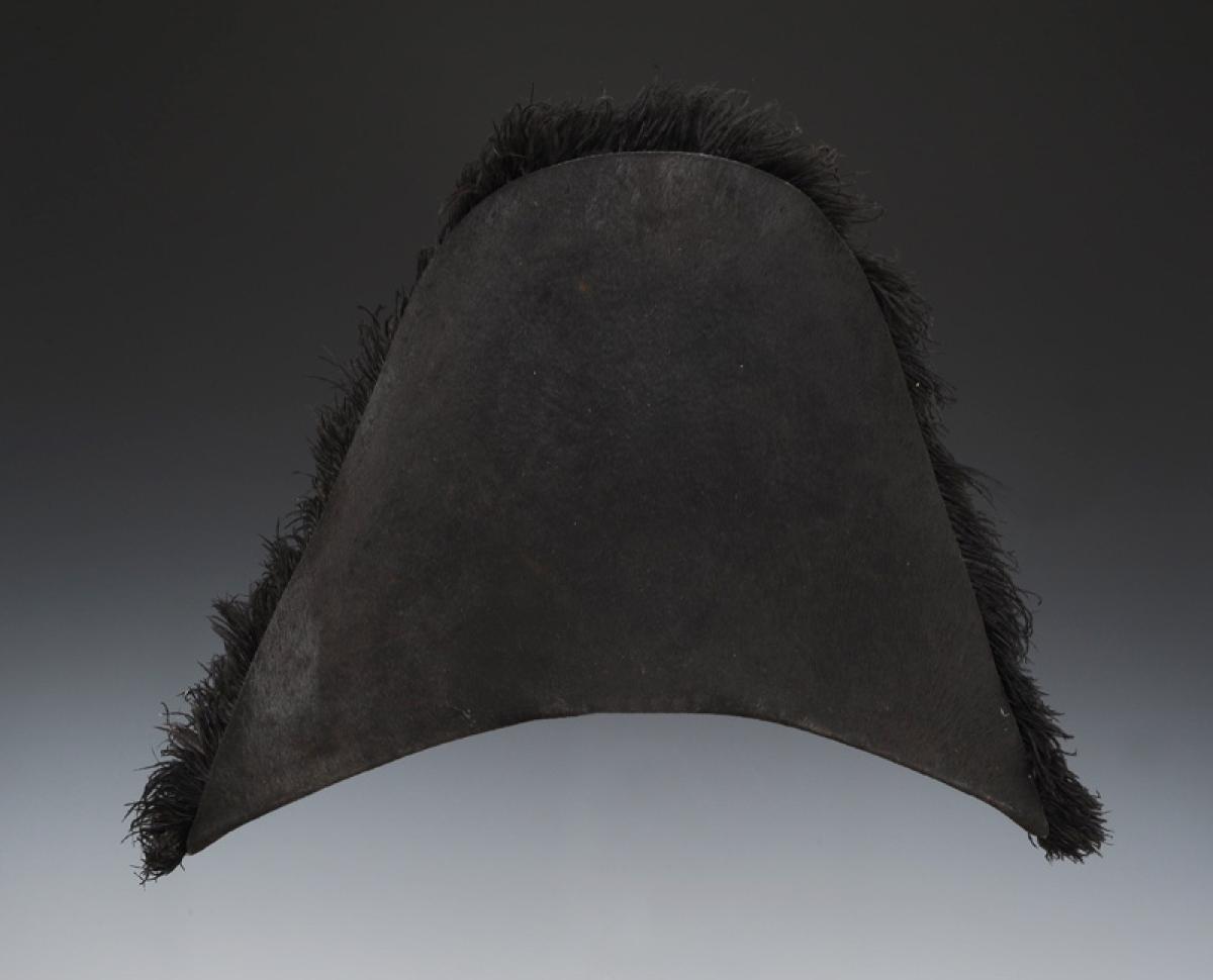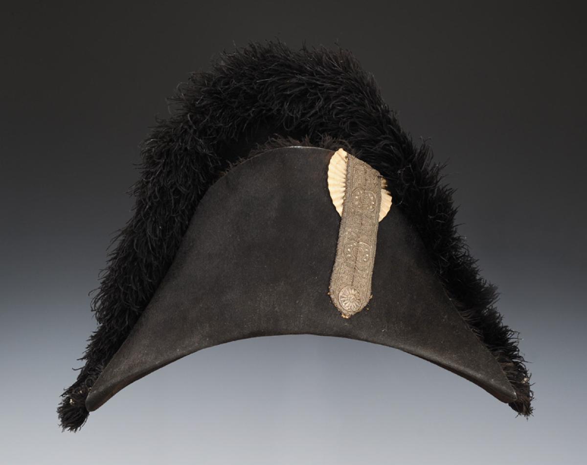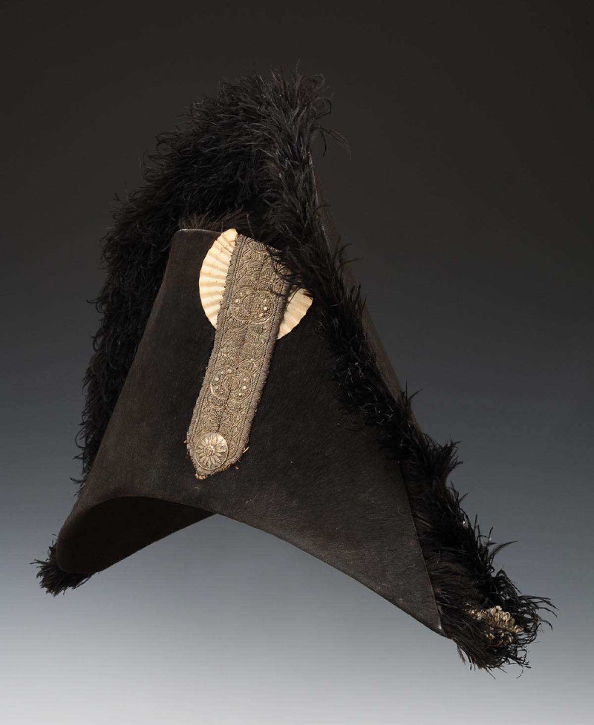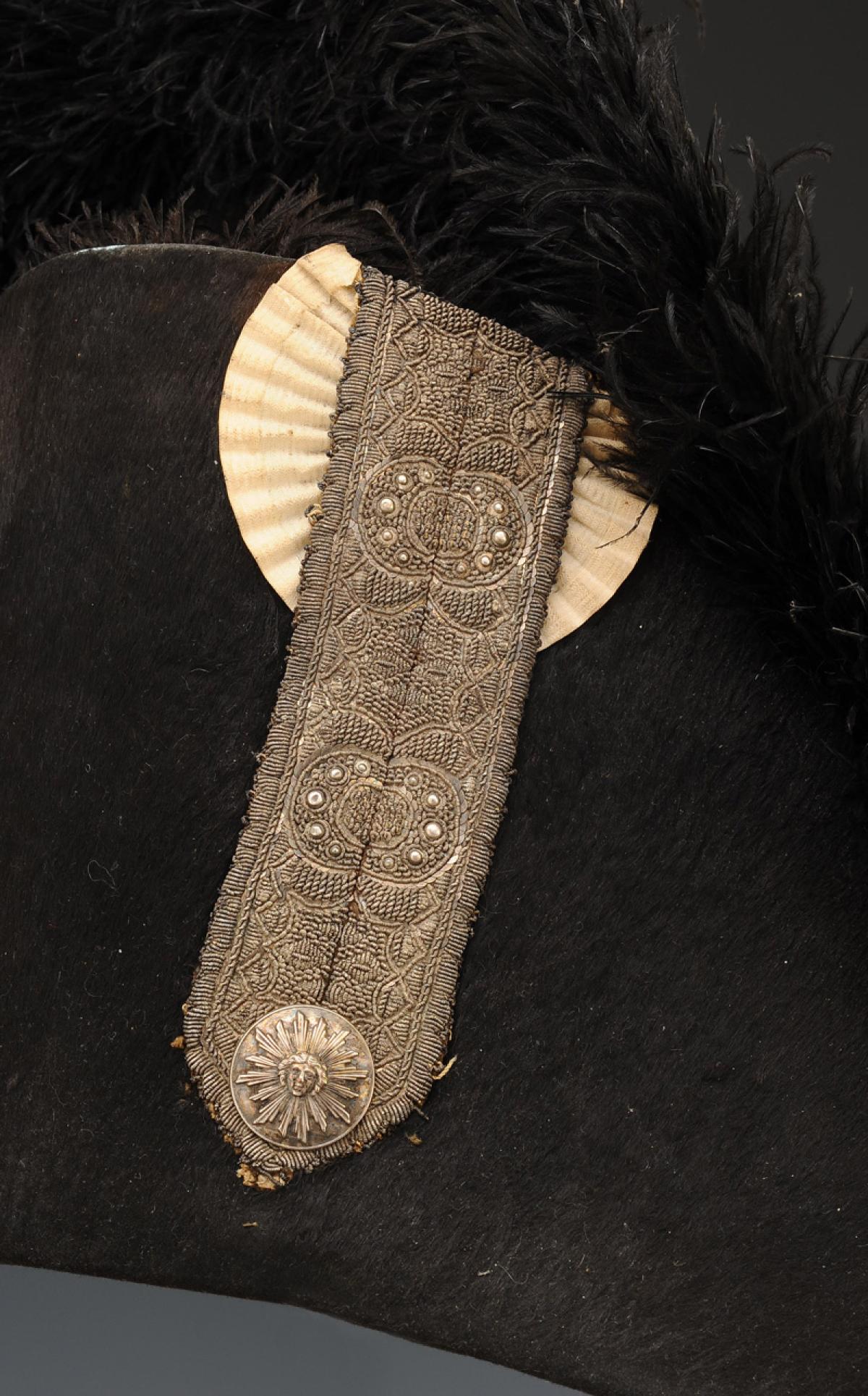 En feutre taupé noir garni sur chacun de ses bords extérieurs de plumes d'autruche. Chaque corne est garnie de floches d'argent à grosses torsades, dites « graines d'épinard ». Cocarde en soie blanche Ø 8 cm. Ganse en passementerie de fils, cannetilles et sequins d'argent, H 15,7 cm, largeur 4,2 cm, entièrement brodée au motif du galon du corps de l'uniforme, retenue en partie basse par un bouton d'uniforme en argent estampé du visage du soleil sur fond rayonnant, Ø 2,5 cm.
