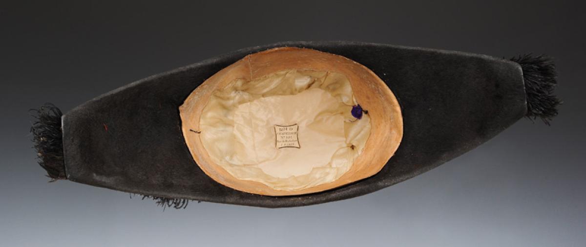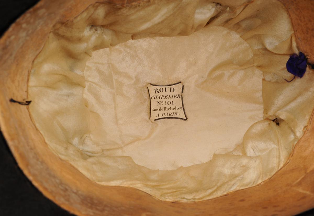 Coiffe intérieure composée d'un bandeau en veau ocre de 7 cm de haut et d'une coiffe en soie ivoire avec dans le fond une étiquette de papier imprimée en noir « ROUD CHAPELIER N° 101 Rue de Richelieu A PARIS. ».