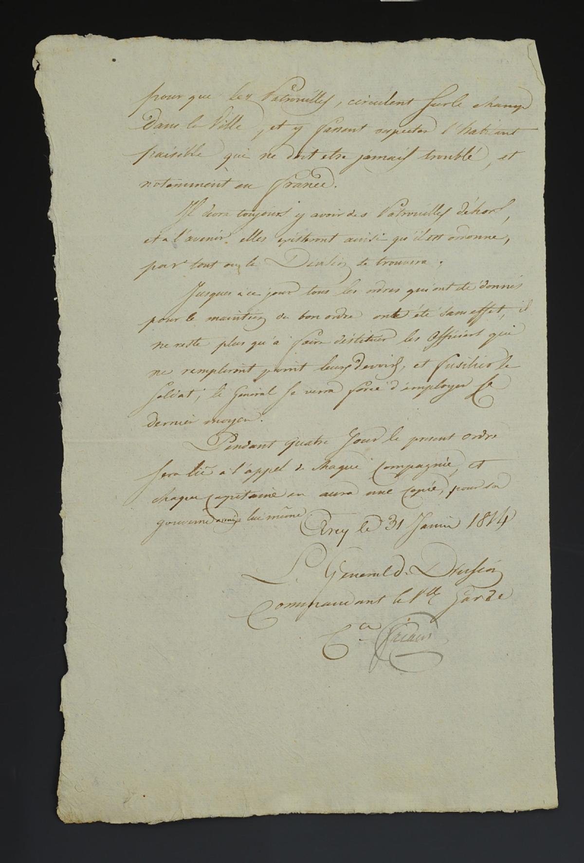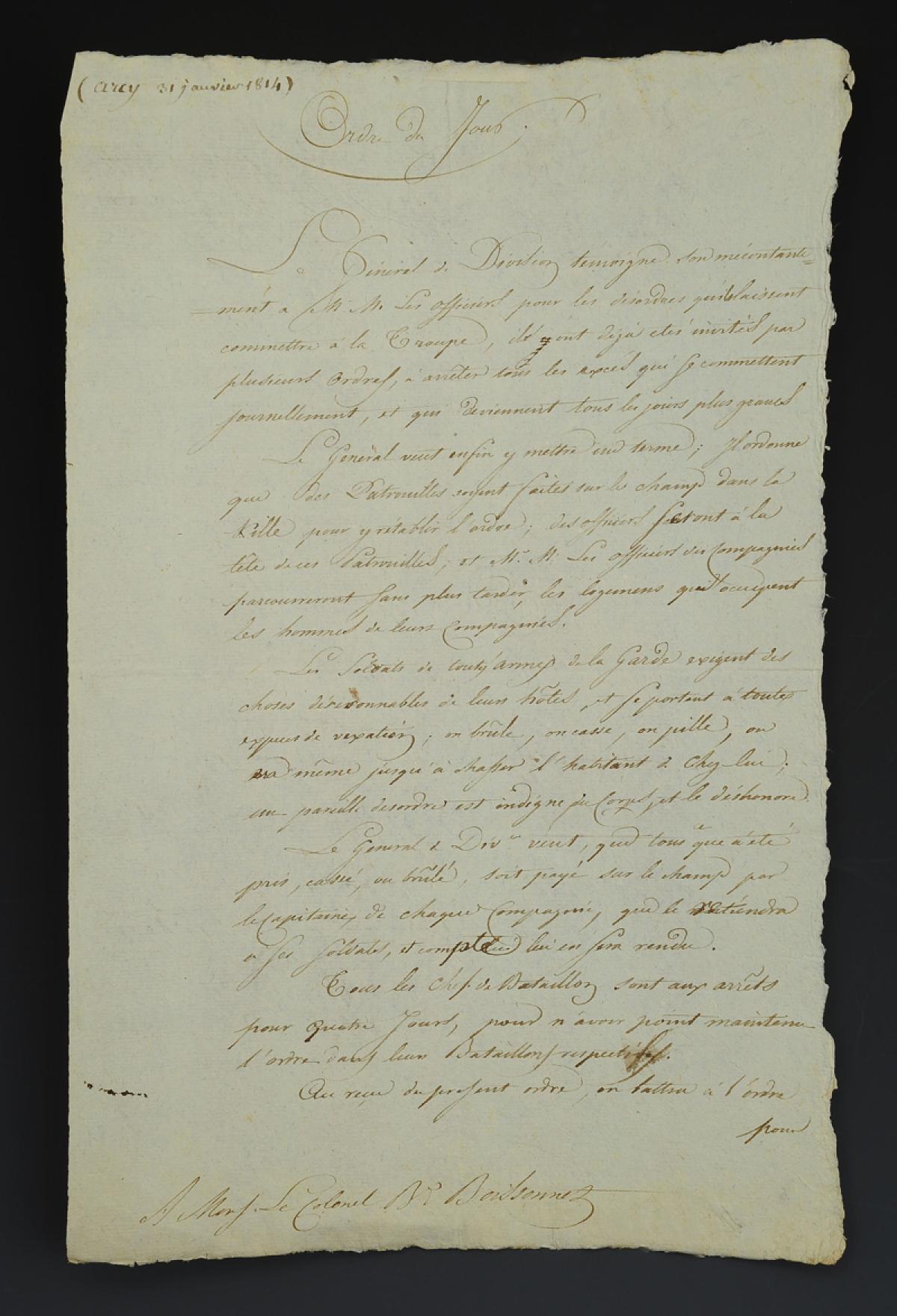 « ... Le Général témoigne son mécontentement à MM. Les officiers pour les désordres qu'ils laissent commettre à la Troupe, ils ont déjà été invités par plusieurs ordres à arrêter tous les excès qui se commettent journellement, et qui deviennent tous les jours plus grands. Le Général veut enfin y mettre un terme ; il ordonne que des patrouilles soient faites sur le champ pour y rétablir l'ordre ; des officiers seront à la tête de ces patrouilles [...]
