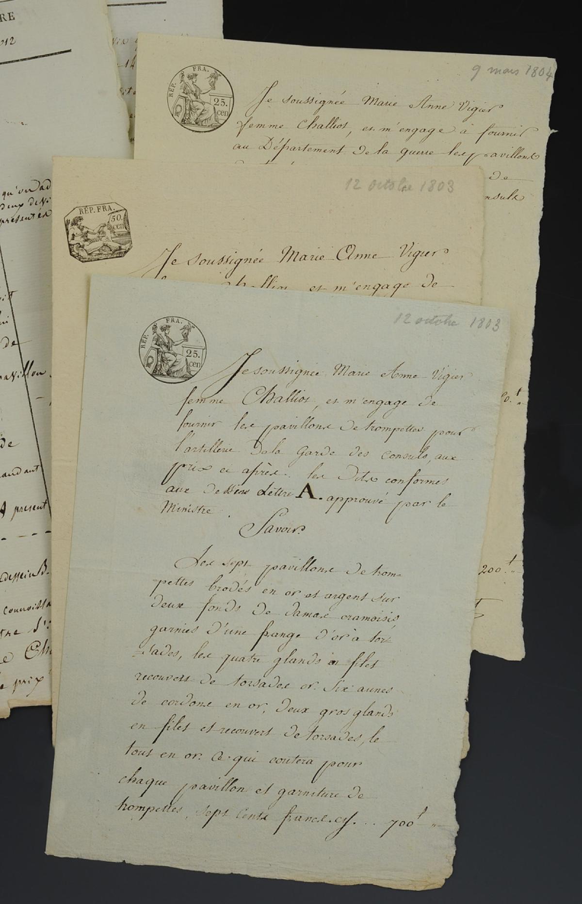 Garde des Consuls. ARTILLERIE. Ensemble de trois devis signés Marie-Anne VIGNIER FEMME CHAILLOT, pour la réalisation de pavillons de trompettes pour l'artillerie de la Garde des Consuls, 19 Vendemiaire et 19 Germinal an 12, Minute du chef de la 2è division adressée à Mme Vignier jugeant ses tarifs trop élevés (9 vendemiaire an 12) et son rapport fait au Ministre le 30 germinal an 12 l'informant des devis revus. 18907-6
