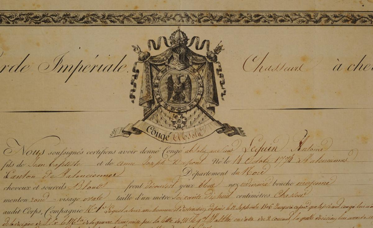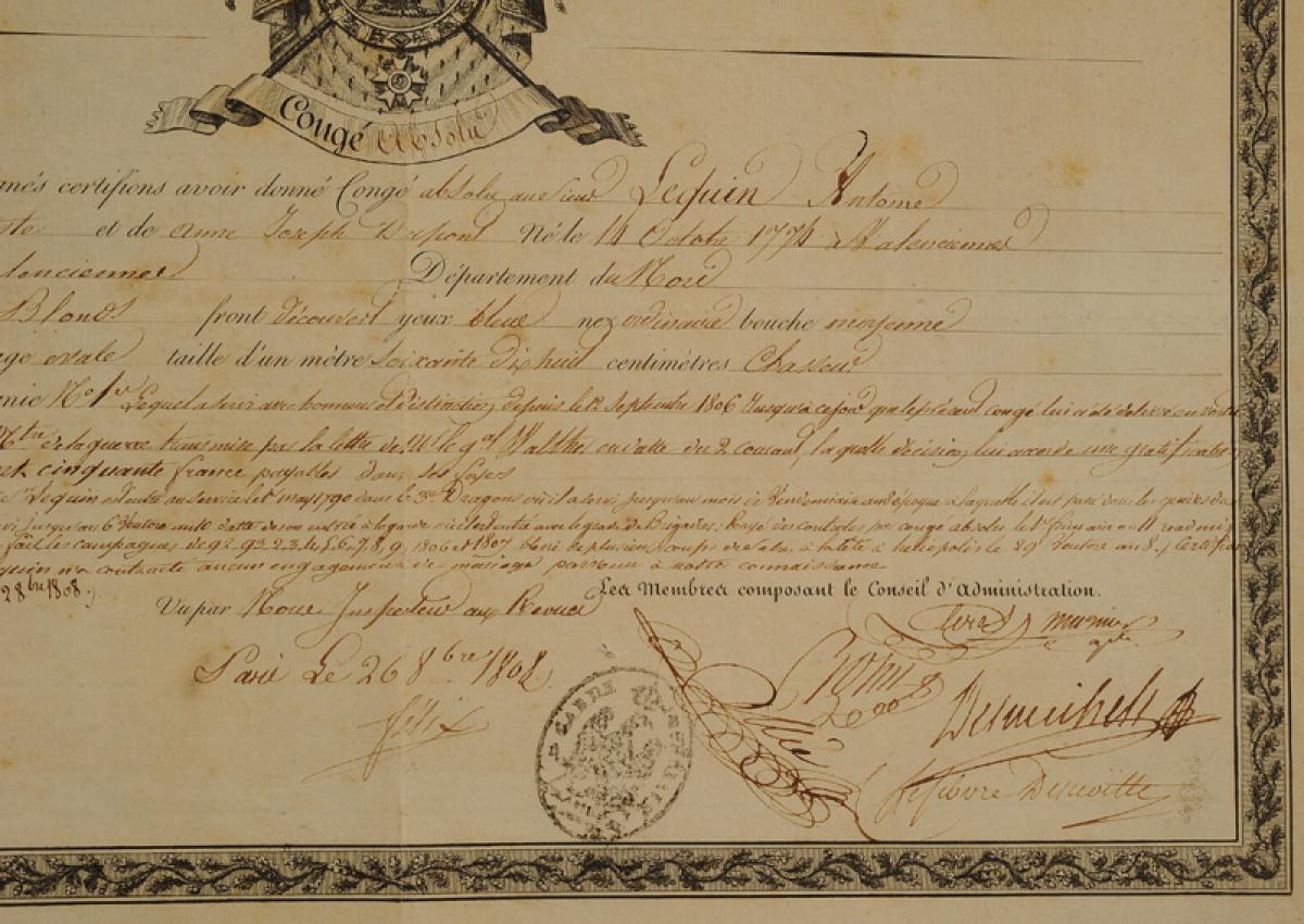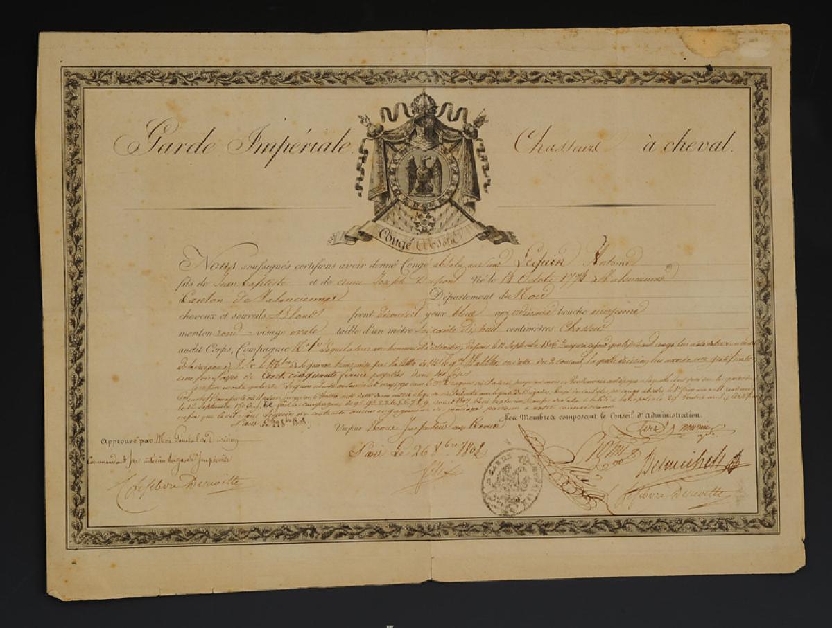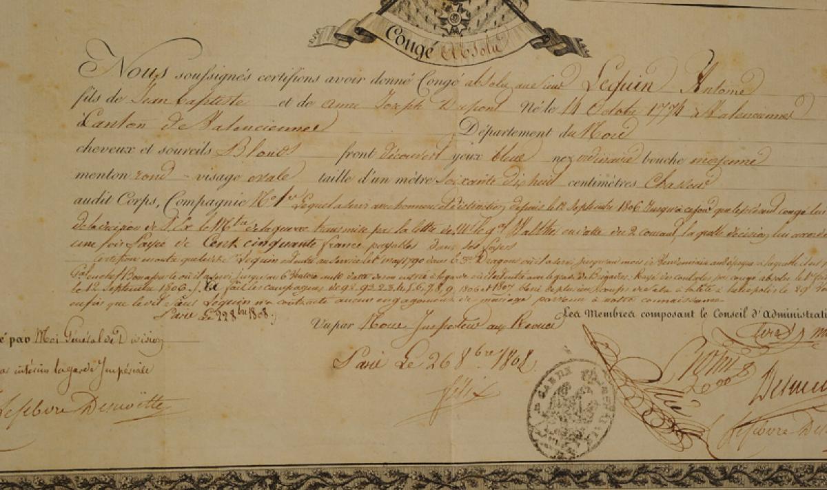 Garde Impériale. CONGÉ ABSOLU DONNÉ AU CHASSEUR À CHEVAL ANTOINE LEQUIN le 26 octobre 1808. 18907-7