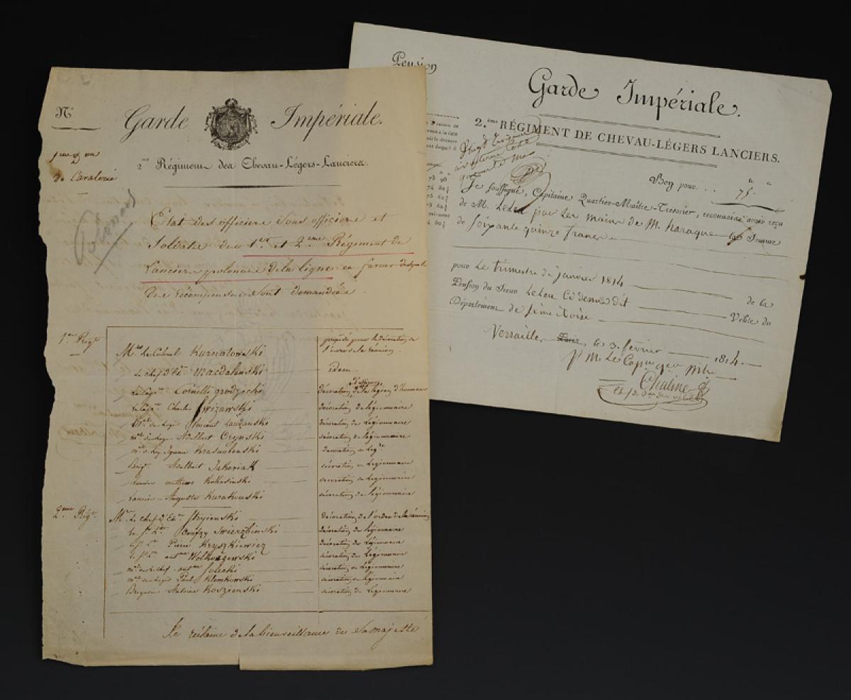 Garde Impériale. CHEVAU-LÉGERS LANCIERS. Deux documents : Bon de réception de 75 francs pour la pension du Sieur LELEU, Vélite, pour le trimestre de janvier 1814, 3 février 1814 ; État des officiers, sous-officiers et soldats des 1er et 2ème régiment de Lanciers Polonais de la Ligne en faveur desquels des récompenses ont été demandées, 1er avril 1814. 18907-15
