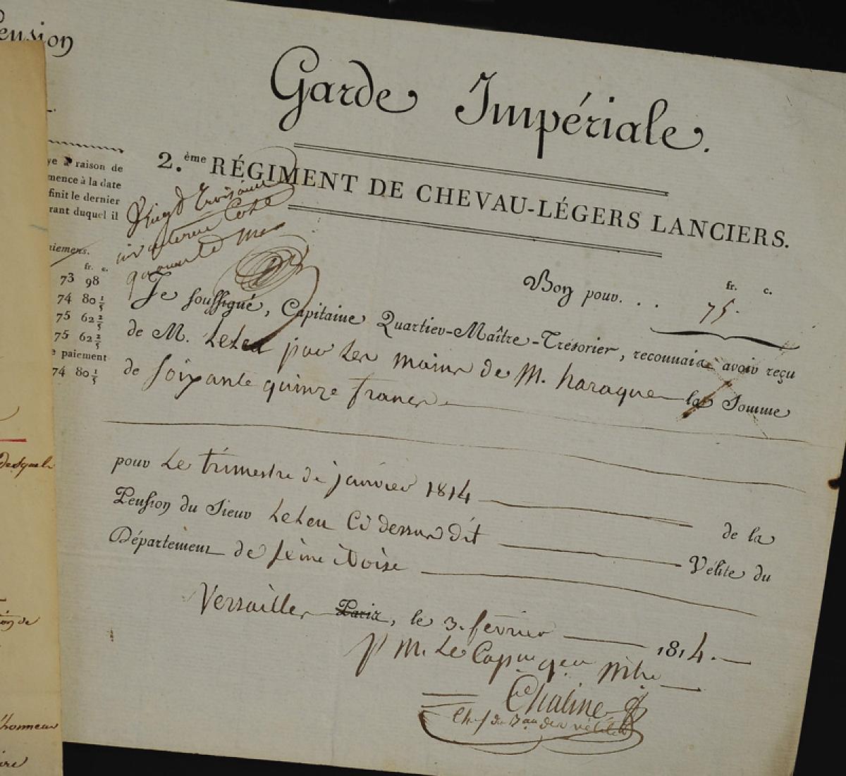 1 - Entête « Pension des Vélites / GARDE IMPÉRIALE / 2ème RÉGIMENT DE CHEVAU-LÉGERS LANCIERS. Bon de 75 francs pour la pension du Sieur LELEU Vélite du département de Seine et Oise. « Je soussigné, Capitaine Quartier-Maître-Trésorier avoir reçu de M. Leleu par les mains de M. Haragne la somme de soixante quinze francs pour le trimestre de janvier 1814 de la pension du Sieur Leleu ci-dessus dit, Vélite du Département de Seine-et-Oise. Versailles le 3 février 1814. »