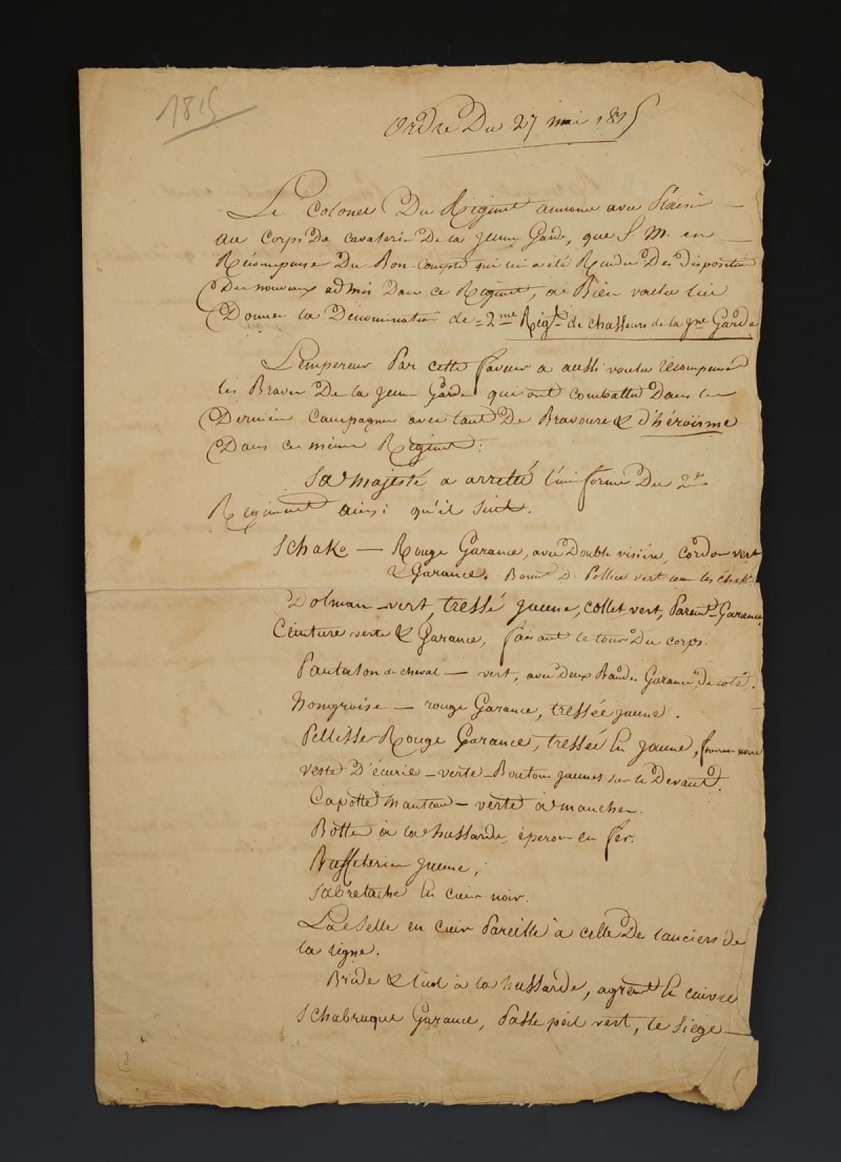 « Le Colonel du Régiment annonce avec plaisir au Corps de Cavalerie de la Jeune Garde, que S.M. en récompense du bon compte qui lui a été rendu, des disposition des nouveaux admis dans ce Régiment, et bien vouloir lui donner la dénomination de : 2me Régt de Chasseurs de la Jne Garde.