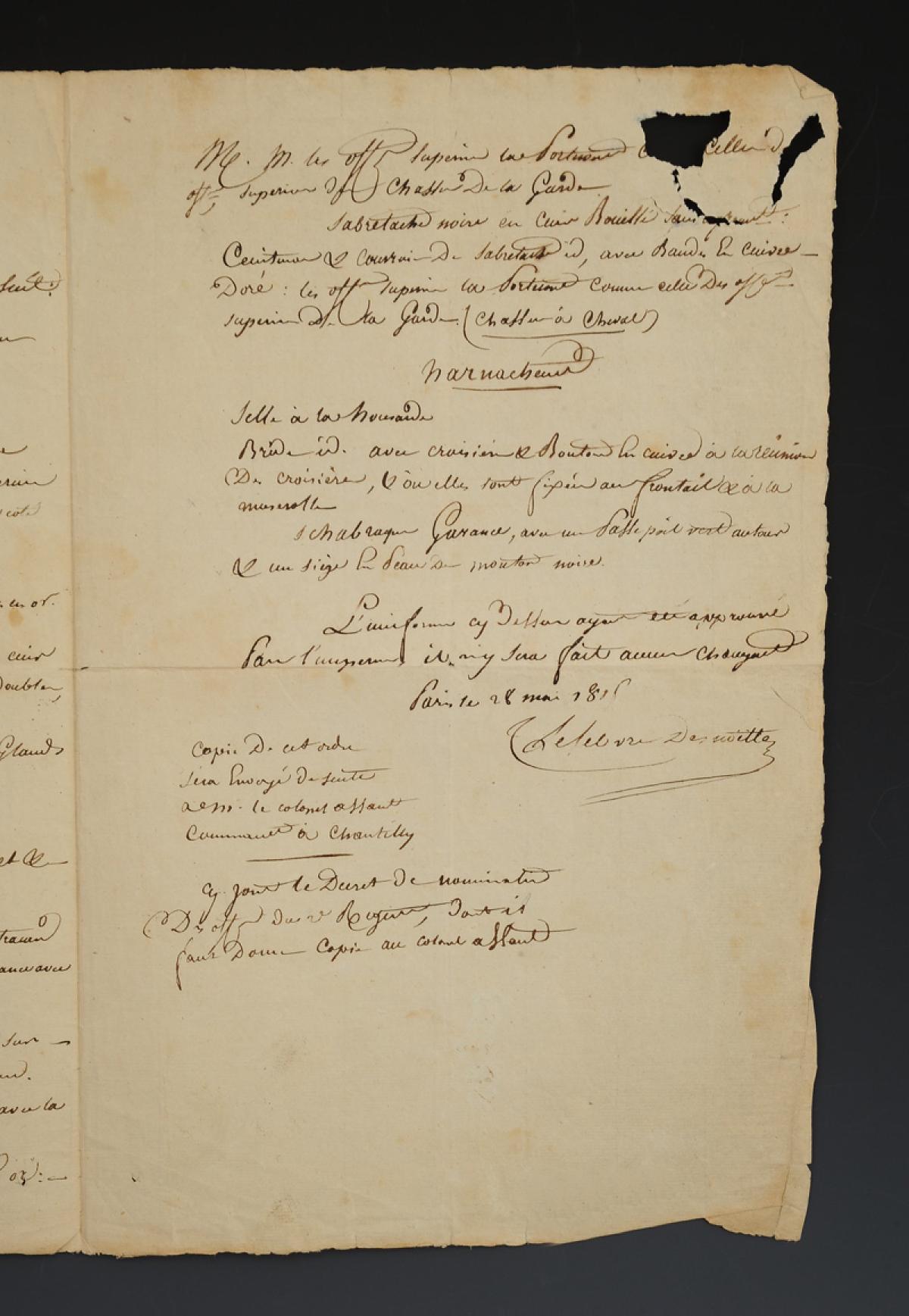 Note manuscrite en fin de texte : « Copie de cet ordre sera envoyé de suite à M. le colonel Assant, commandant à Chantilly ».
