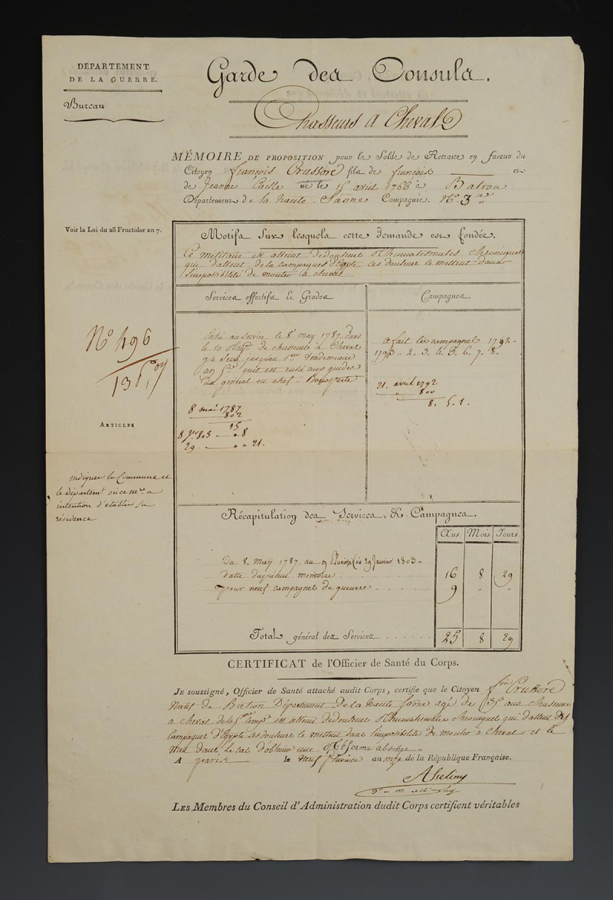 - Motif sur lequel cette demande est fondée : « Ce militaire est atteint de douleurs rhumatismales chroniques qui datent de la campagne d'Egypte. Ces douleurs le mettent dans l'impossibilité de monter à cheval ».
