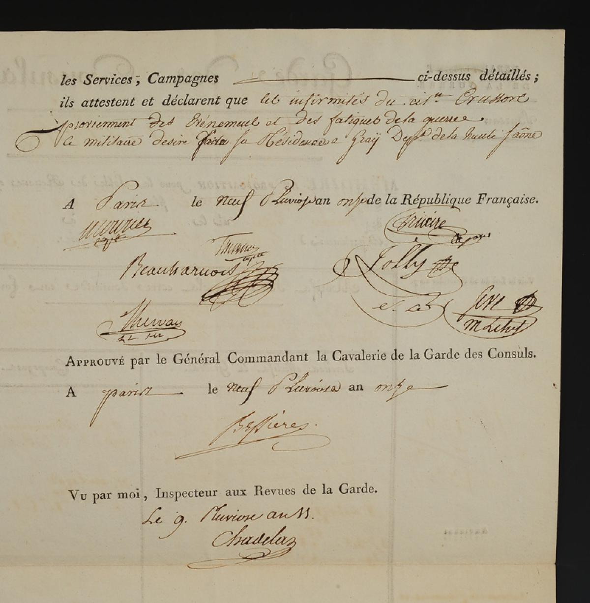 En dernière page, signatures des membres du Conseil d'administration dudit Corps, du Général commandant la Cavalerie de la Garde des Consuls Bessières, et de l'Inspecteur aux Revues de la Garde.