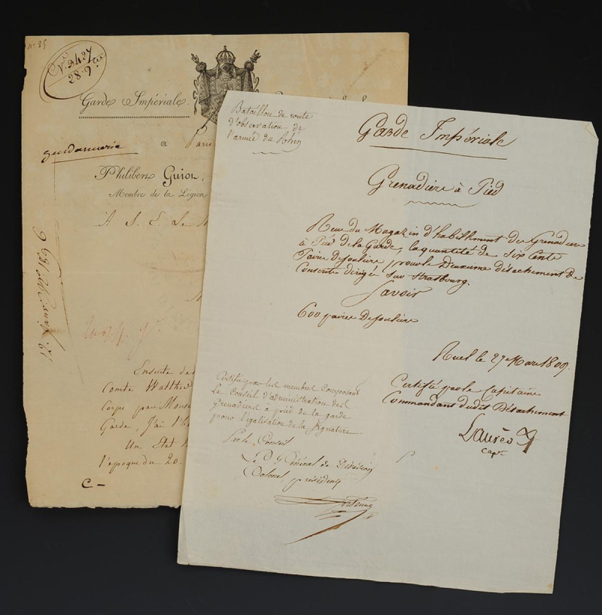Garde Impériale. Lot de deux lettres datées 1809 : un accusé réception d'habillement à entête des GRENADIERS À PIED, une lettre d'accompagnement d'un envoi nominatif des CHASSEURS À CHEVAL. 18907-24