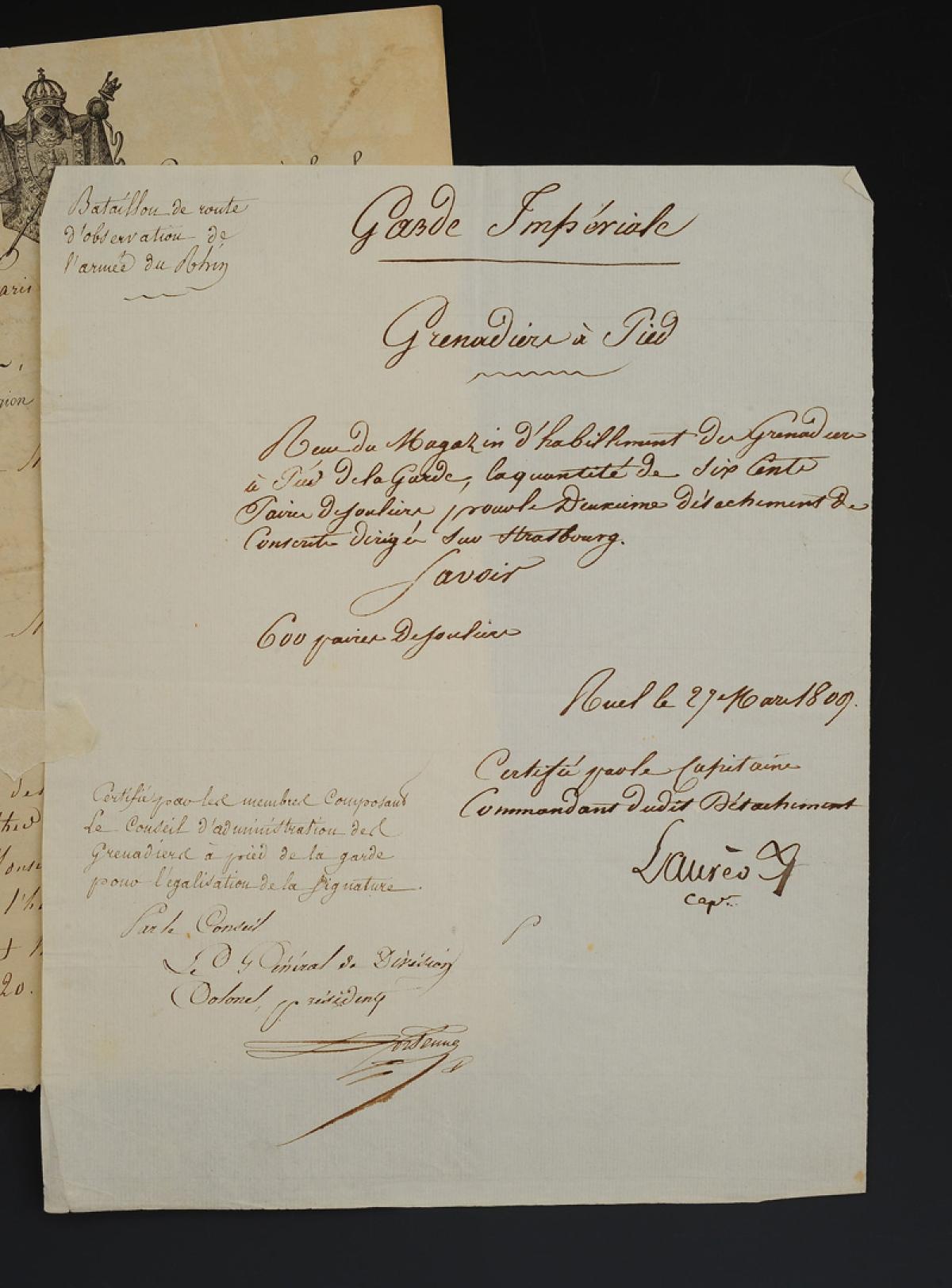 « Reçu du Magazin d'habillement des Grenadiers à Pied de la Garde, la quantité de six cents paires de souliers pour le 2ème détachement des conscrits dirigés sur Strasbourg.